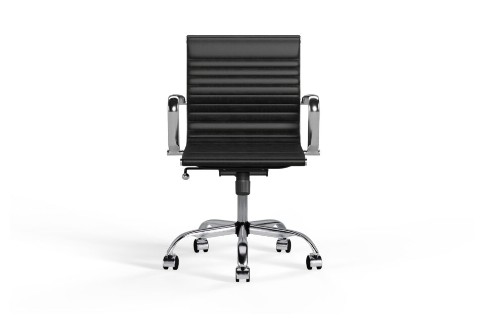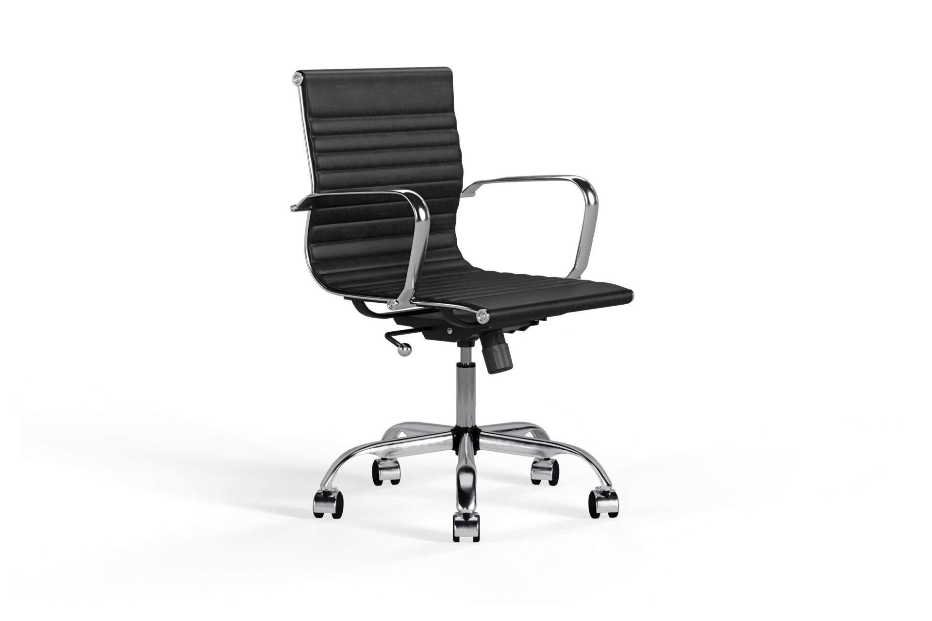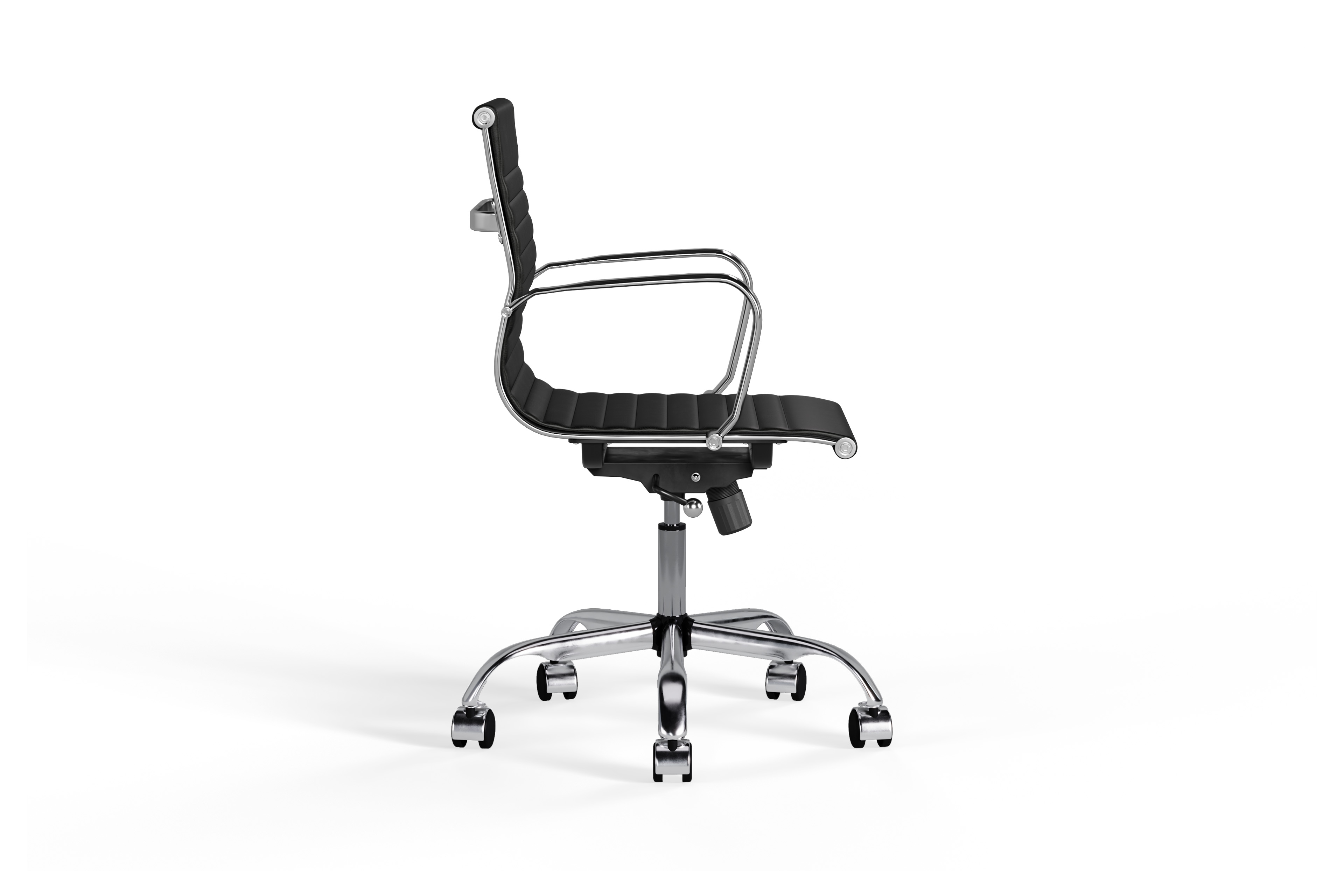 Find your flow in effortless comfort with this elegant black vegan leather office chair. The ribbed medium backrest embraces you with ergonomic support, inviting creativity hour after hour. Its smooth swivel, silent caster wheels, and adjustable height keep movement fluid and focus uninterrupted. Supported by a sleek chrome-finish base, it blends luxury with purpose — turning everyday work into a calm, inspired, and deeply productive experience. -