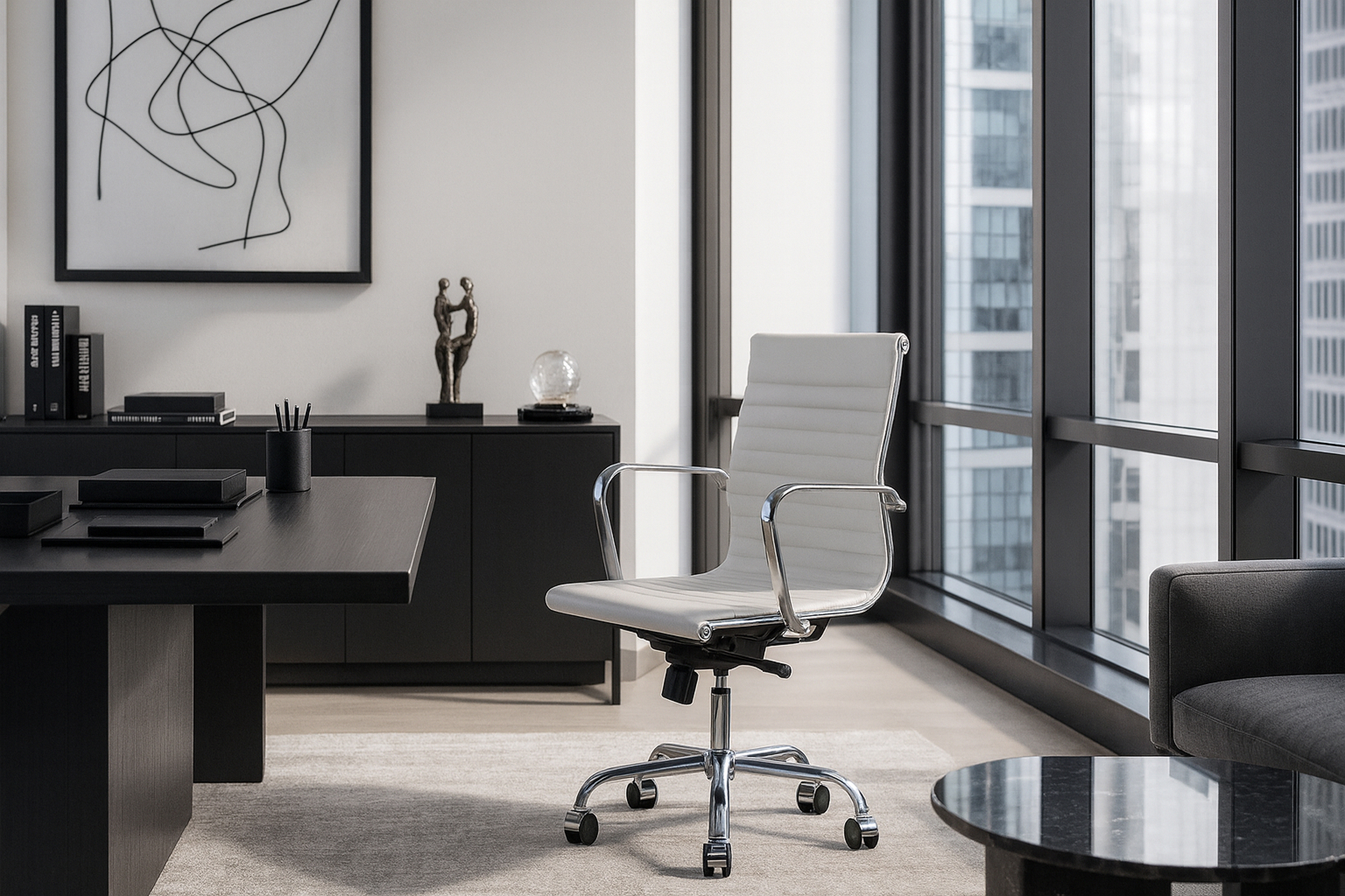 Inspired by the sophistication of classic executive seating, our Office Chair redefines modern elegance with a streamlined mid-century silhouette. Its polished chrome accents and ergonomic design balance timeless style with everyday functionality — bringing comfort, poise, and effortless refinement to the contemporary workspace.