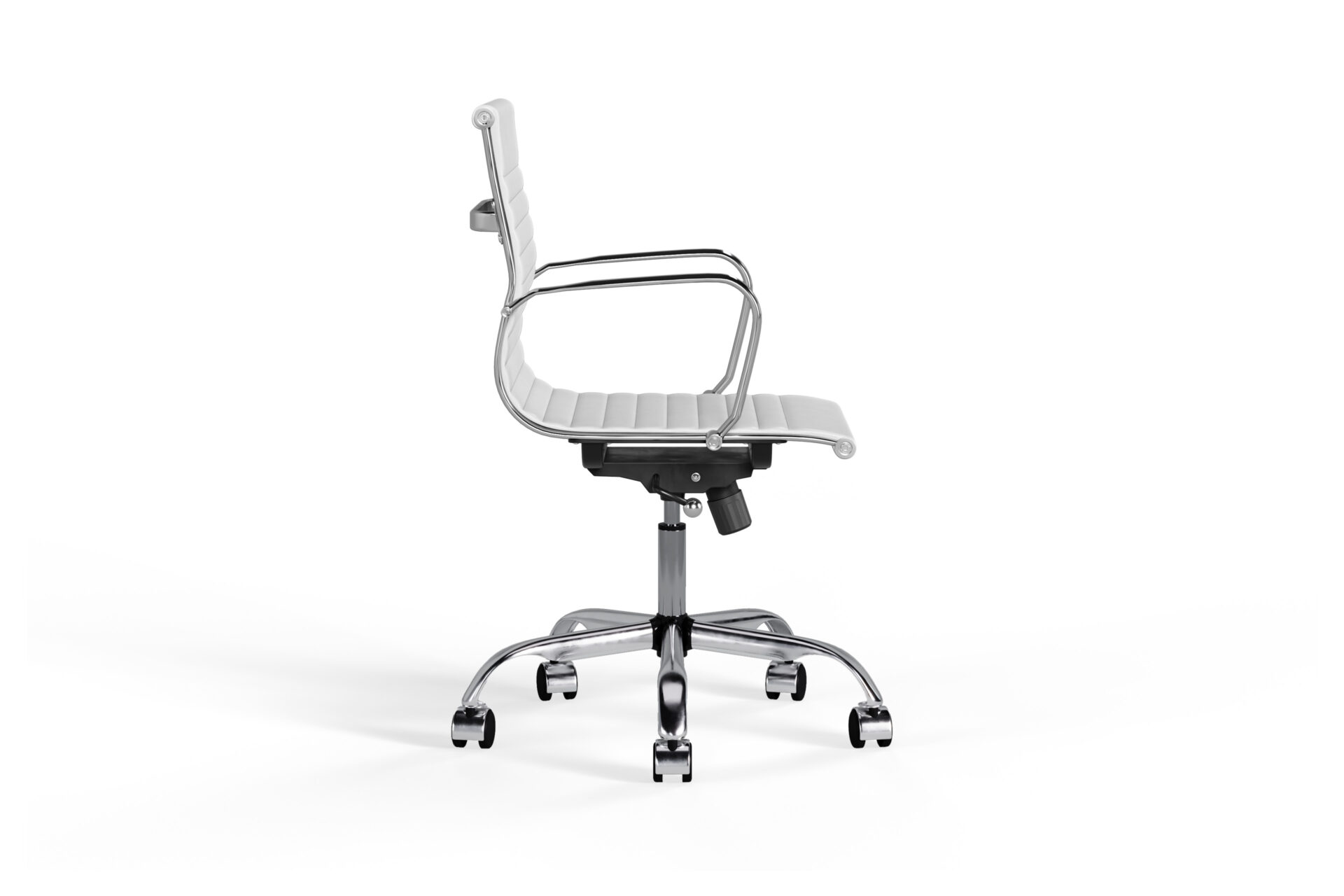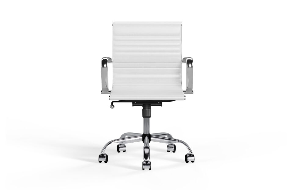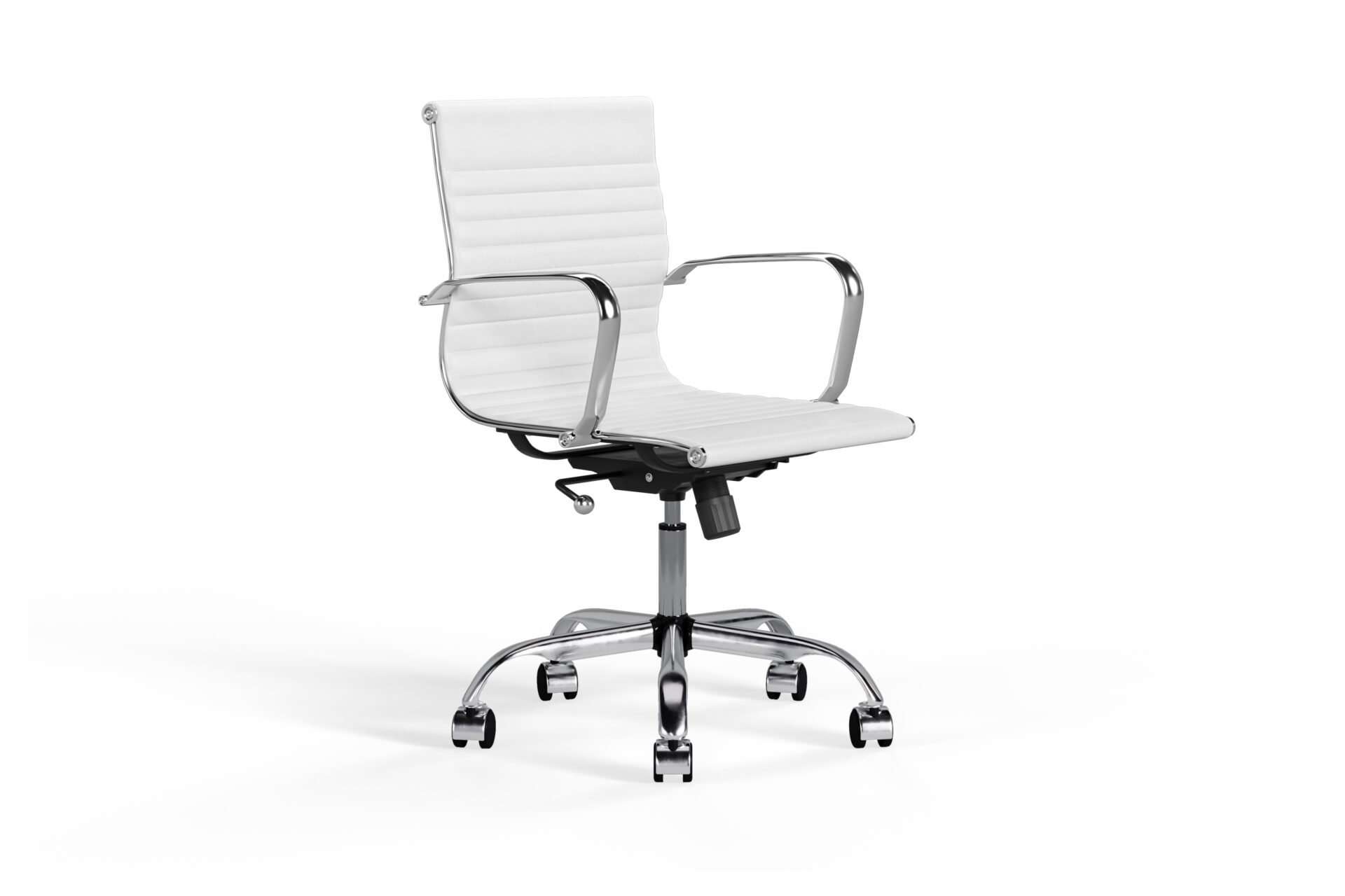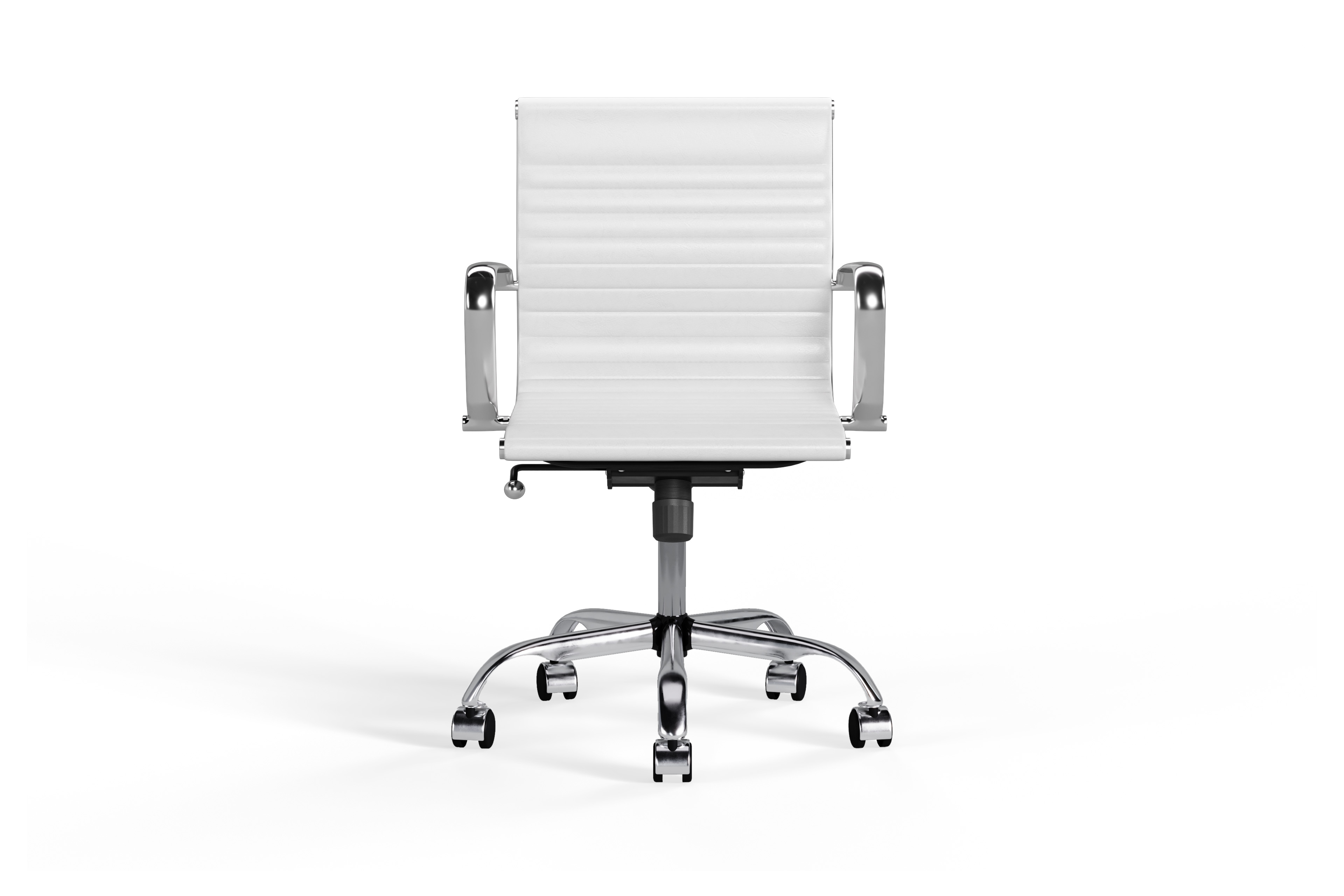 Bring light and inspiration to your workspace with this luminous white vegan leather office chair. The ribbed medium backrest and smooth swivel motion encourage fluid movement, while silent caster wheels and a chrome-finish base add modern radiance. Adjustable and perfectly supportive, it invites focus and creativity to unfold naturally. Elegant yet functional, it’s a statement piece that elevates both productivity and aesthetic harmony in any setting. -