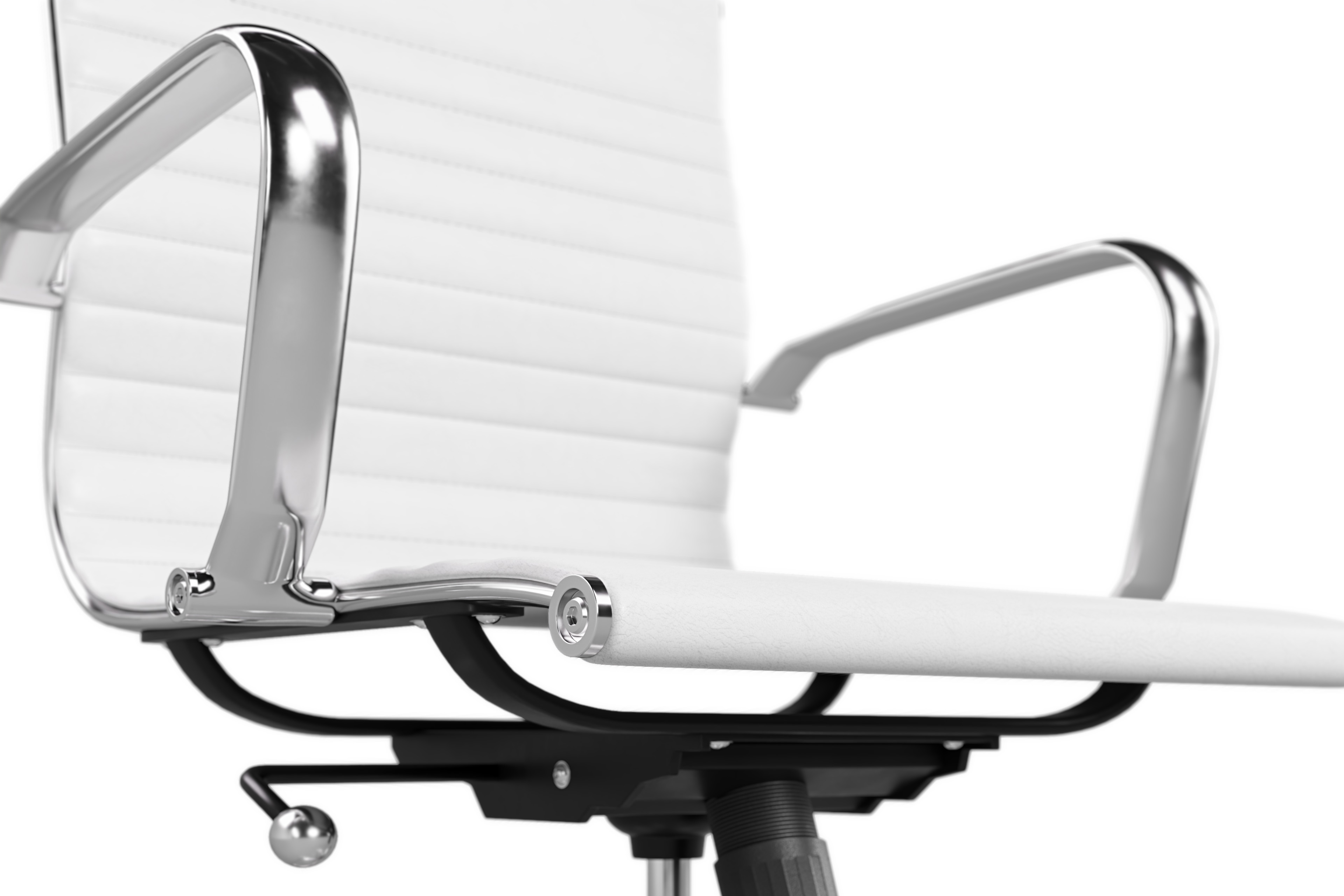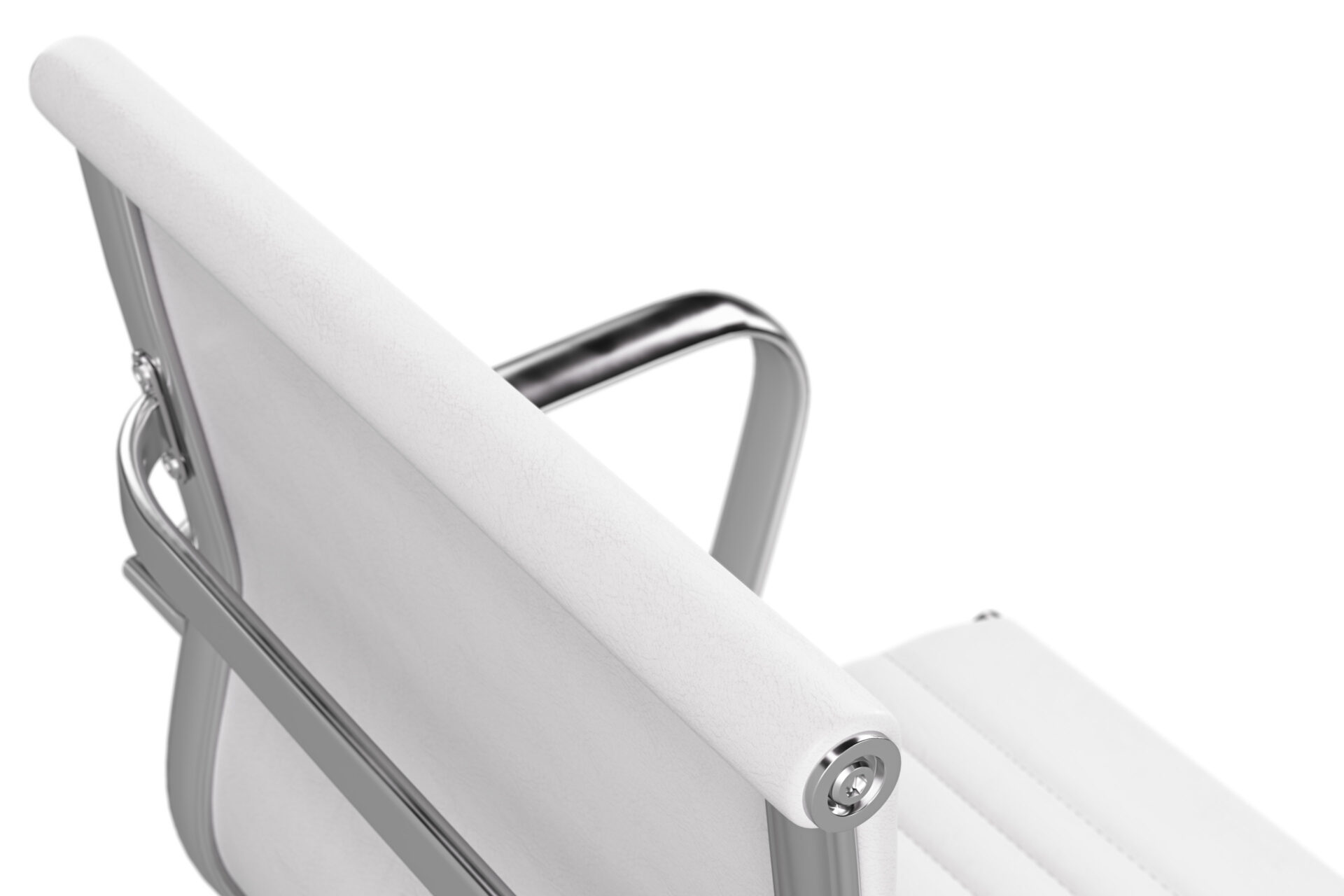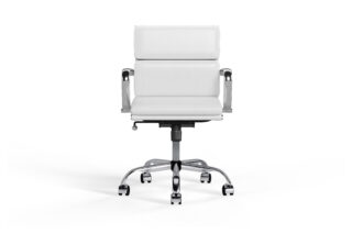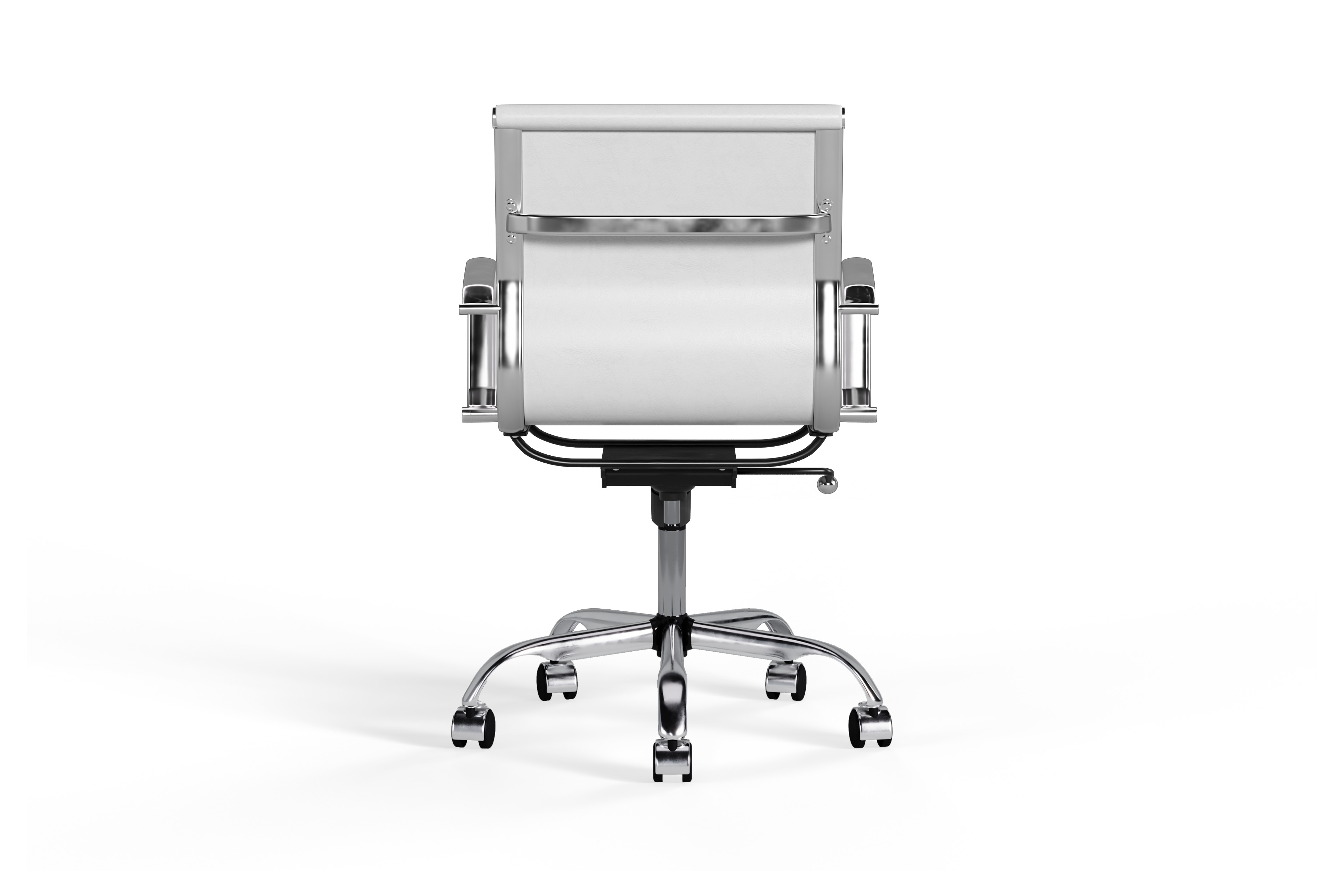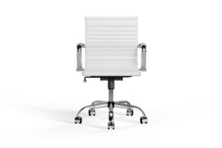 Bring light and inspiration to your workspace with this luminous white vegan leather office chair. The ribbed medium backrest and smooth swivel motion encourage fluid movement, while silent caster wheels and a chrome-finish base add modern radiance. Adjustable and perfectly supportive, it invites focus and creativity to unfold naturally. Elegant yet functional, it’s a statement piece that elevates both productivity and aesthetic harmony in any setting. -