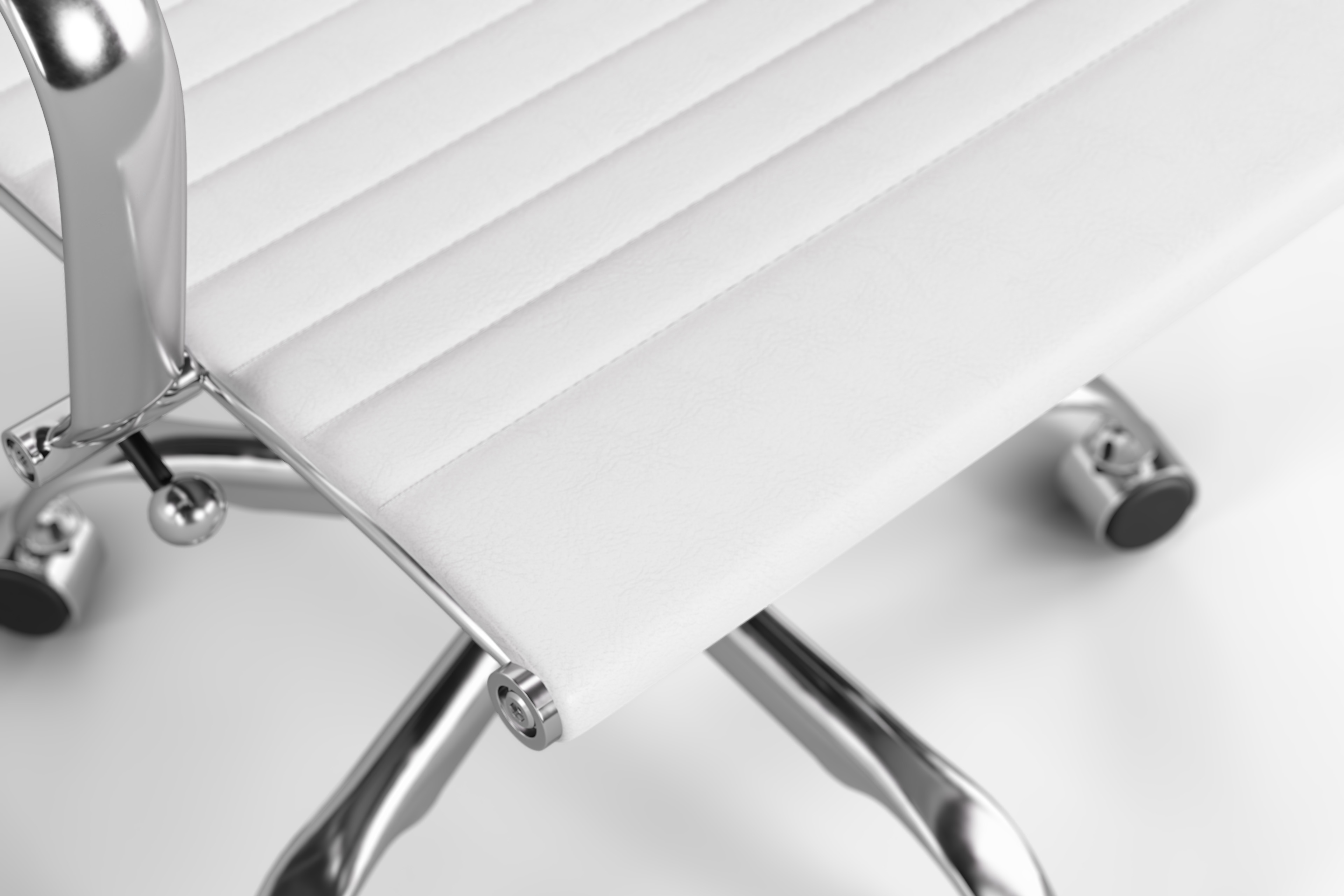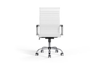 Bright and contemporary, this white ribbed office chair enhances clarity and flow. Its silent wheels, smooth swivel, and adjustable chrome base ensure effortless mobility, while the supportive design encourages comfort through long hours. A statement of light, poise, and productivity for modern creative spaces.