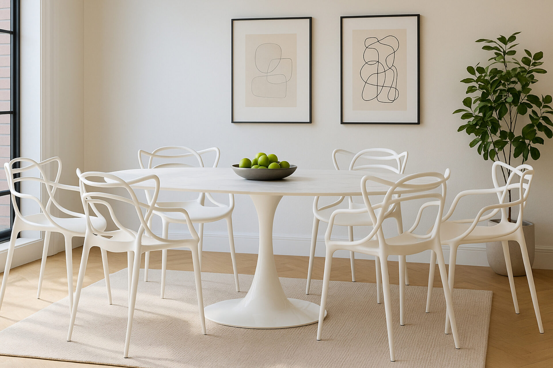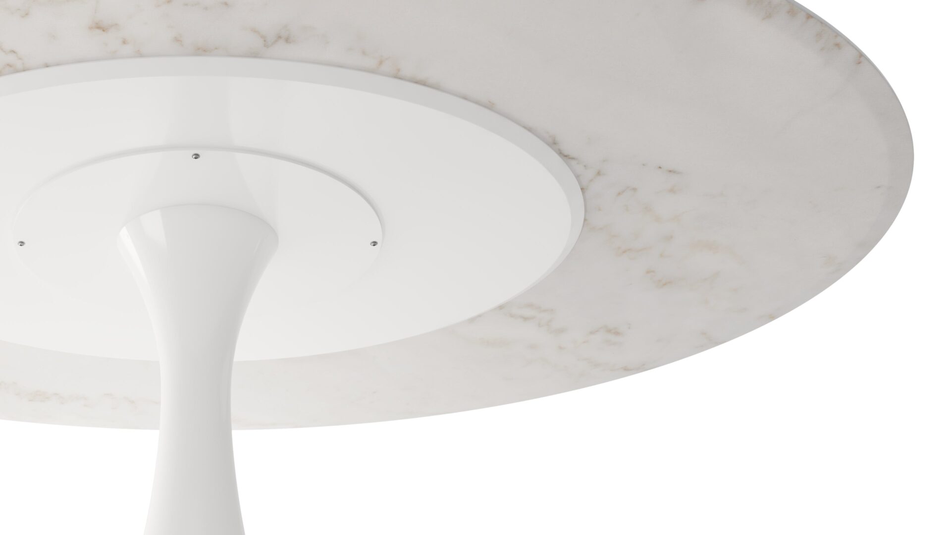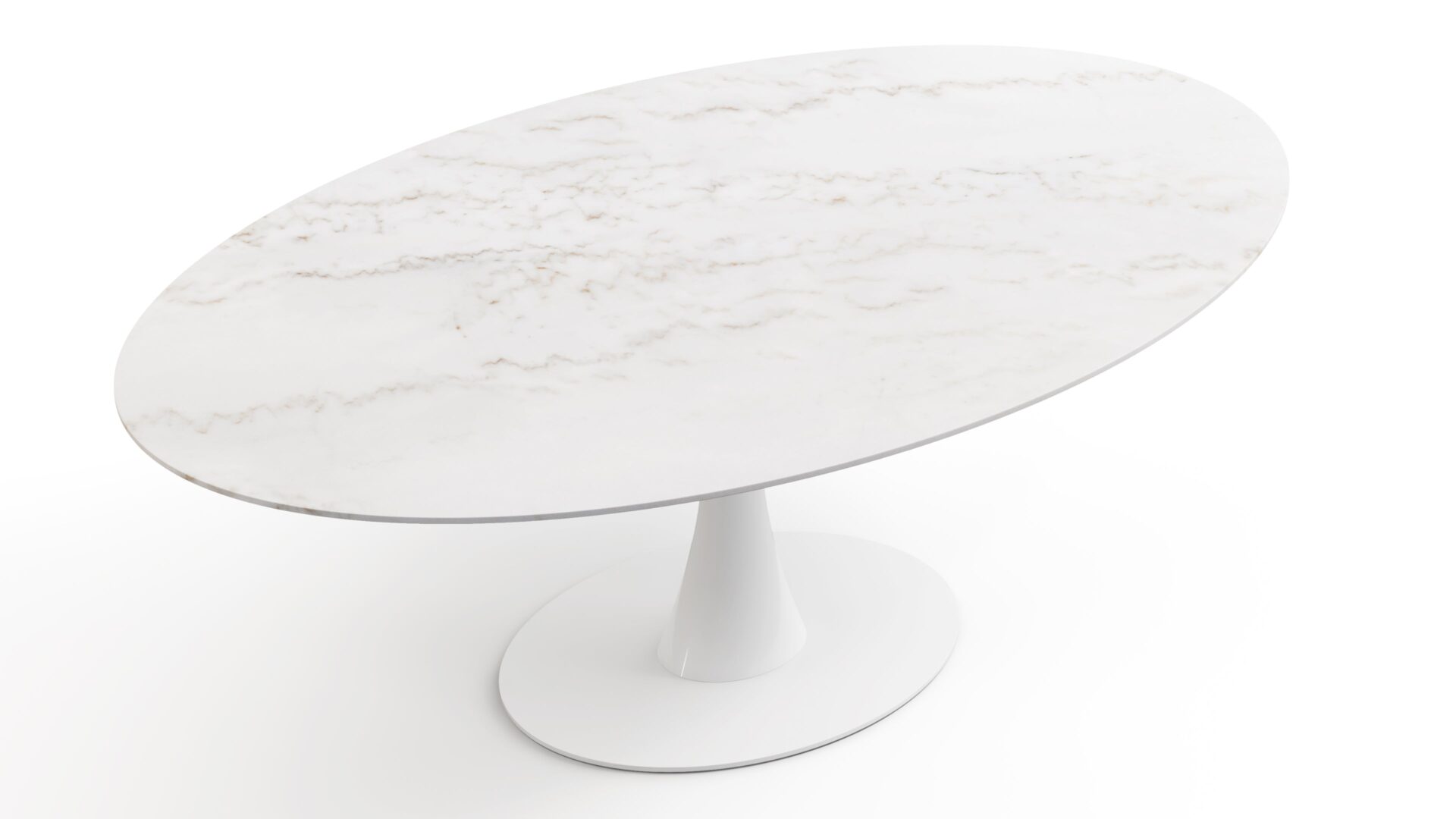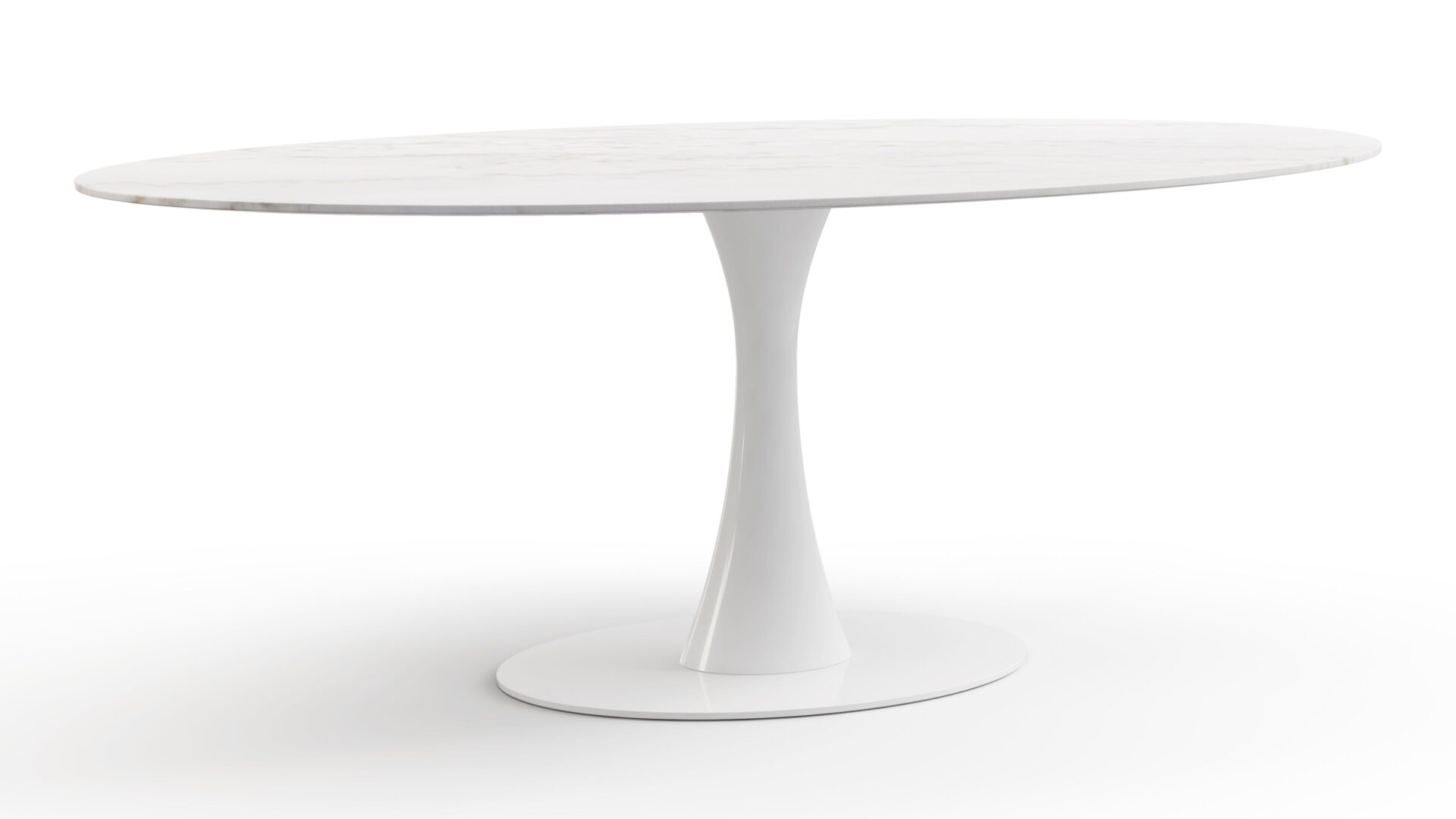 Elevate your space with the sophisticated Aarhus Table featuring a chic design and pedestal base that swaps traditional legs for a sleek yet sturdy central base. Inspired by mid-1950s futuristic aesthetics, this versatile piece doubles as a dining table or contemporary desk alternative, now available in a stunning Calacatta Marble finish. Upgrade your space with this impeccably minimalist, functional, and elegant furniture solution.