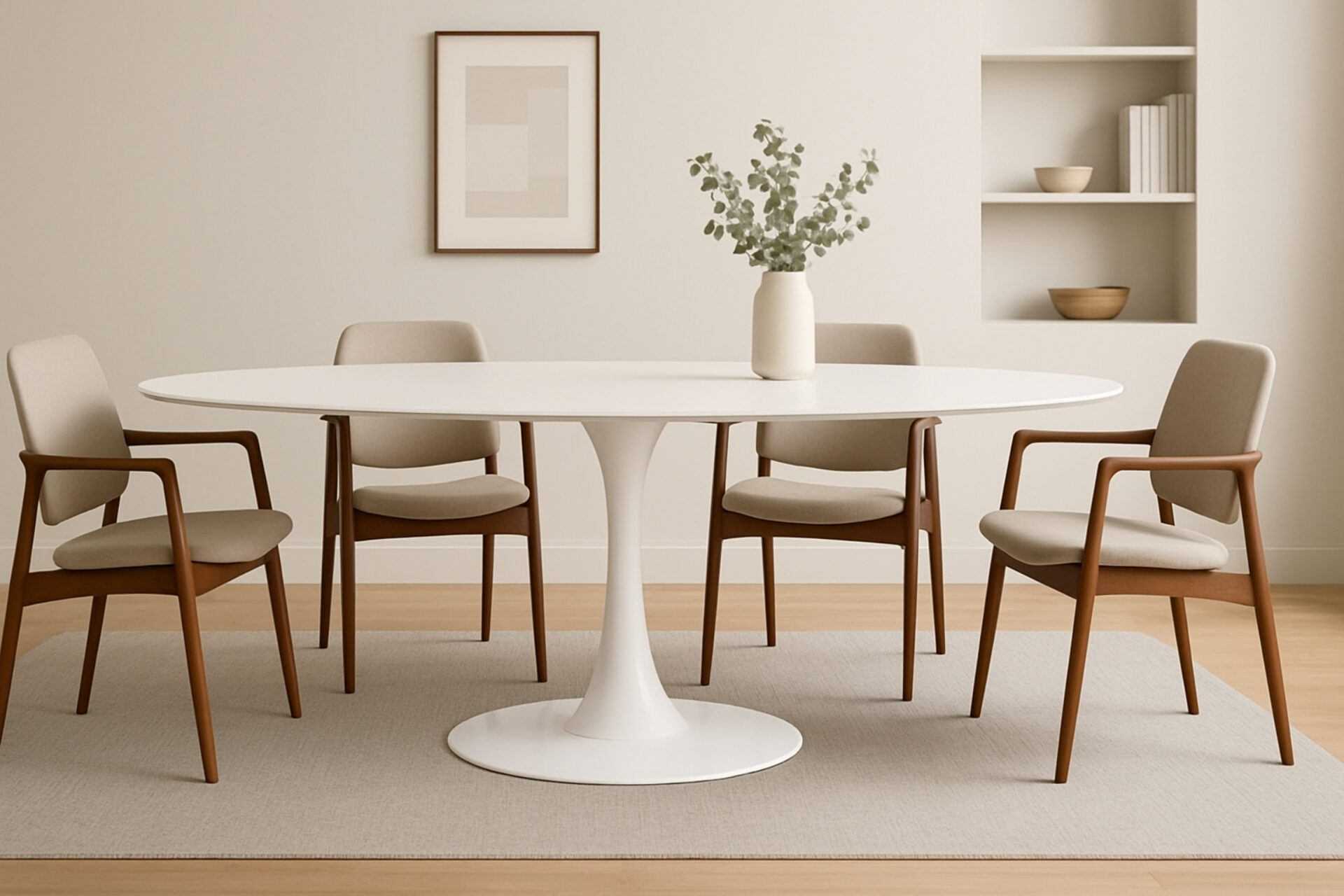 Experience the exquisite design of the Aarhus Dining Table in this modern rendition meticulously crafted with premium materials, featuring a striking white lacquer tabletop that seamlessly blends beauty with functionality.