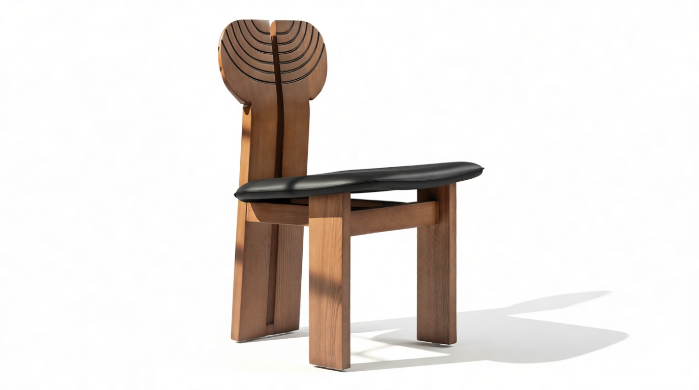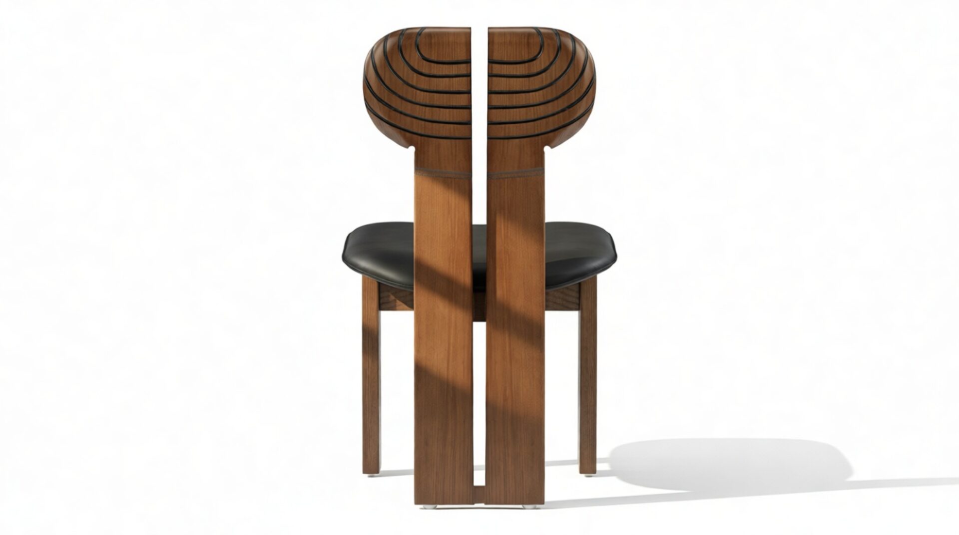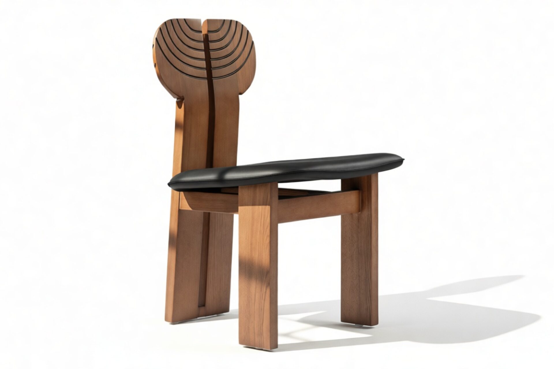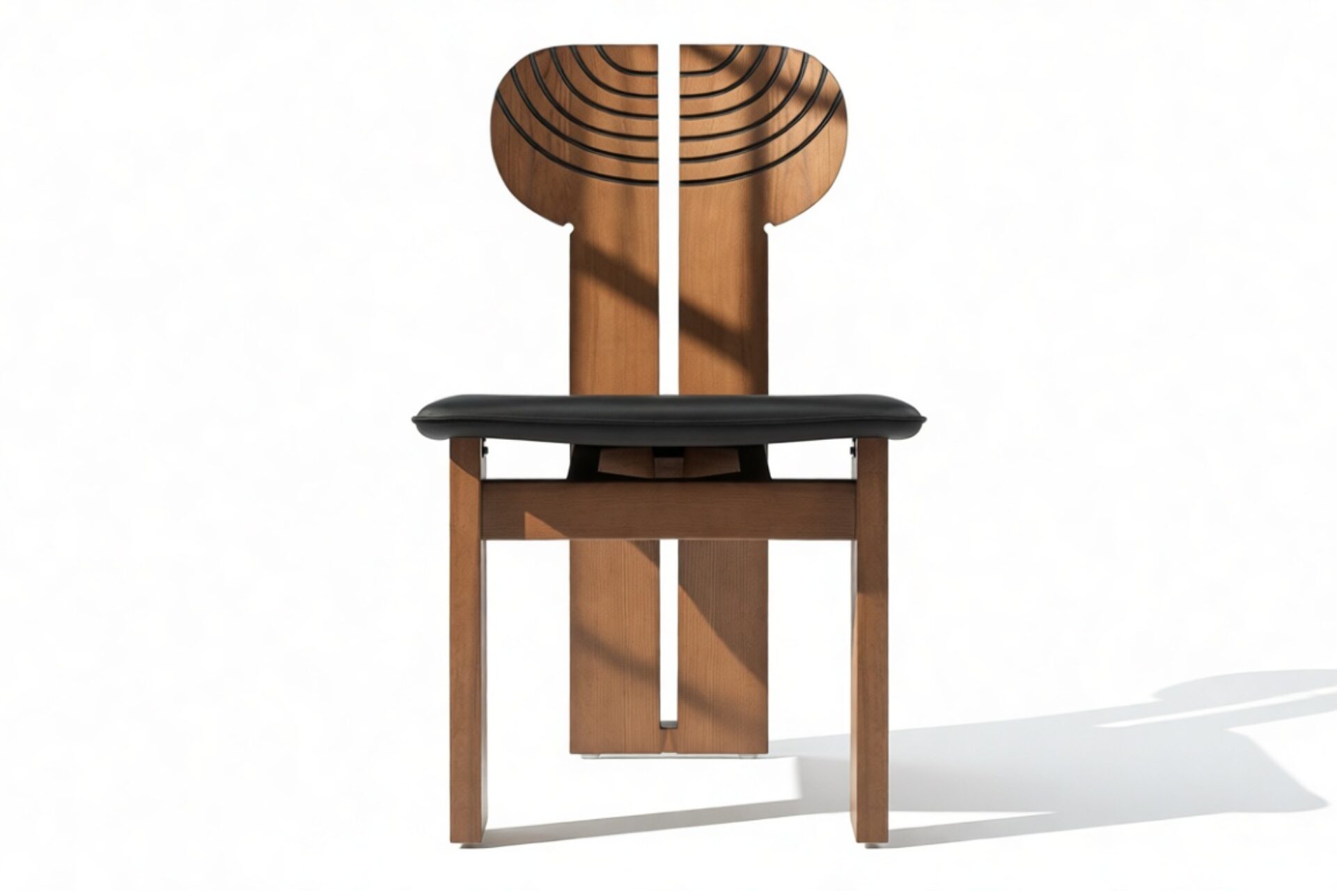 Discover the Africa Chair, a striking addition to your modern furniture collection. This chair showcases a sleek black leather seat, complemented by a sturdy frame crafted from walnut-stained ash wood. Its distinctive split-backrest adorned with artistic inlay detailing beautifully combines contemporary and vintage aesthetics, making it an ideal choice for sophisticated interiors.