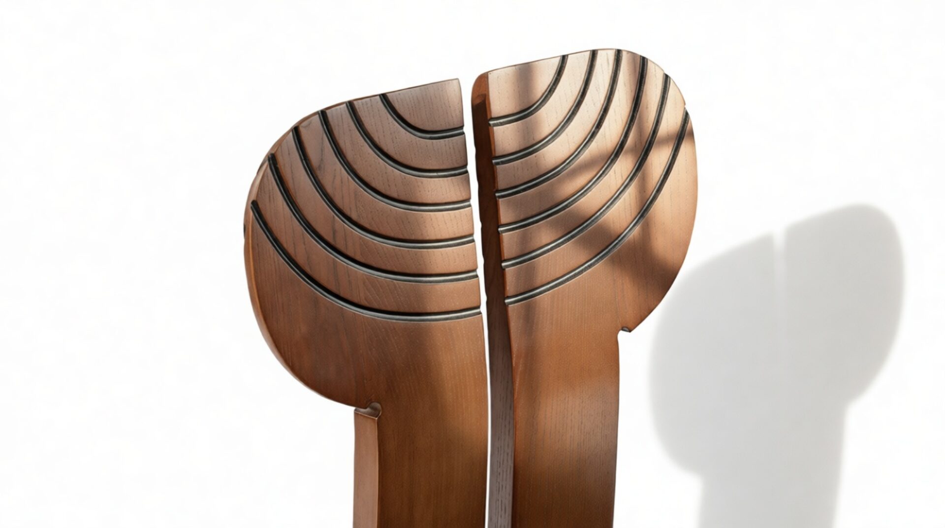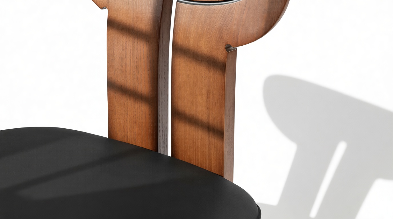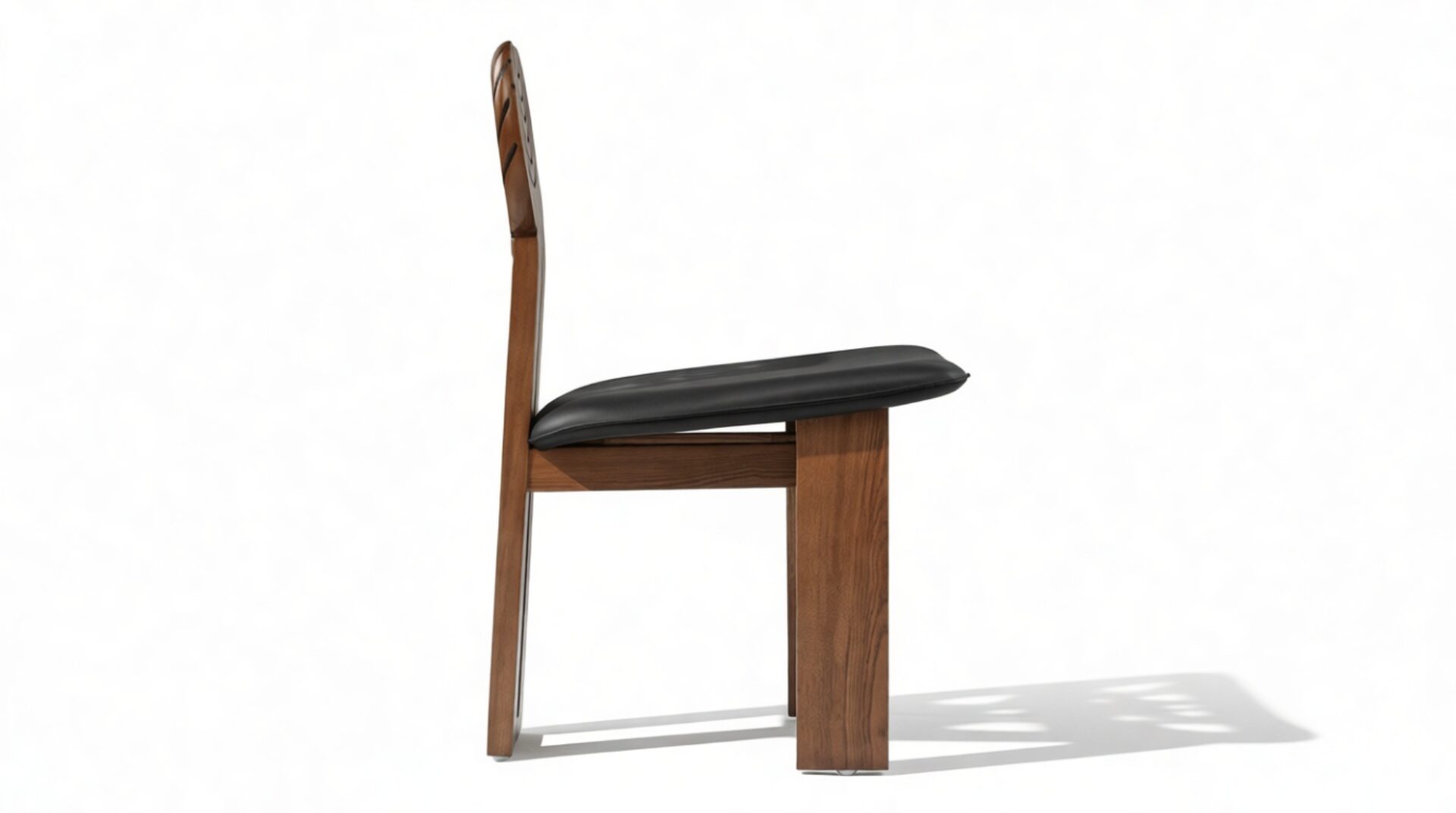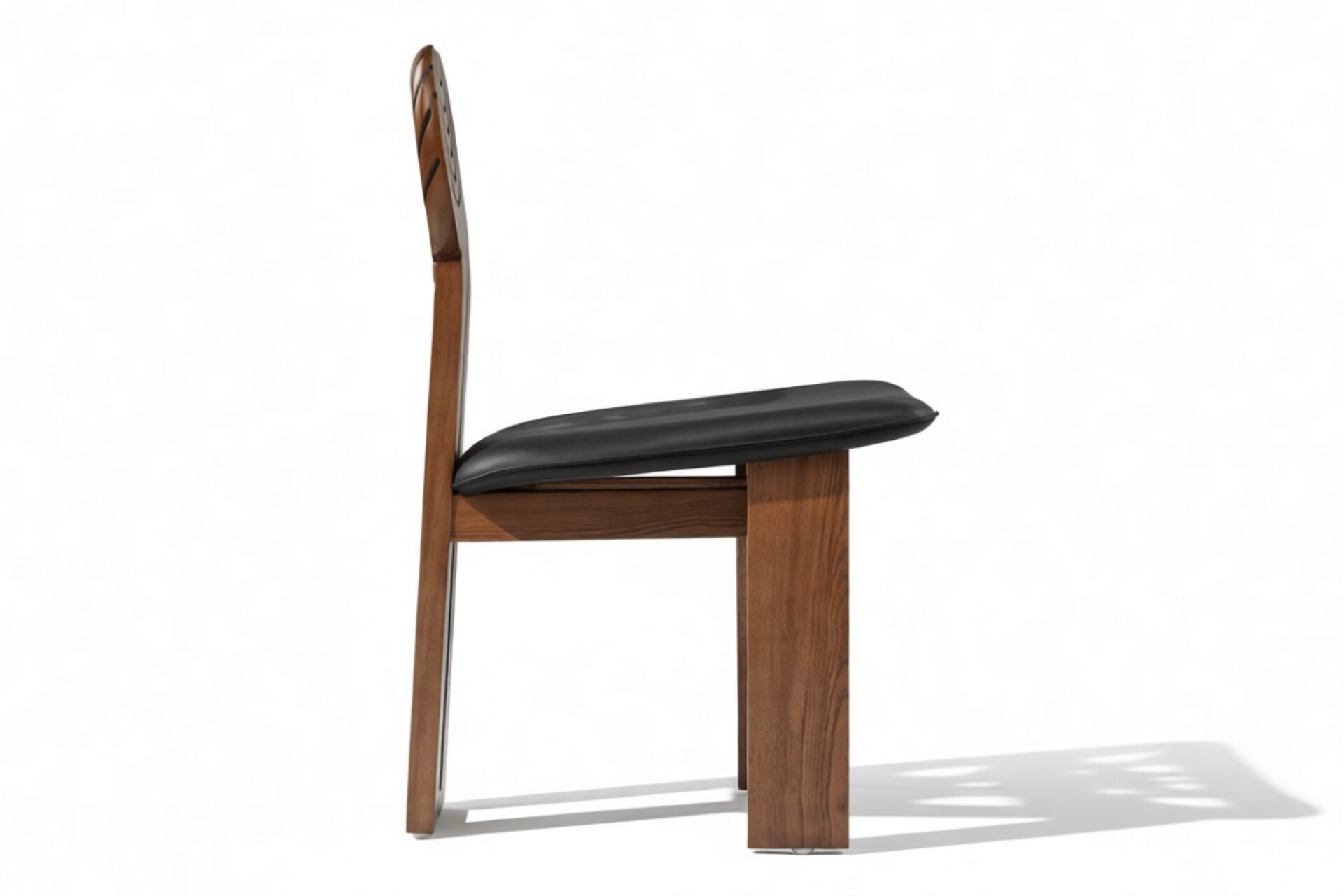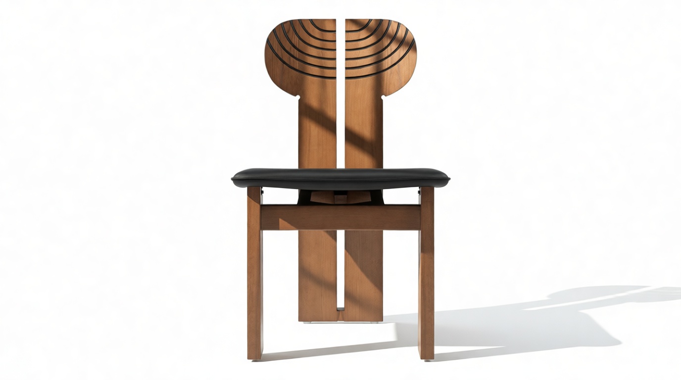 Discover the Africa Chair, a striking addition to your modern furniture collection. This chair showcases a sleek black leather seat, complemented by a sturdy frame crafted from walnut-stained ash wood. Its distinctive split-backrest adorned with artistic inlay detailing beautifully combines contemporary and vintage aesthetics, making it an ideal choice for sophisticated interiors.