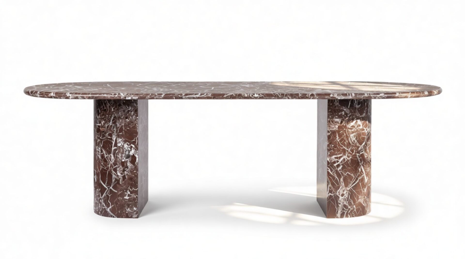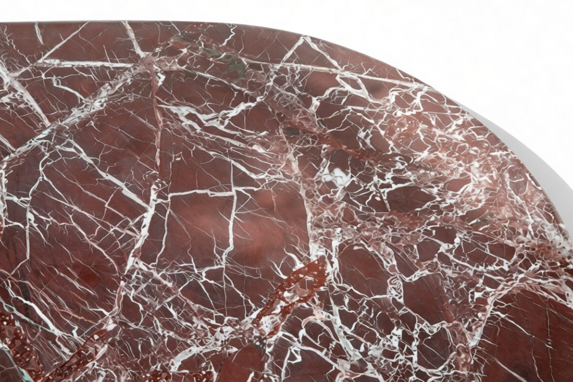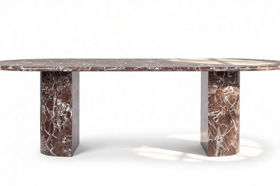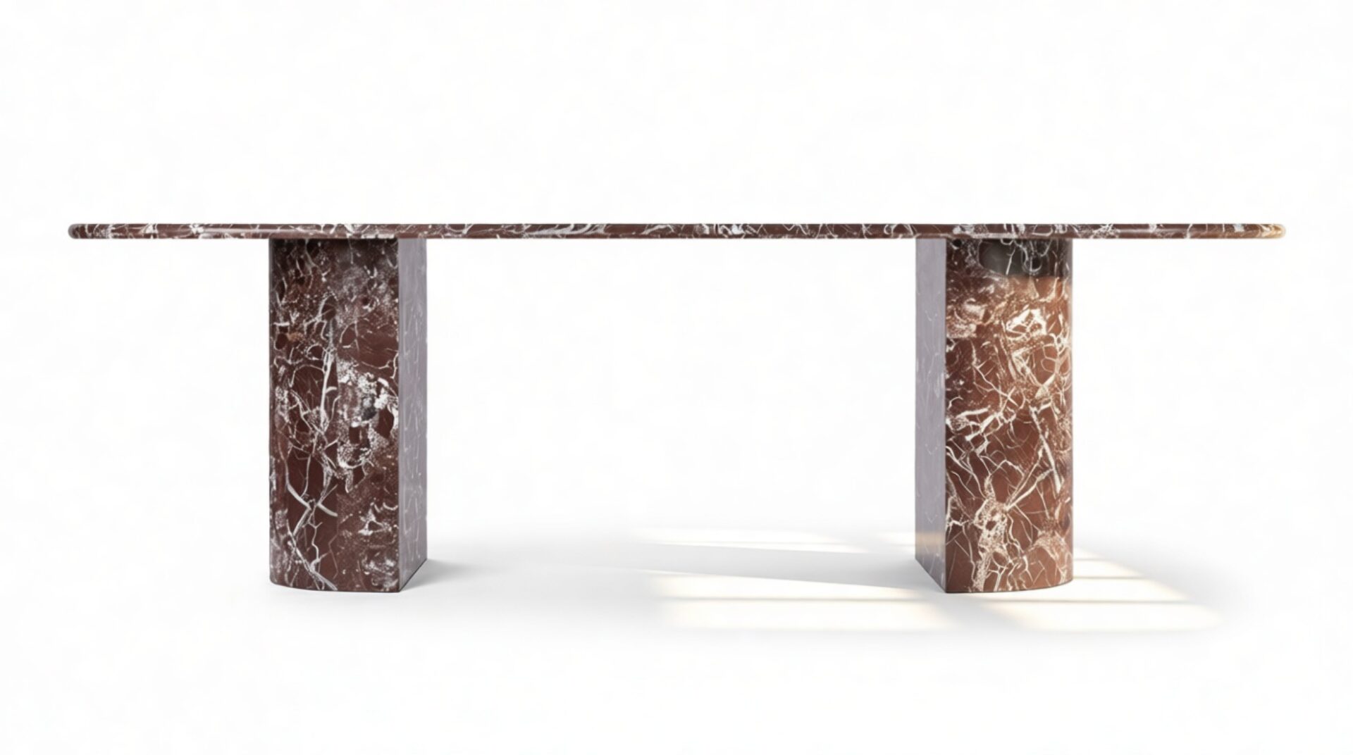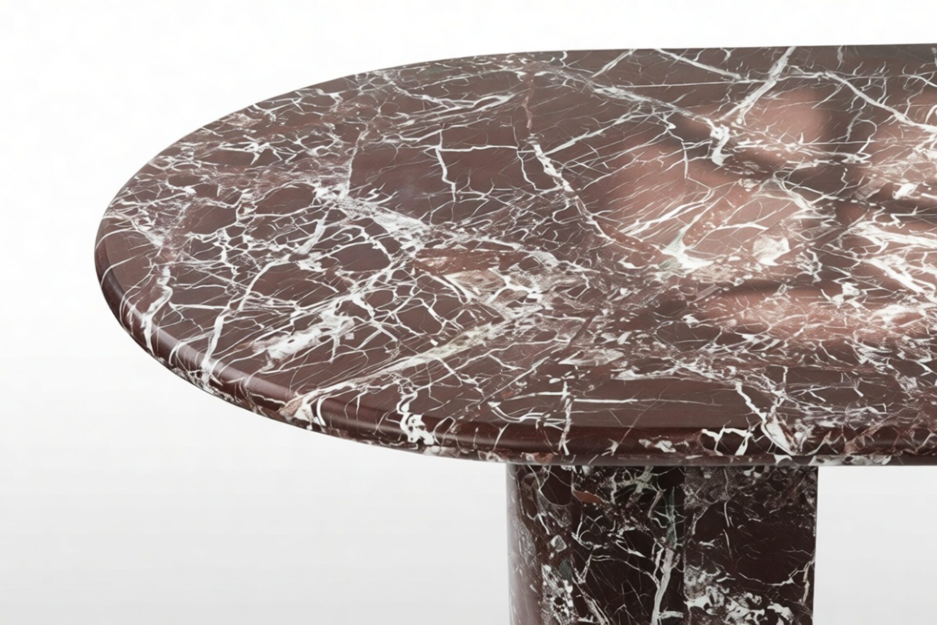 Elevate your dining experience with the luxurious Alighieri dining table, featuring exquisite Rosso Levanto Marble. Standing as the ultimate statement piece, this modern twist on the traditional double pedestal table adds a contemporary touch to upscale interiors. With unique variations in appearance, including distinct color patterns and natural veining, this opulent piece exudes classic elegance redefined for modern living.