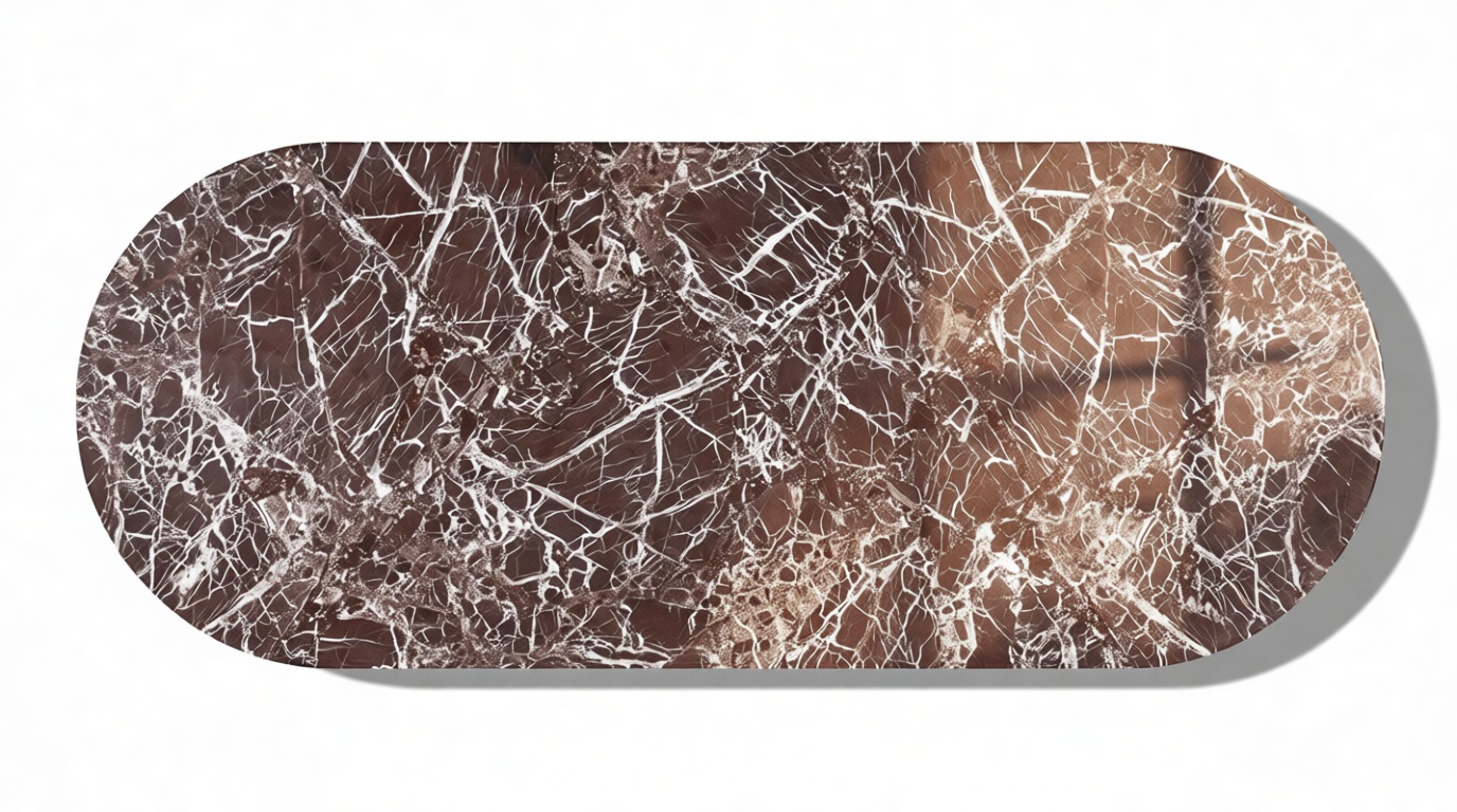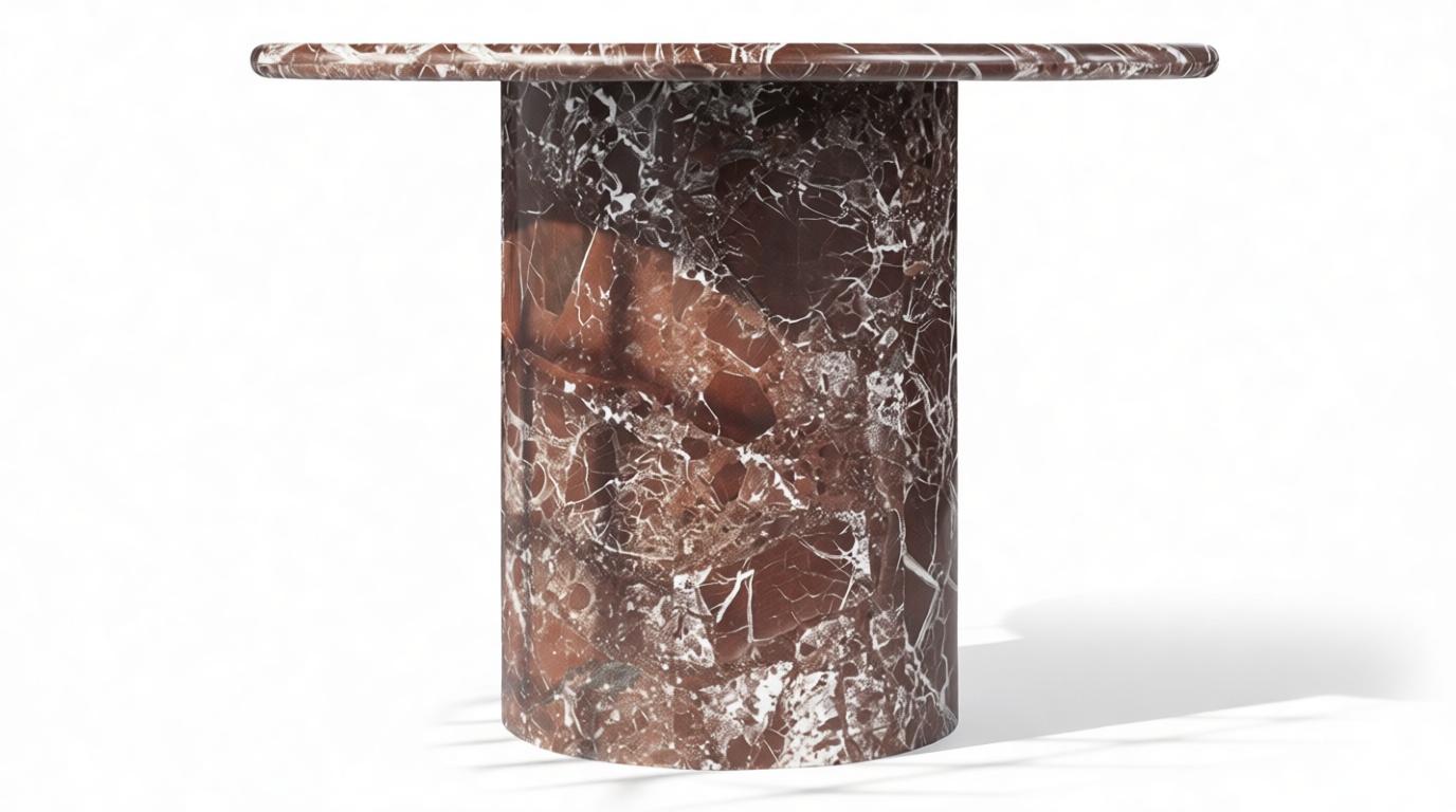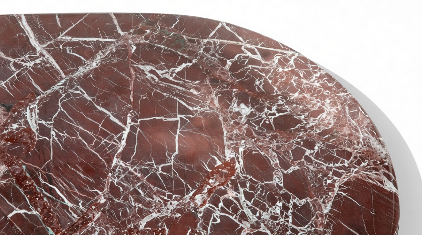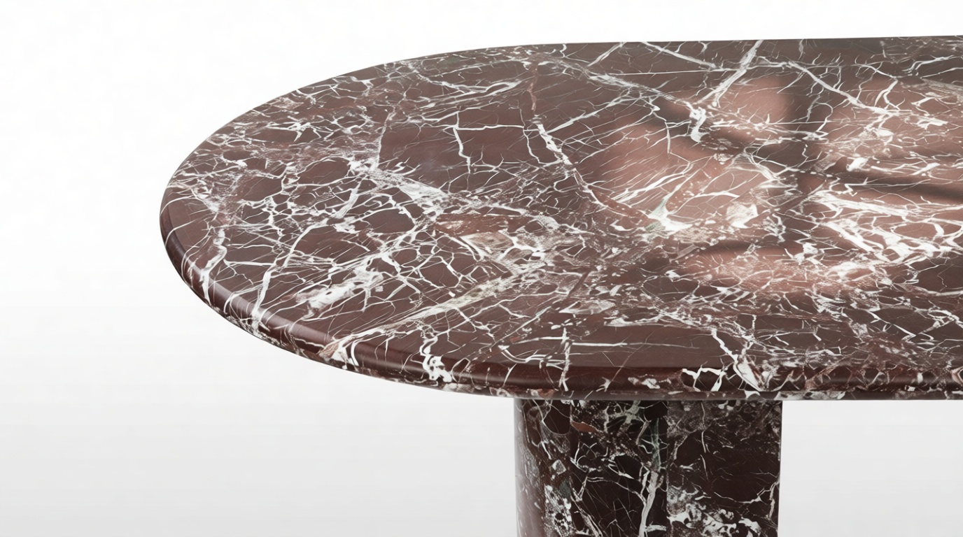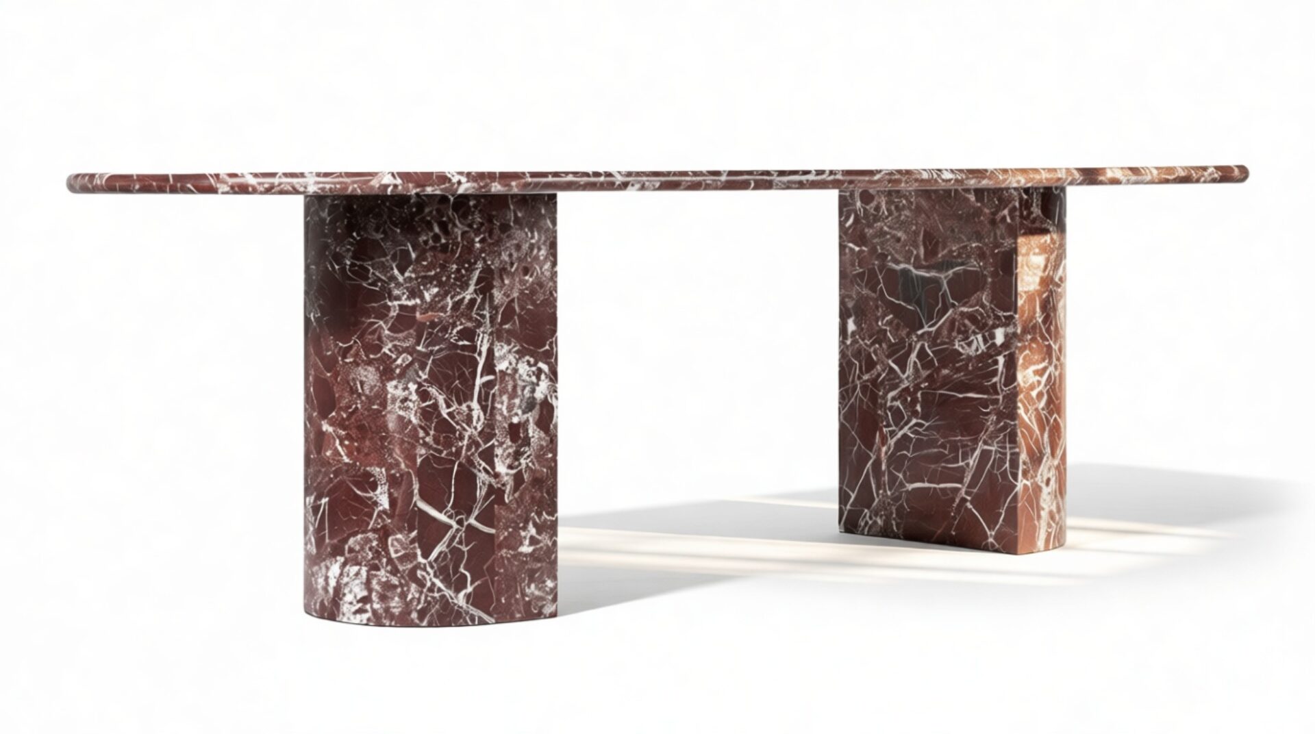 Elevate your dining experience with the luxurious Alighieri dining table, featuring exquisite Rosso Levanto Marble. Standing as the ultimate statement piece, this modern twist on the traditional double pedestal table adds a contemporary touch to upscale interiors. With unique variations in appearance, including distinct color patterns and natural veining, this opulent piece exudes classic elegance redefined for modern living.