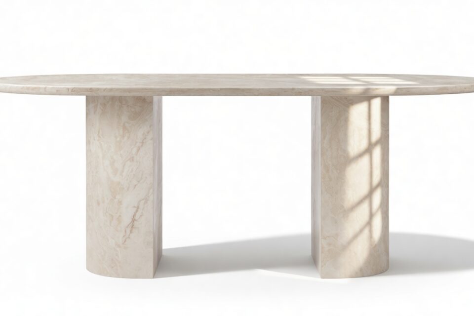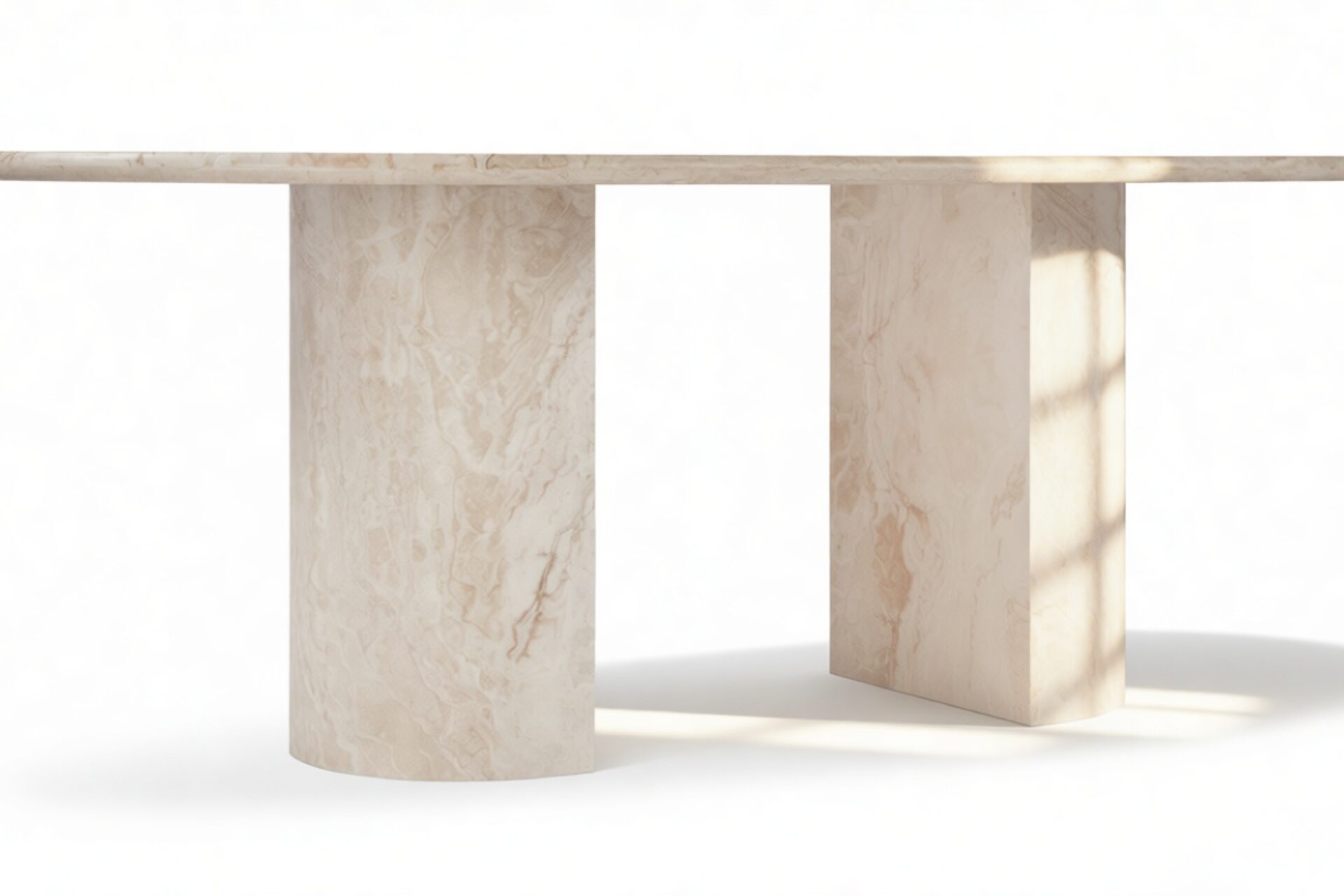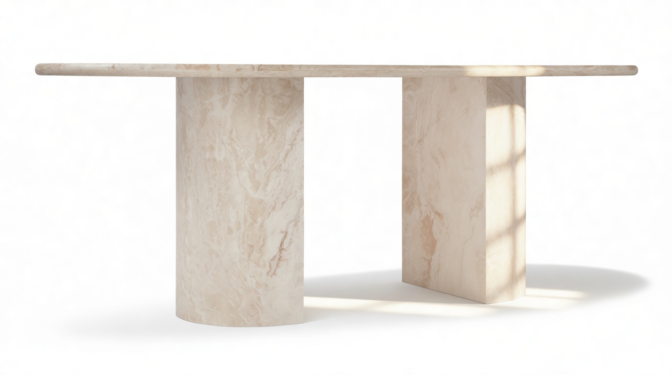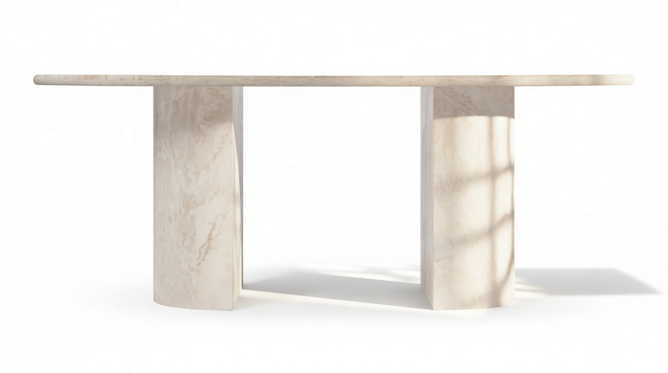 Elevate your dining space with the stunning Alighieri dining table, a perfect focal point that embodies the essence of fine dining. With its sleek and unpretentious design, this table beautifully complements and enhances the opulent Italian travertine. Featuring a refined polished finish, the Alighieri dining table is a striking centerpiece for elegant dining and entertaining. Its generous 77” top is gracefully supported by two demi-lune column legs, inspired by classical architecture yet delivered with a modern flair.