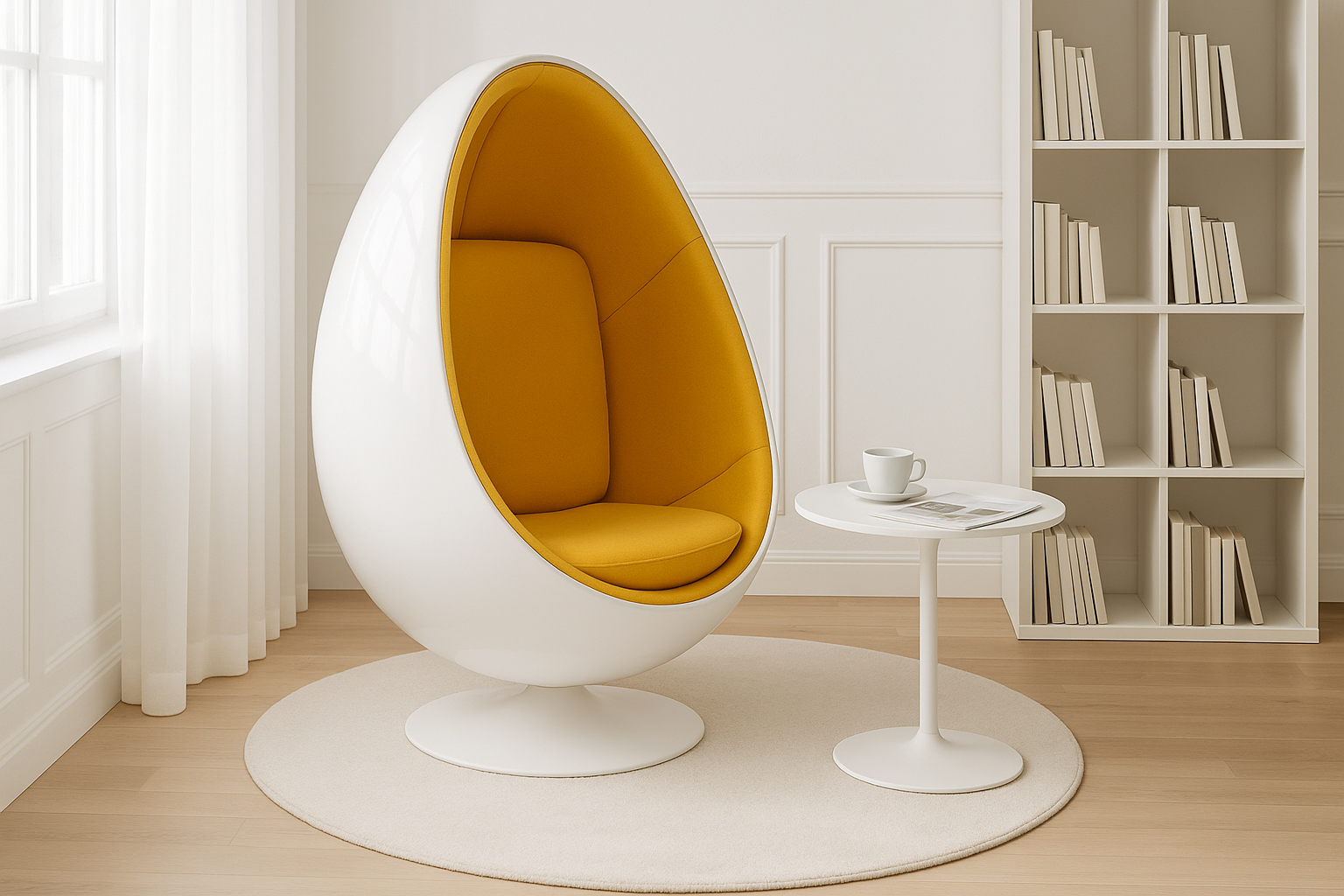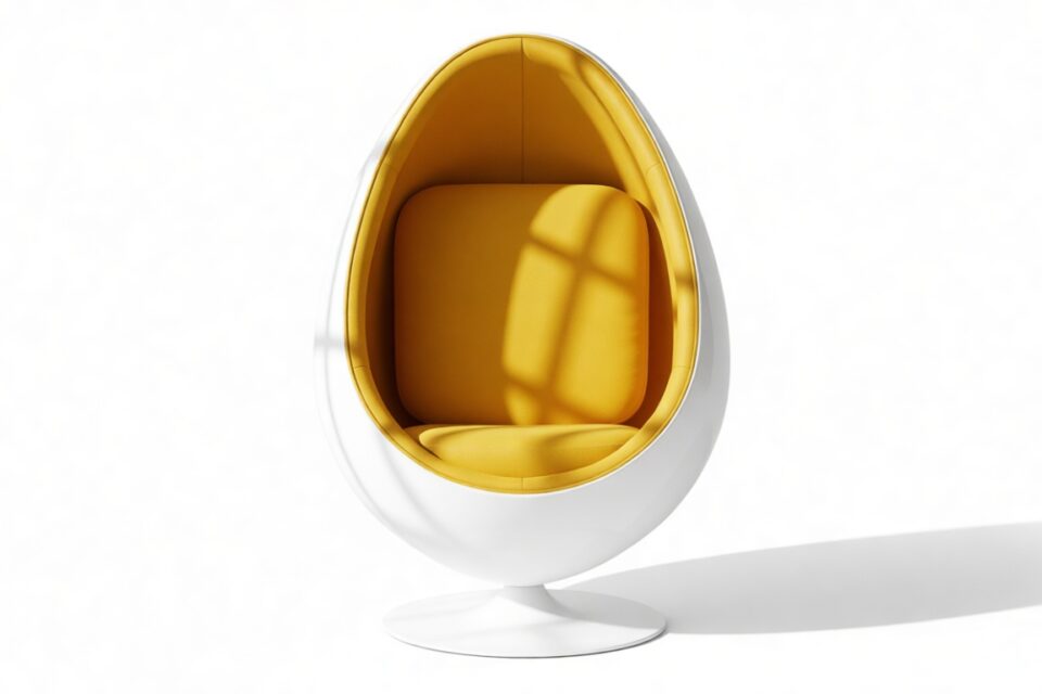 Experience the cutting-edge design of the Alpha Egg Pod Chair, influenced by 60s aesthetics. This chair features striking color contrasts and graceful, rounded curves, adding a touch of modern yet vintage style to any room.