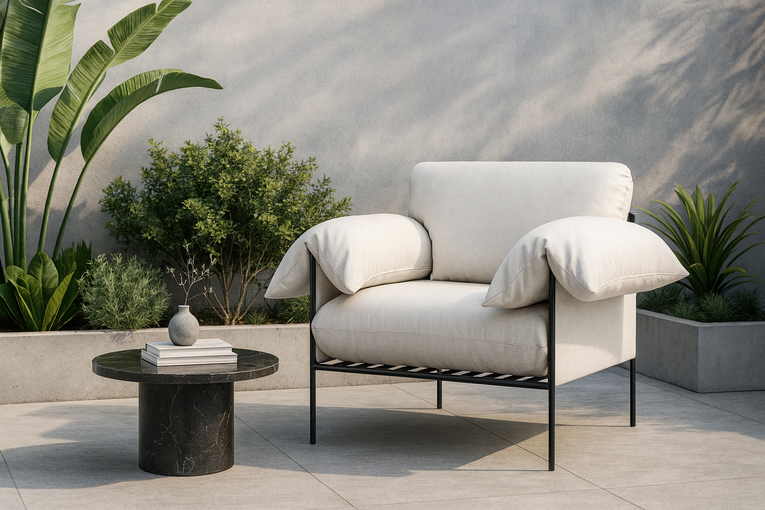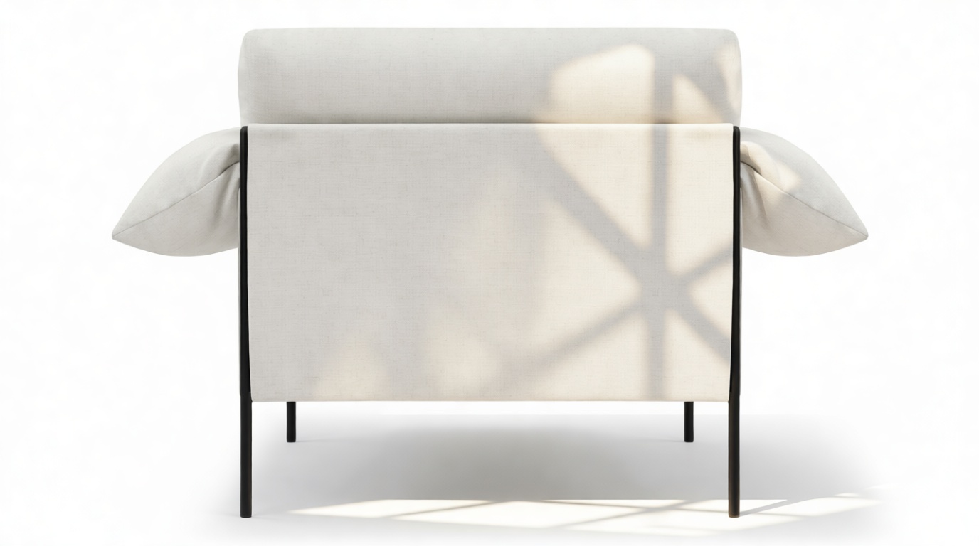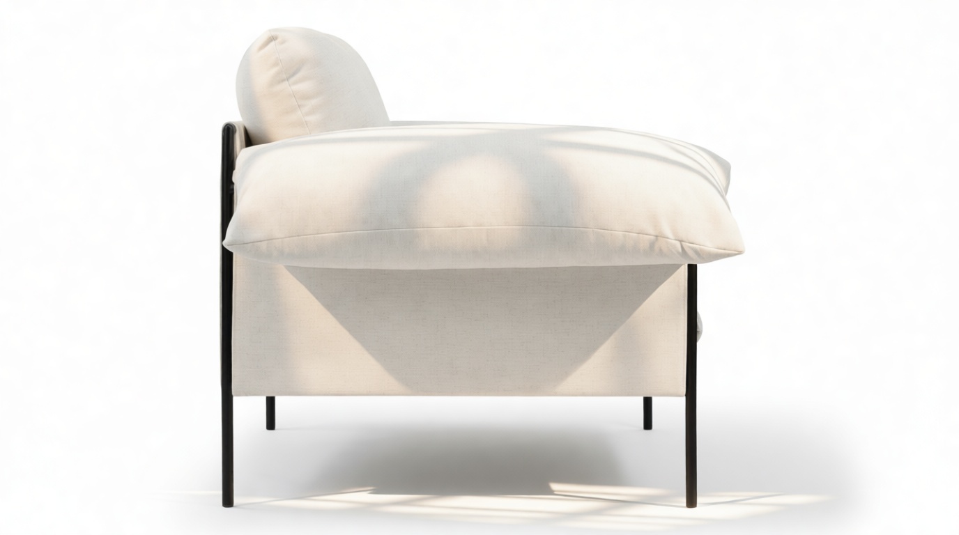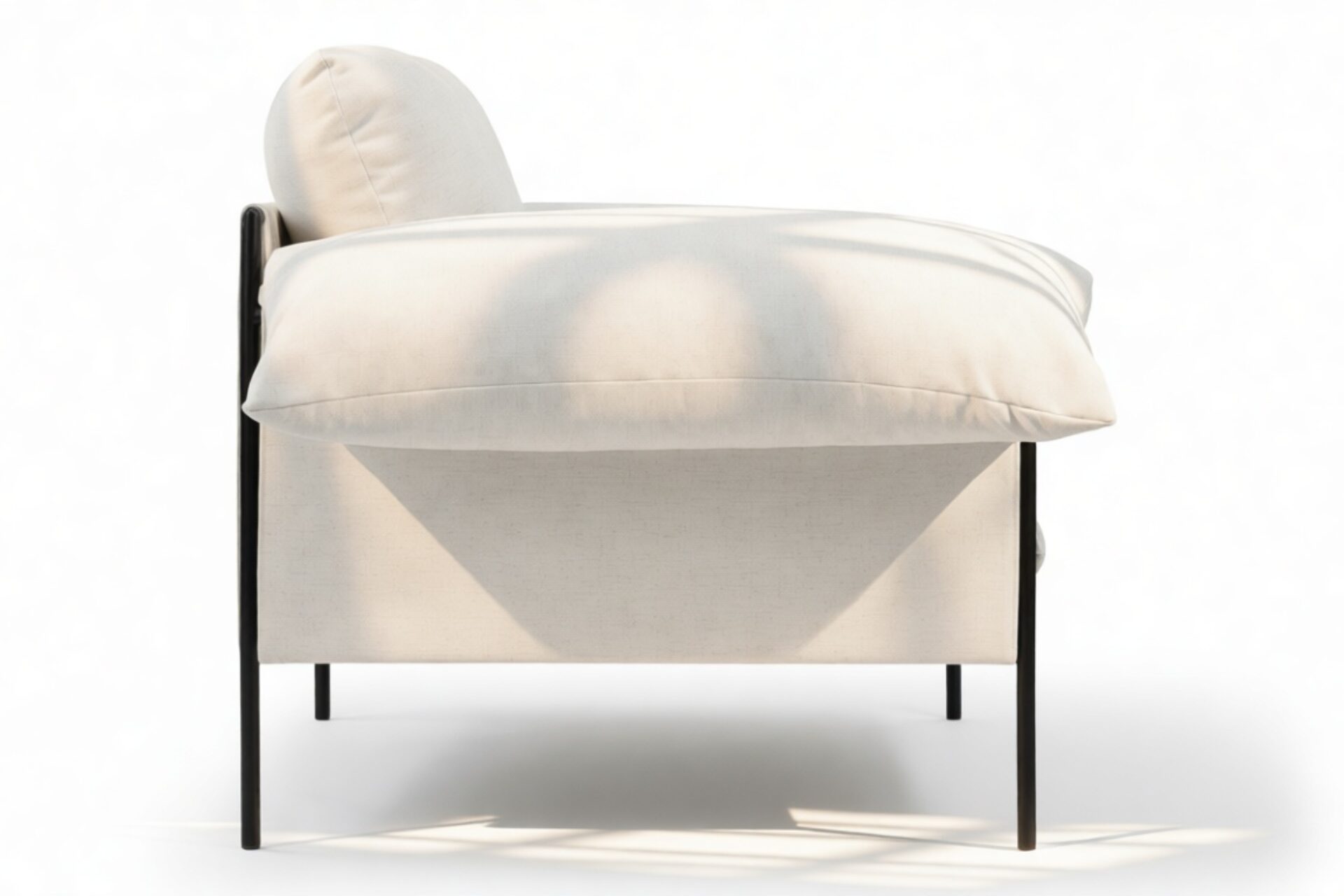 Elevate your space with the approved Stills furniture piece. The sophisticated black metal frame effortlessly complements the plush off-white upholstery, striking a harmonious blend of industrial allure and welcoming coziness. This piece's suspended seat and modern metal frame accentuate its architectural yet inviting charm, establishing it as a standout selection for modern living areas.