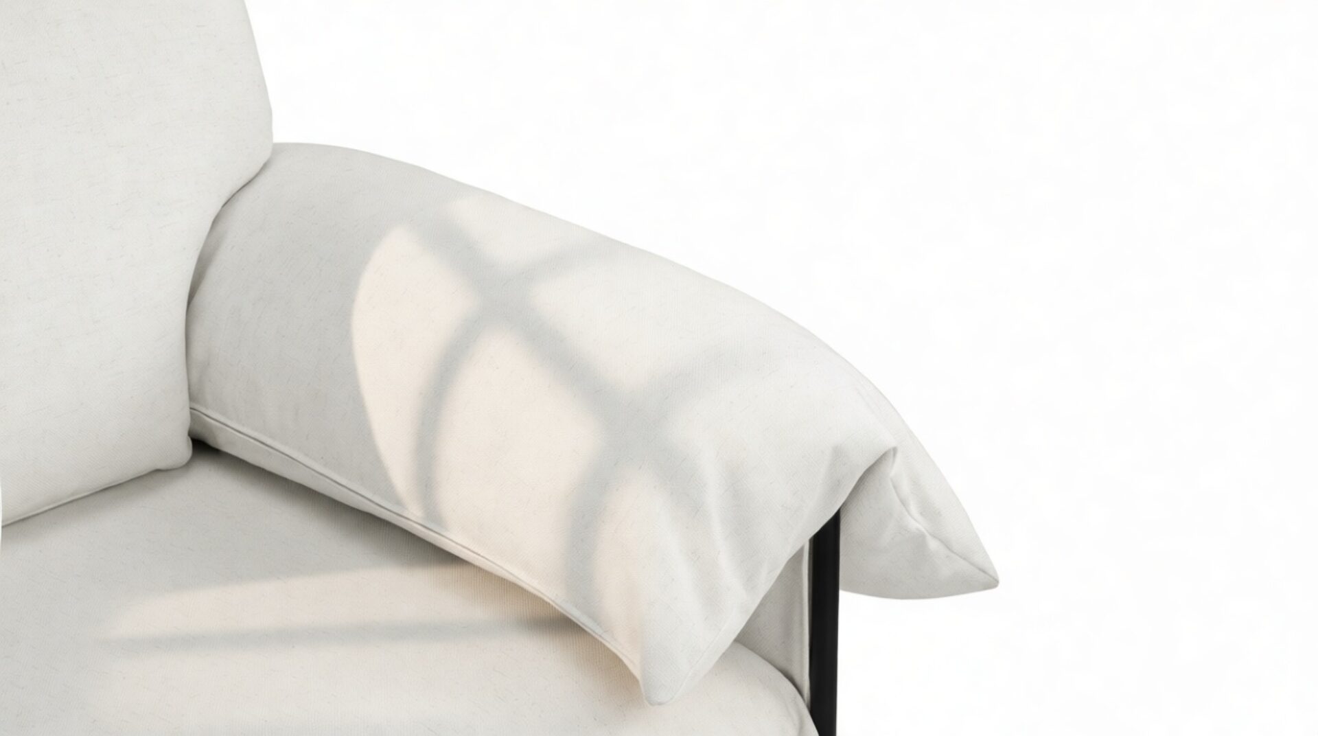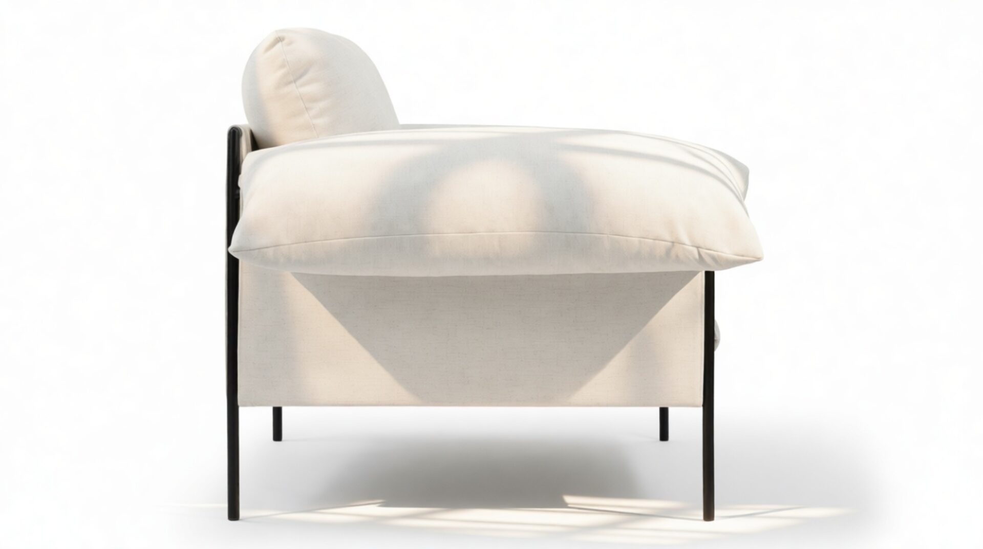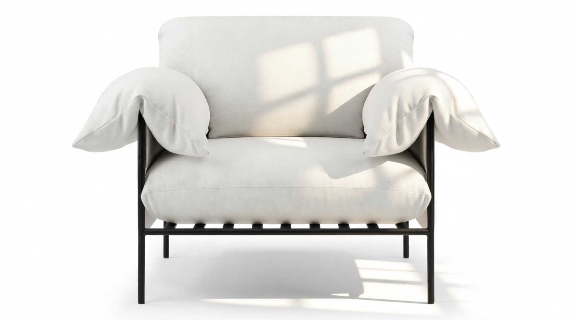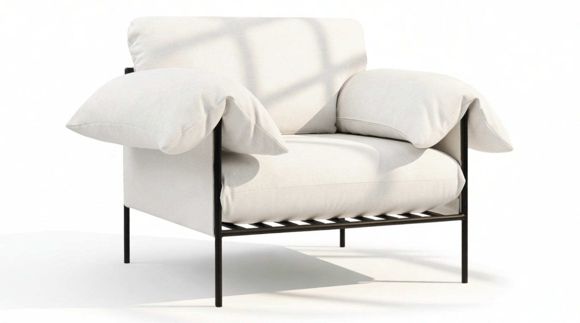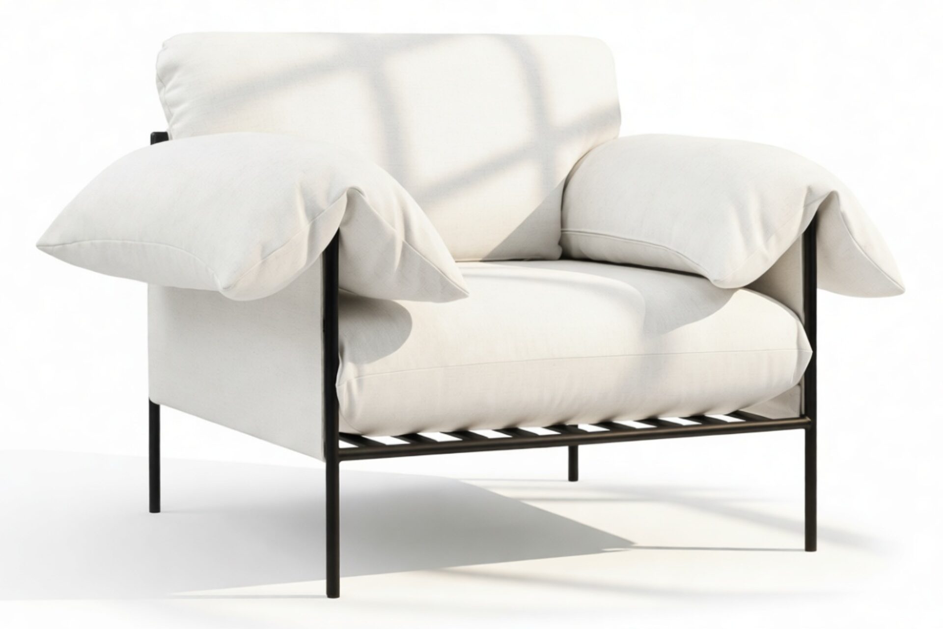 Experience cloud-like seating with the Alva Lounge Chair. This chair features a black powder-coated metal frame that provides durable support for plush foam cushions and pillow-like armrests. Its suspended seat design and neutral off-white upholstery make it a versatile piece for both modern and cozy interiors.