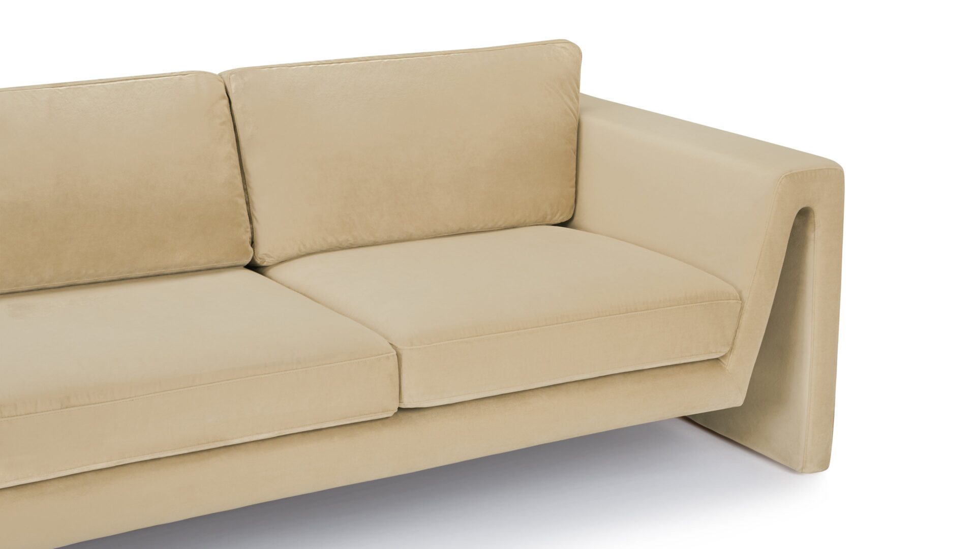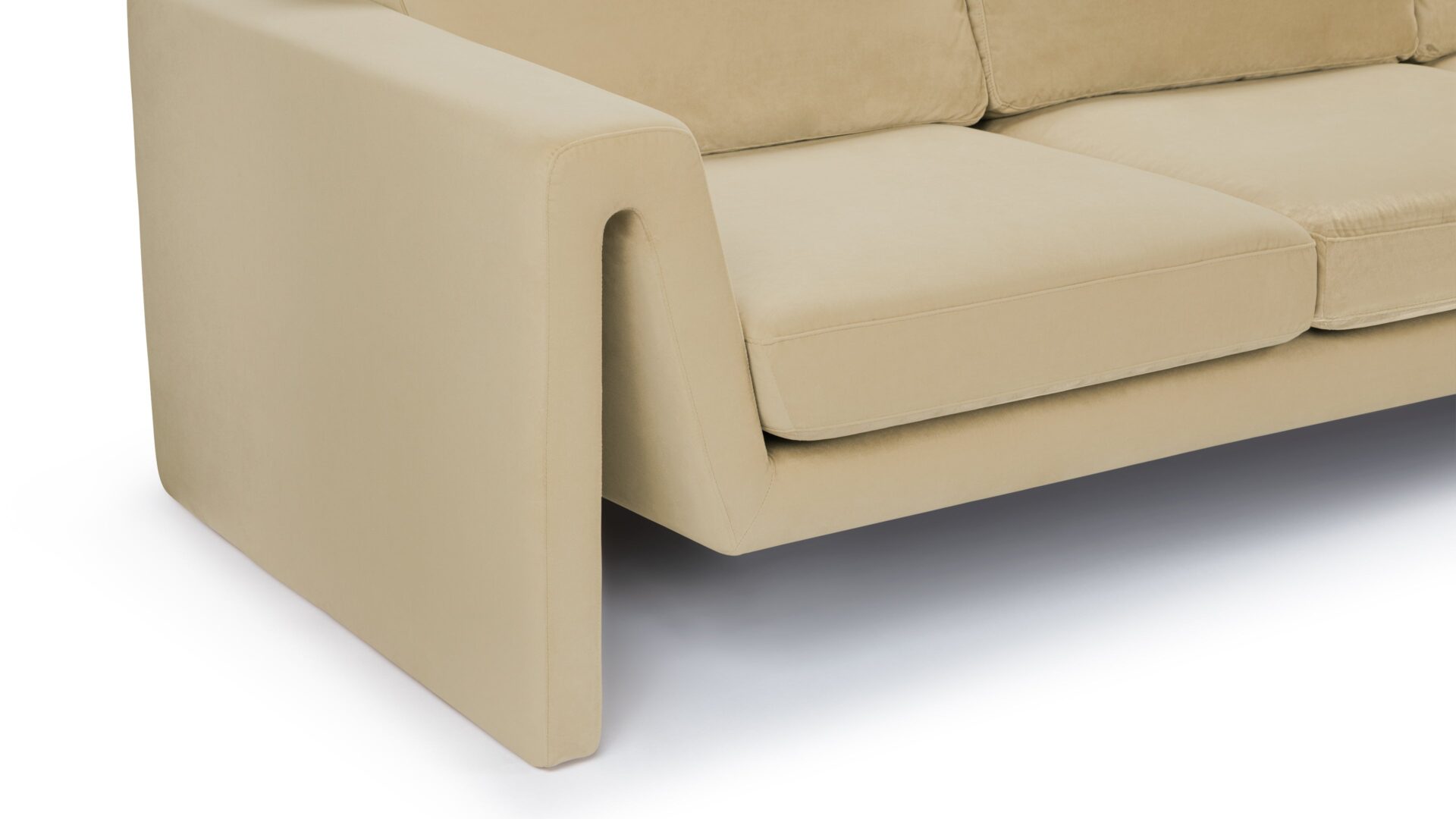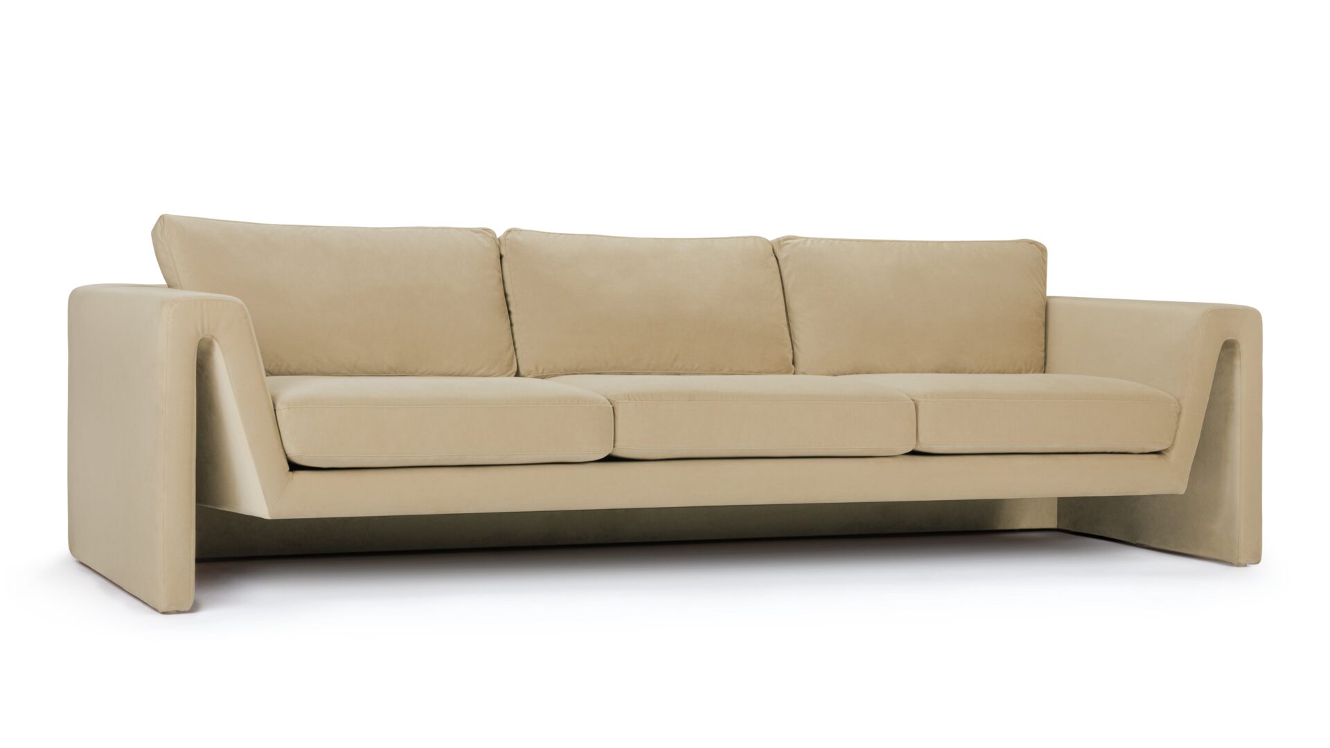 Crafted with a sturdy wooden frame and luxurious velvet upholstery, the Amore Sofa seamlessly blends robust materials with a sleek, effortless-to-maintain surface, ensuring durability and a cozy, hassle-free look.