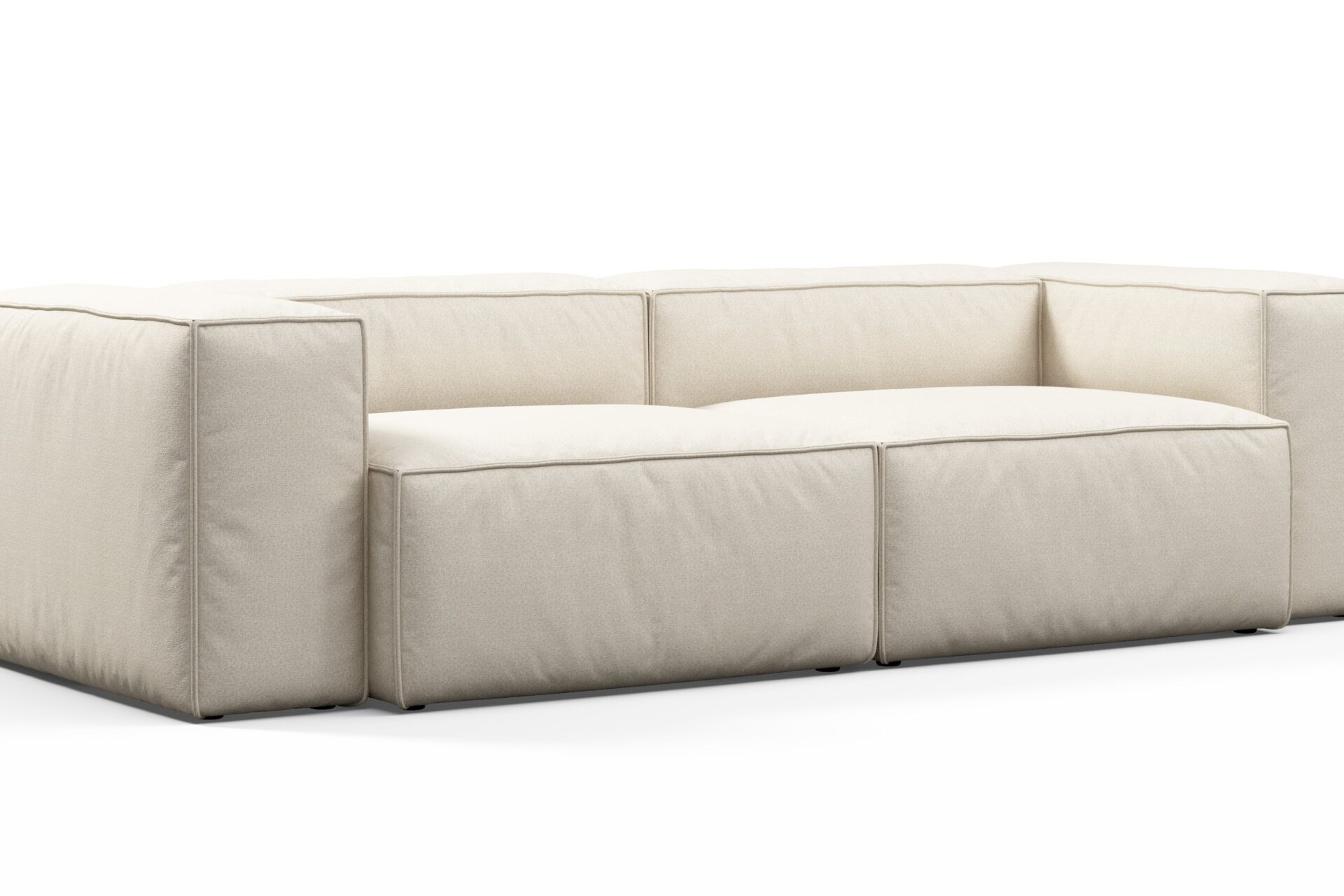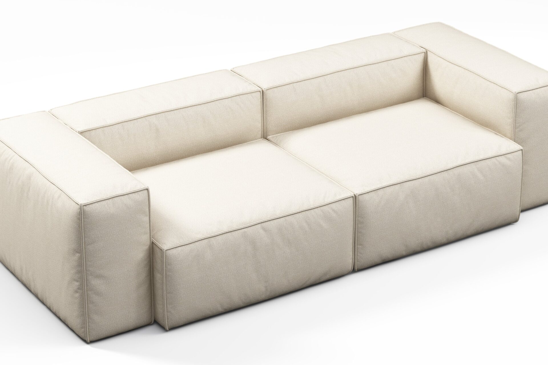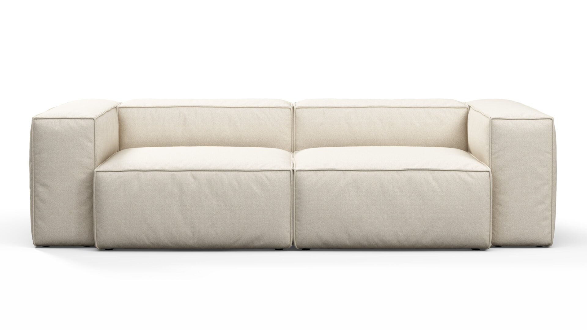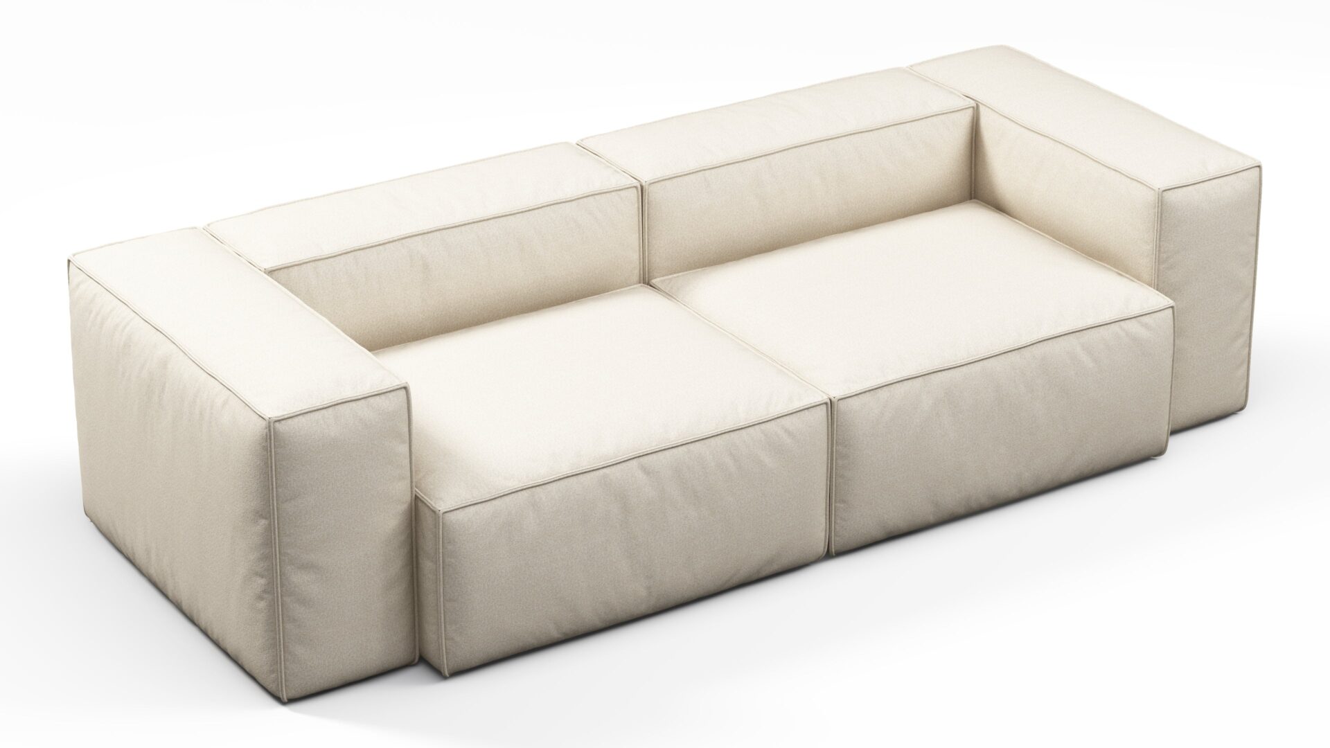 Introducing a collection showcasing a boxy silhouette with deep seating, enveloped in a neutral beige outdoor fabric and bolstered by a stylish aluminum frame, seamlessly merging contemporary design with resilient materials.