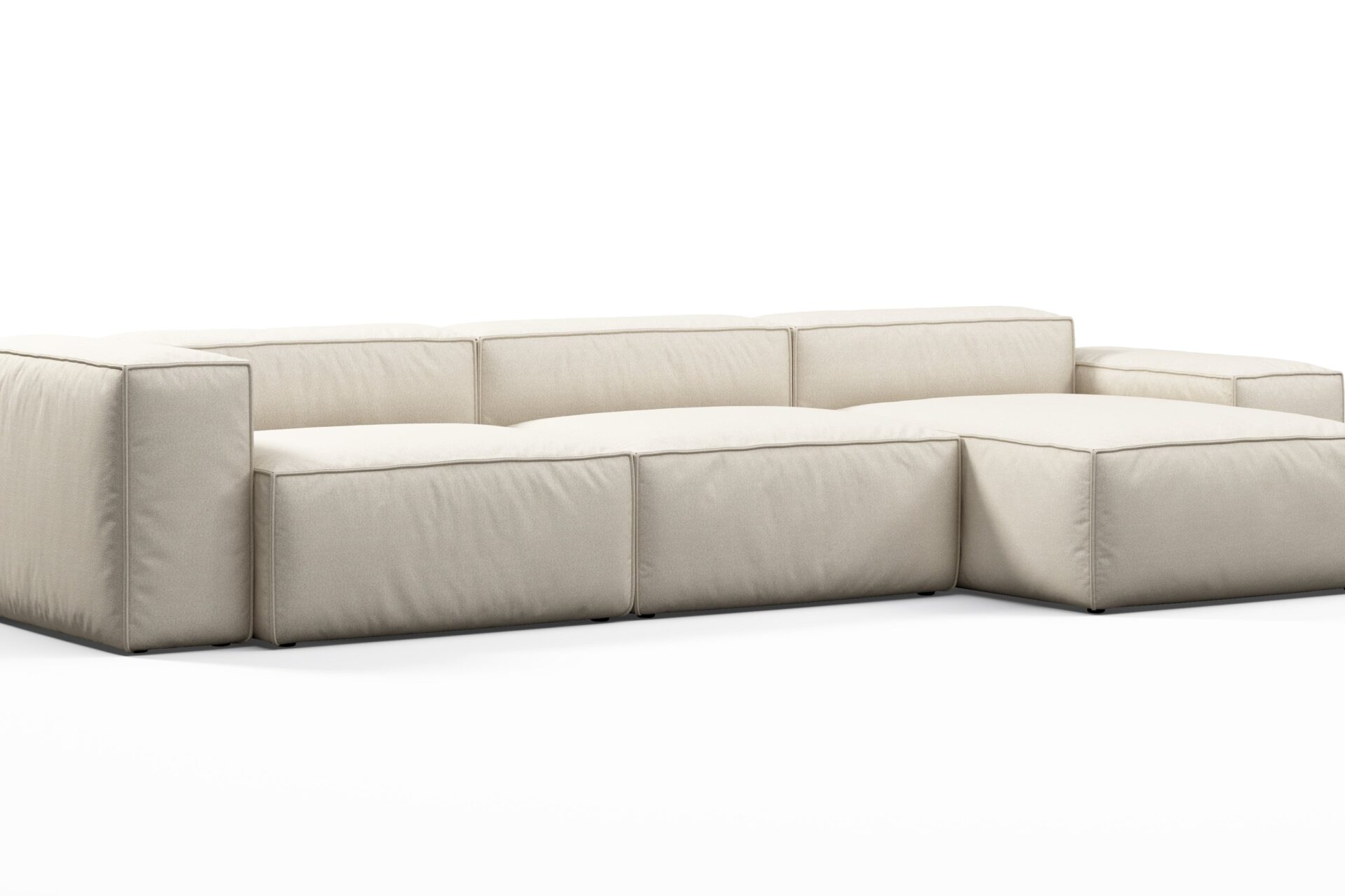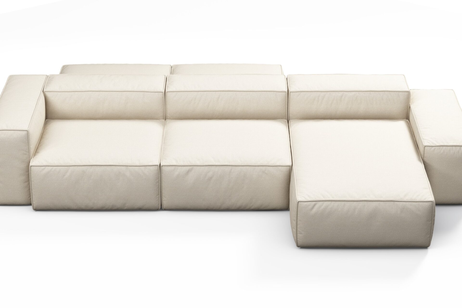 Introducing a collection showcasing a boxy silhouette with deep seating, enveloped in a neutral beige outdoor fabric and bolstered by a stylish aluminum frame, seamlessly merging contemporary design with resilient materials.