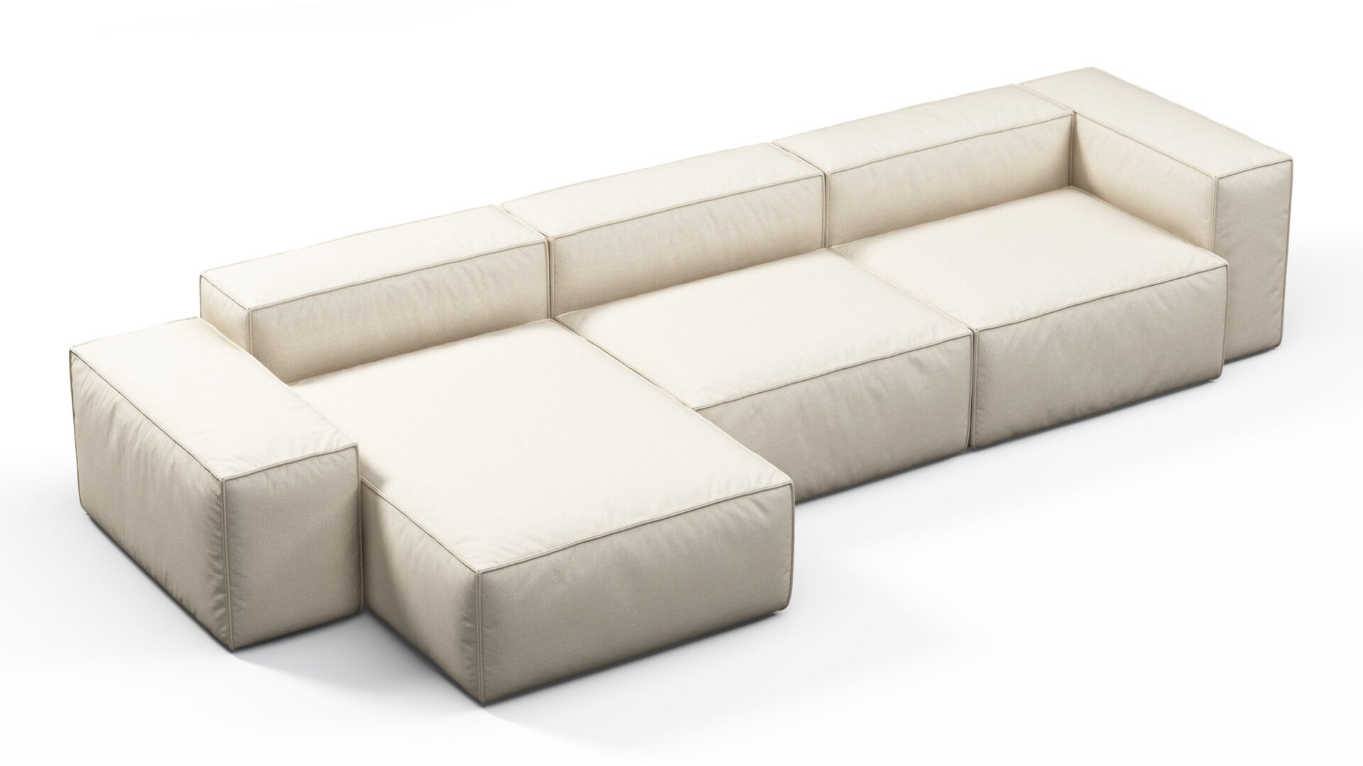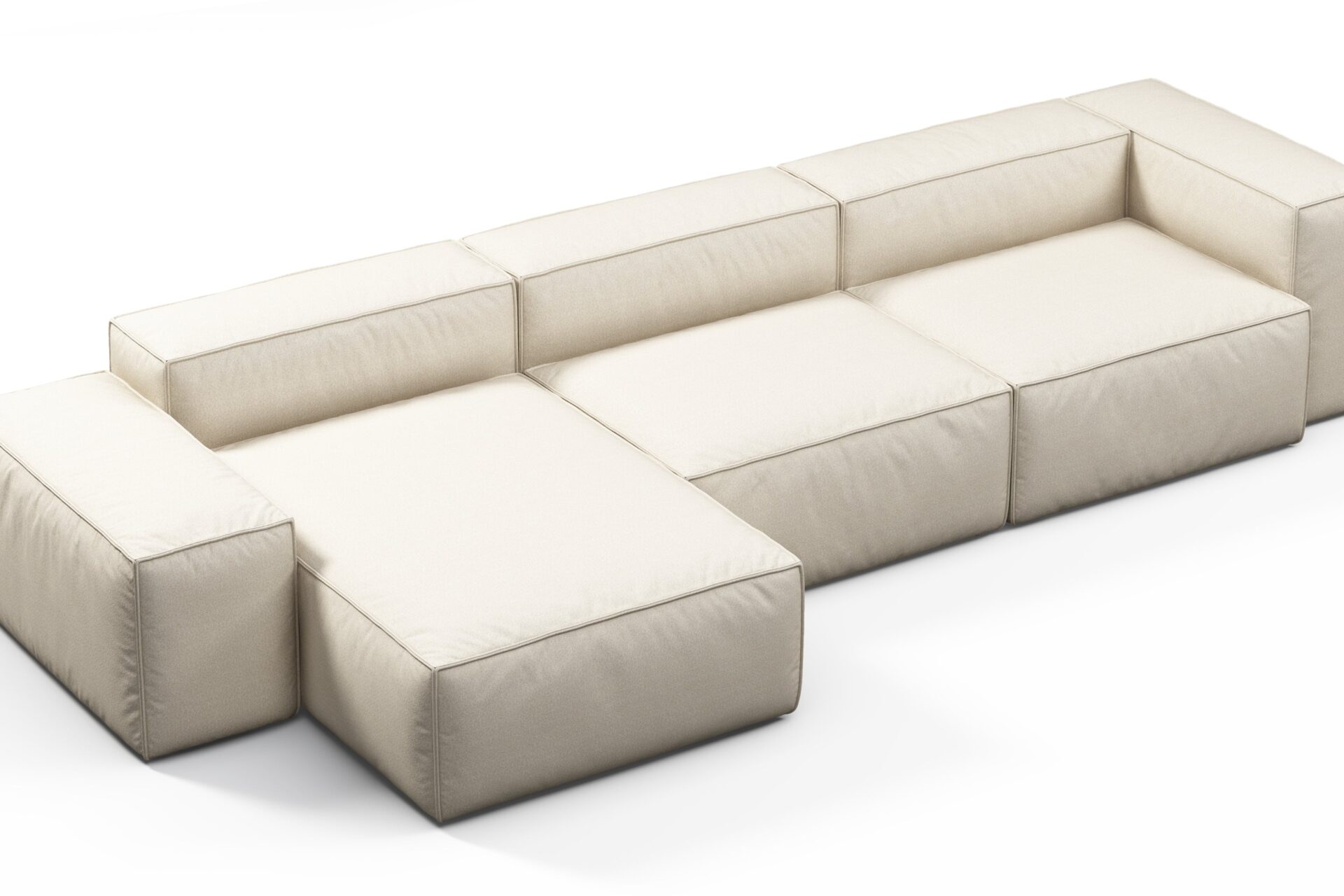 Introducing a collection showcasing a boxy silhouette with deep seating, enveloped in a neutral beige outdoor fabric and bolstered by a stylish aluminum frame, seamlessly merging contemporary design with resilient materials.