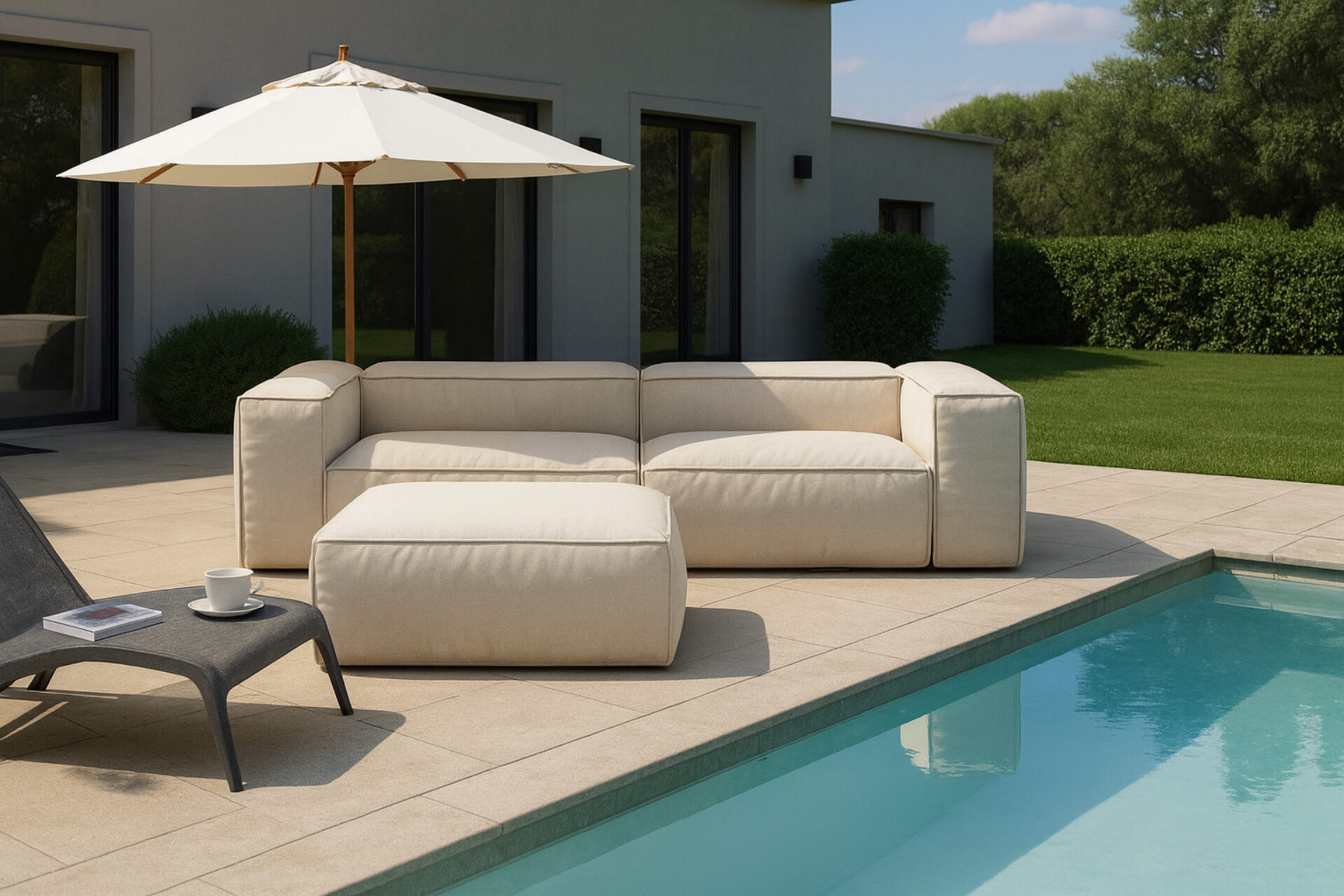 Introducing a collection showcasing a boxy silhouette with deep seating, enveloped in a neutral beige outdoor fabric and bolstered by a stylish aluminum frame, seamlessly merging contemporary design with resilient materials.
