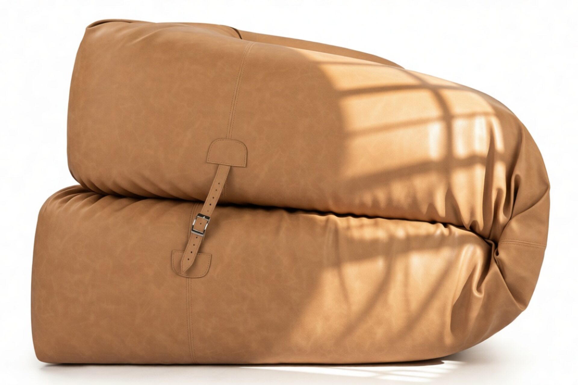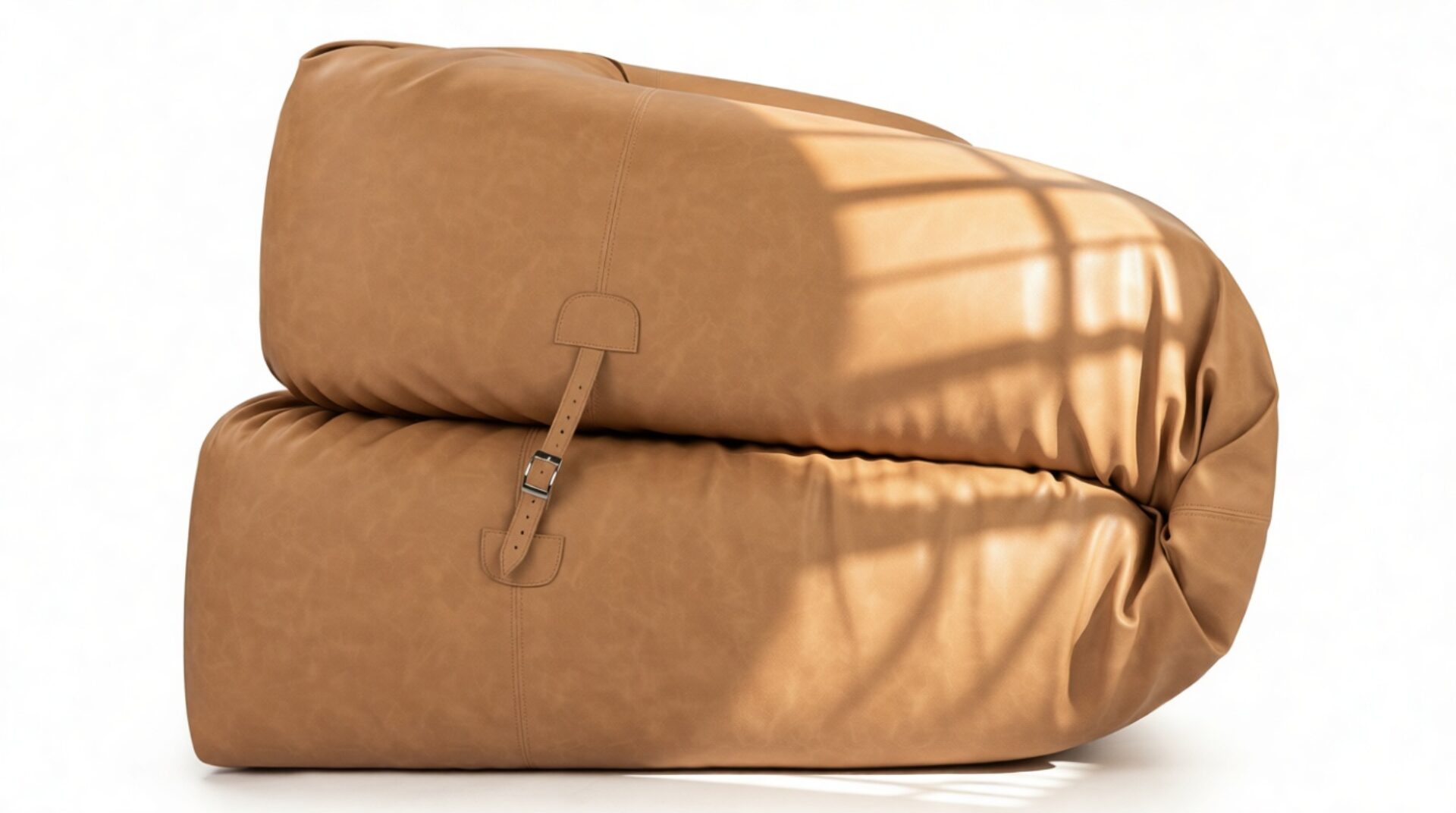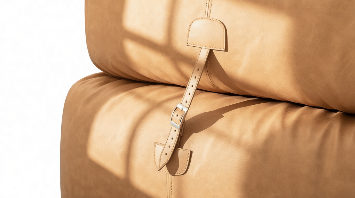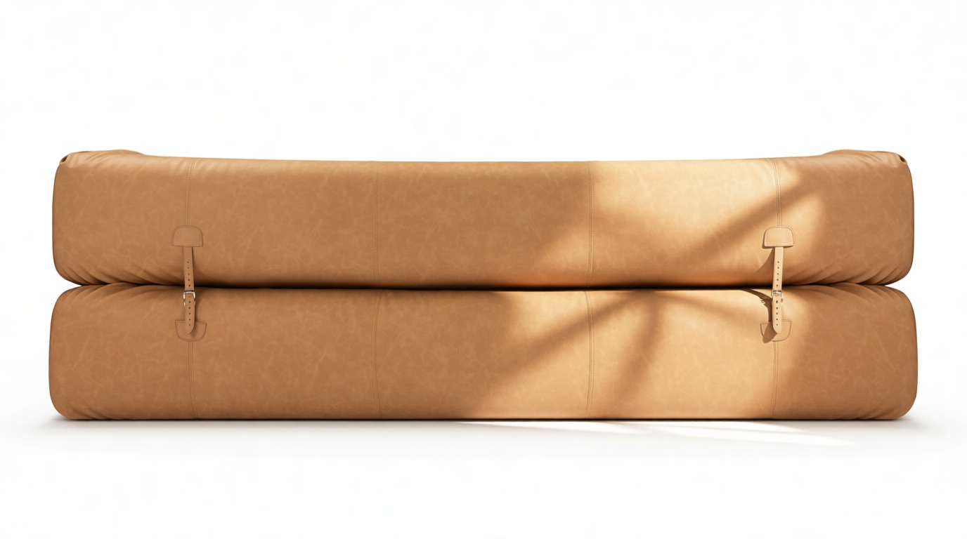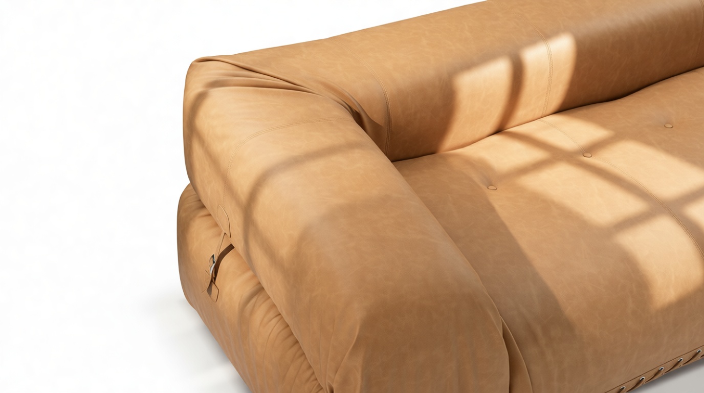 This sofa's aesthetic seamlessly blends contemporary coziness with vintage modular influences, striking a harmonious juxtaposition between contemporary elegance and a relaxed, well-loved appeal. Thoughtful details such as the leather strap and buckle securing its rolled arms highlight the supple, flexible quality of the materials, while the industrial-style lacing introduces a handcrafted, almost artisanal touch.