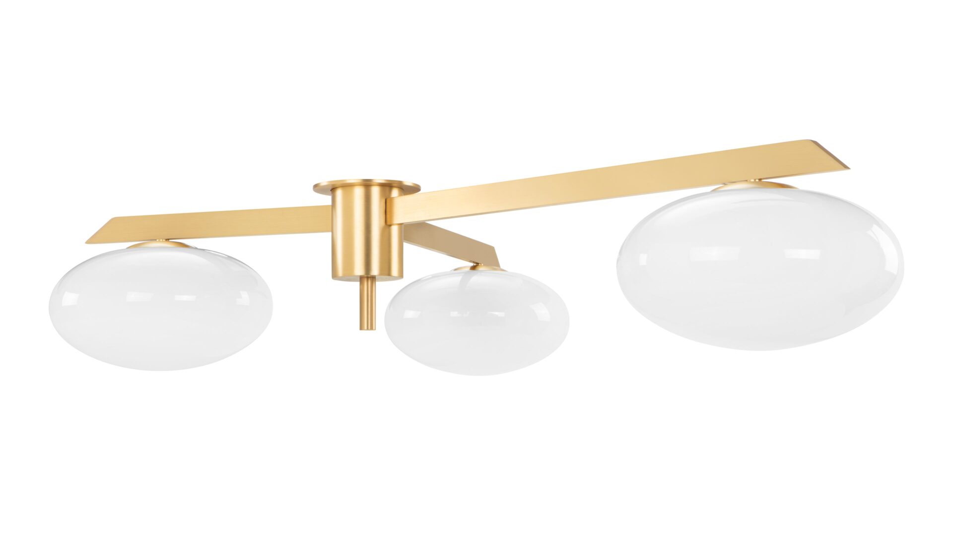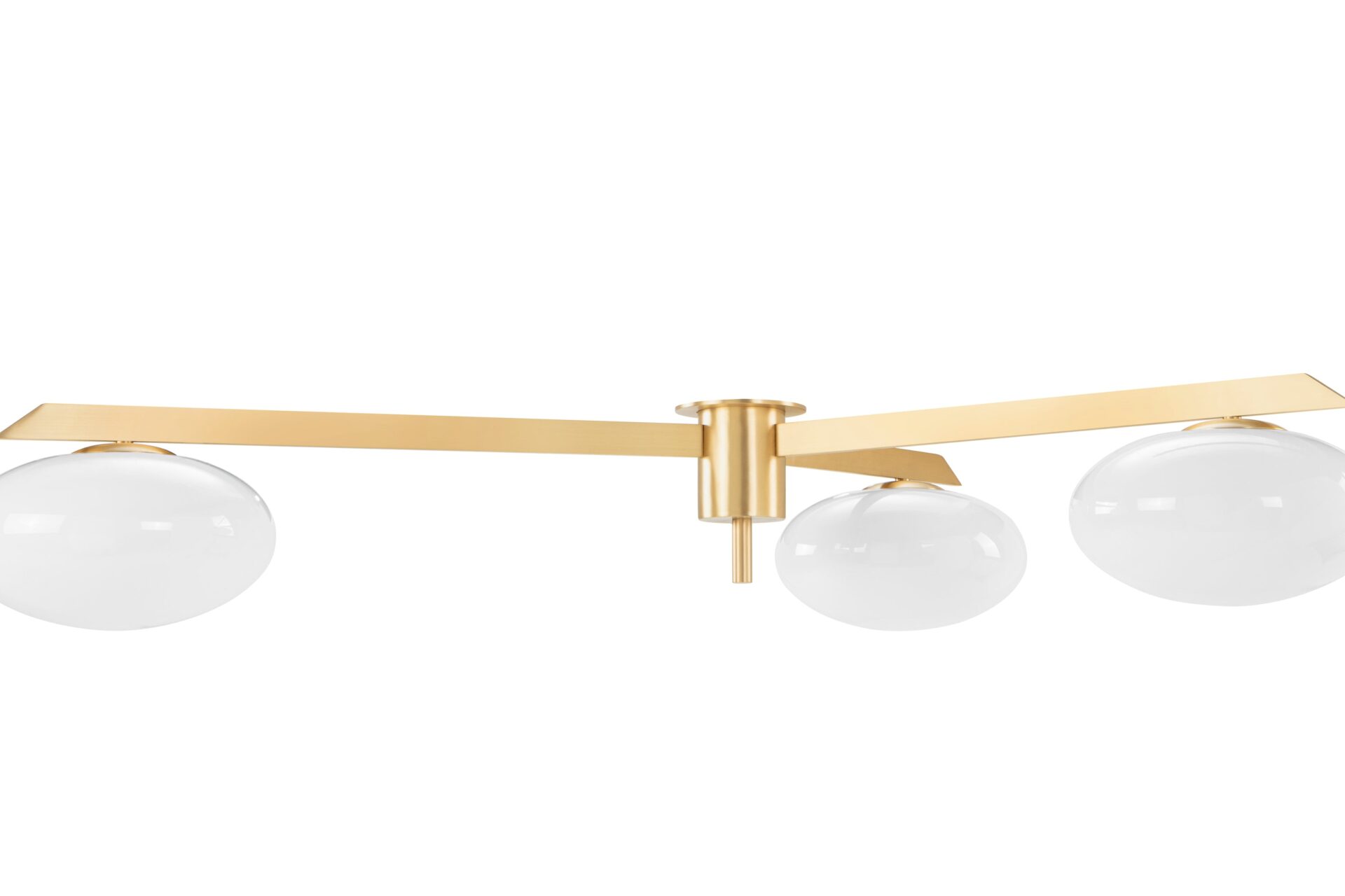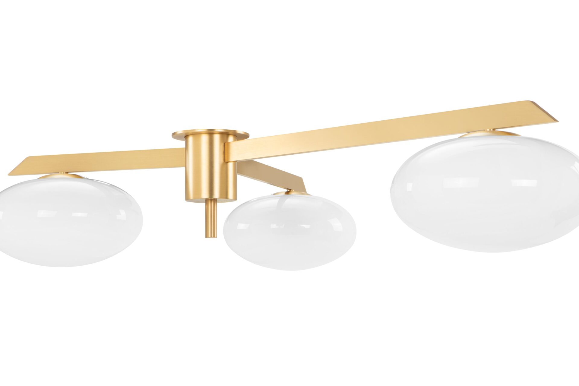 Presenting the Angelo Lelli Three Arm Ceiling Lamp, an enduring representation of mid-century lighting design. Meticulously crafted with keen attention to detail, this exquisite ceiling lamp encapsulates the core of modernist aesthetics while harmoniously fusing practicality and artistic sophistication. The lamp showcases a sleek and refined design, featuring three elegantly curved arms extending from a central hub to form a visually captivating symmetry that effortlessly captivates in any setting. The delicate equilibrium between the metal frame and opaline glass globes creates a gentle and welcoming illumination, casting a cozy radiance that enriches the atmosphere of the surrounding space.