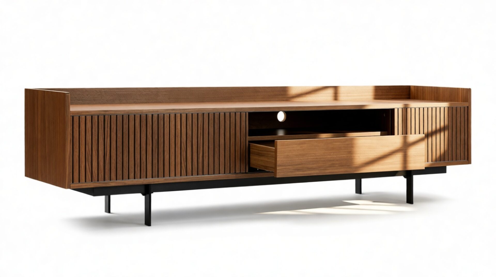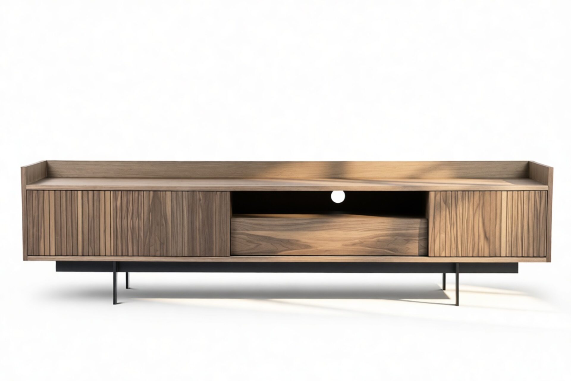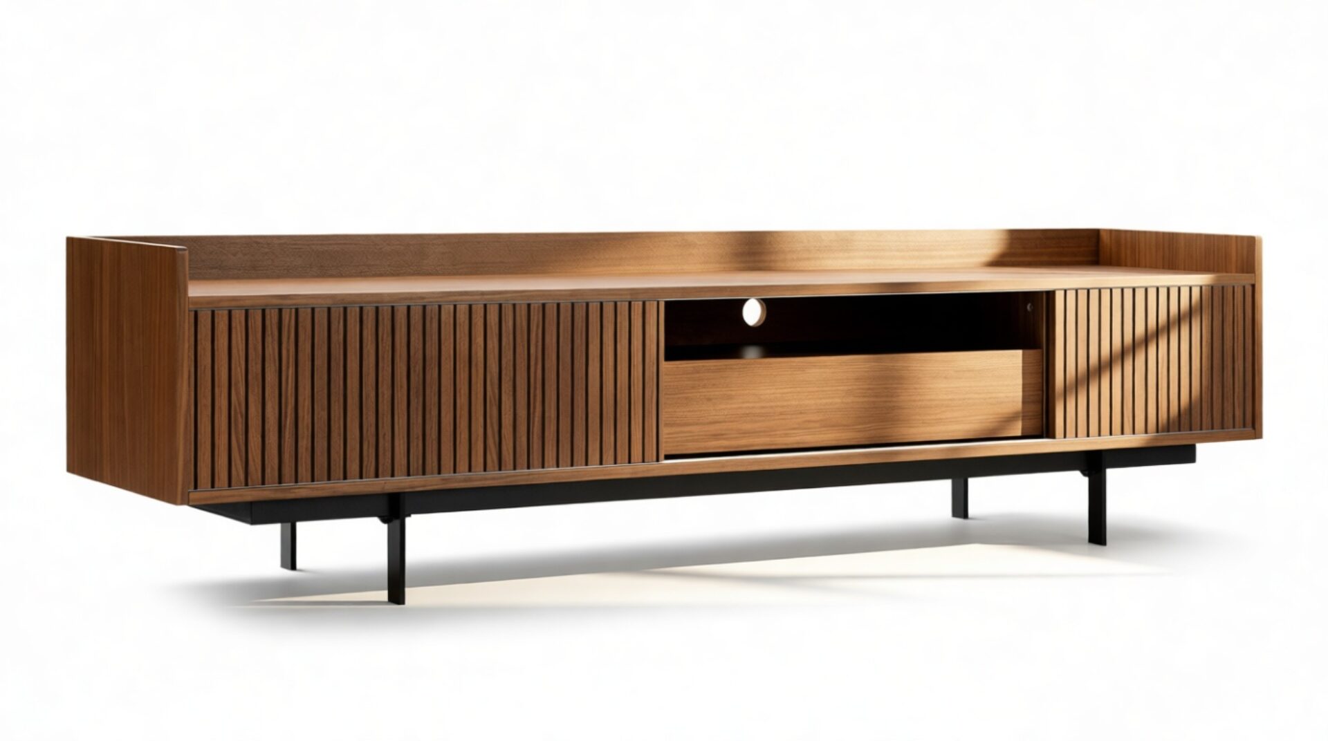 Elevate your space with the timeless appeal of the Angelus Console. Its broad walnut frame with vertical slats on the doors exudes sophistication while the sleek legs add an airy touch. Featuring a full-width shelf, drawer, and cable hole for discreet organization and elegant display options, this console offers stylish practicality and flexible storage solutions.