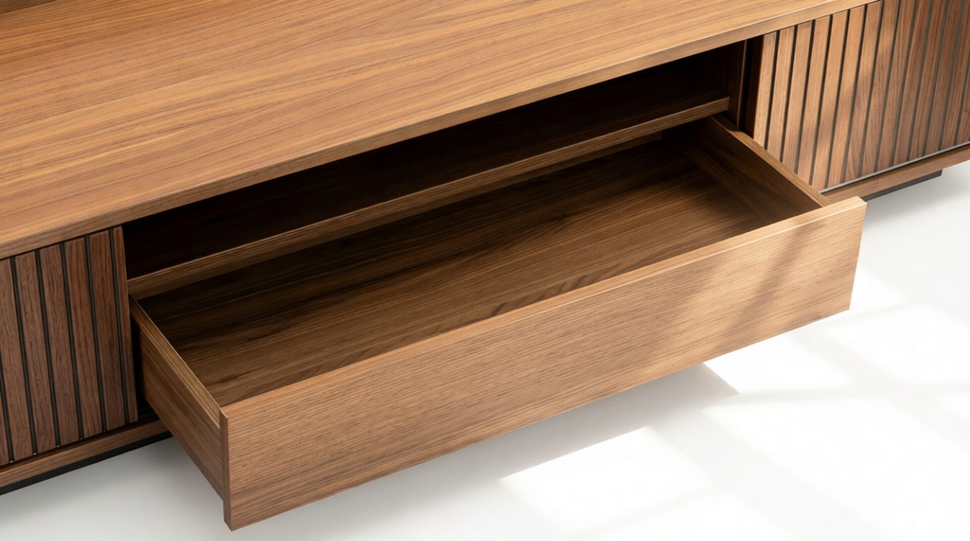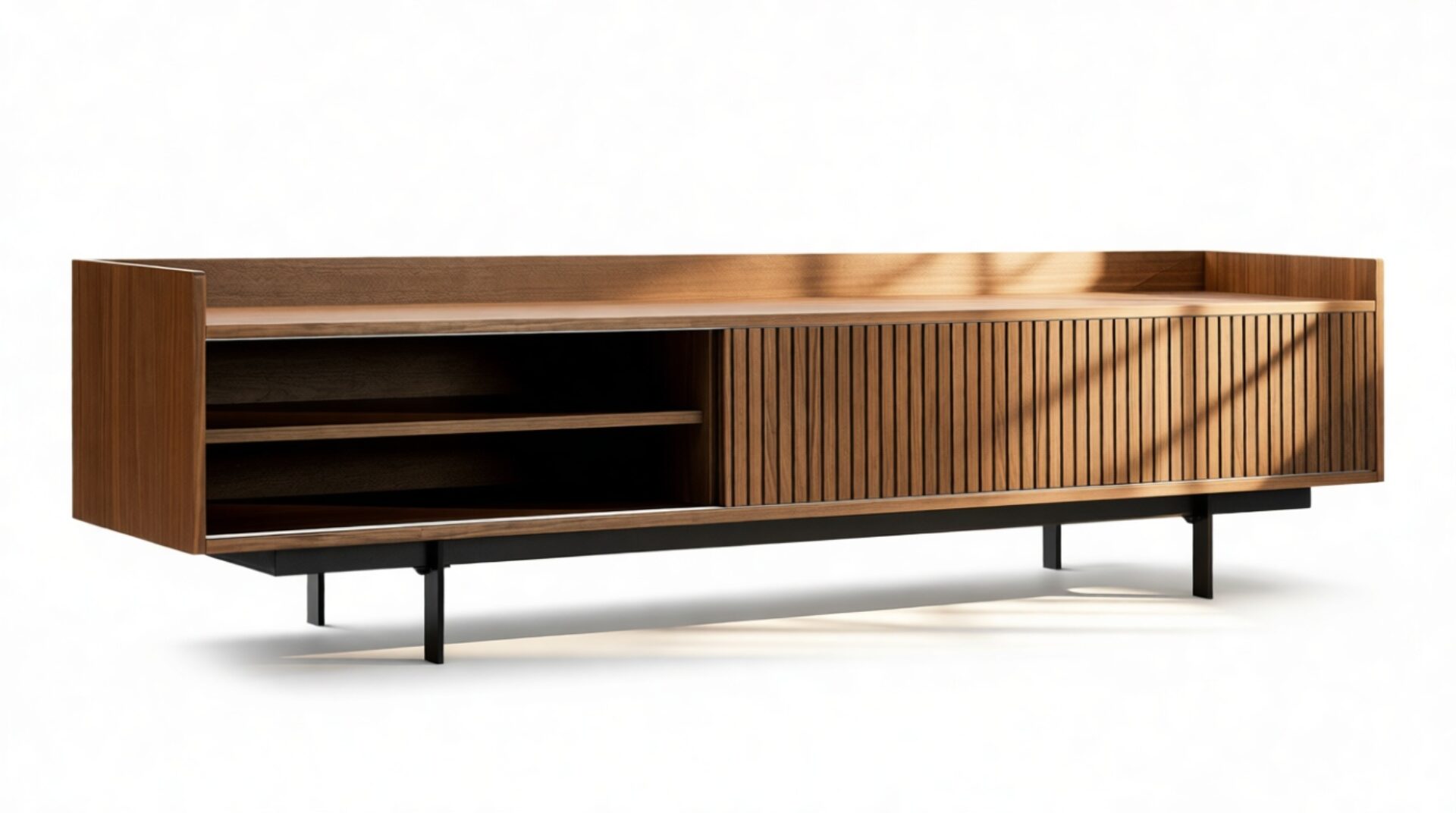 The doors of the console effortlessly slide along a track, allowing easy access to the internal storage space while also offering various styling options. The sleek and slender legs elevate the body, imparting a sense of lightness to the overall design.