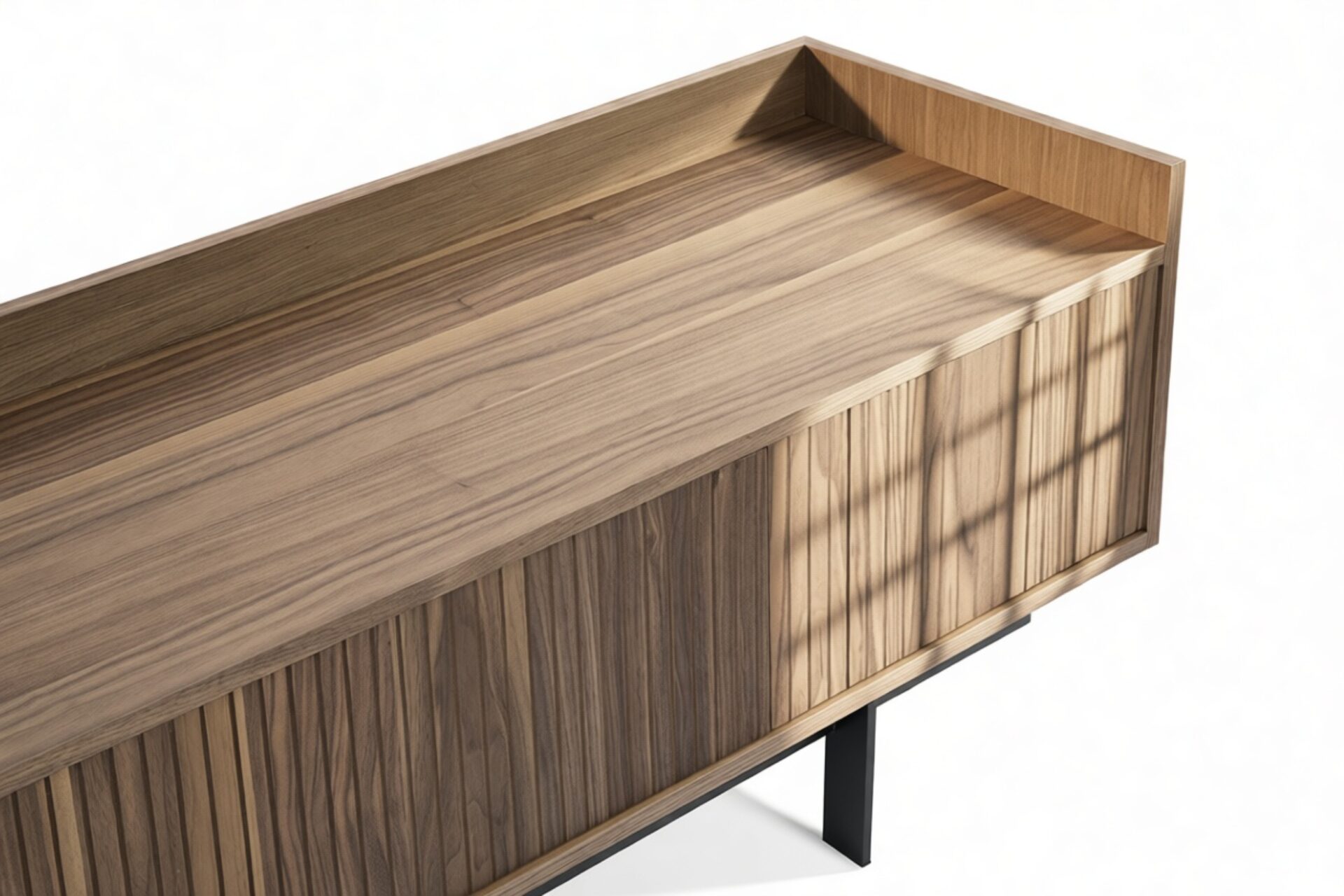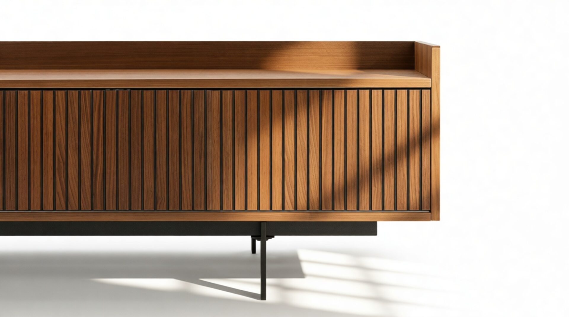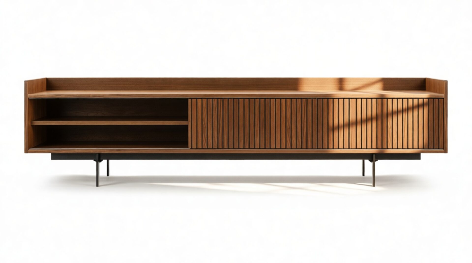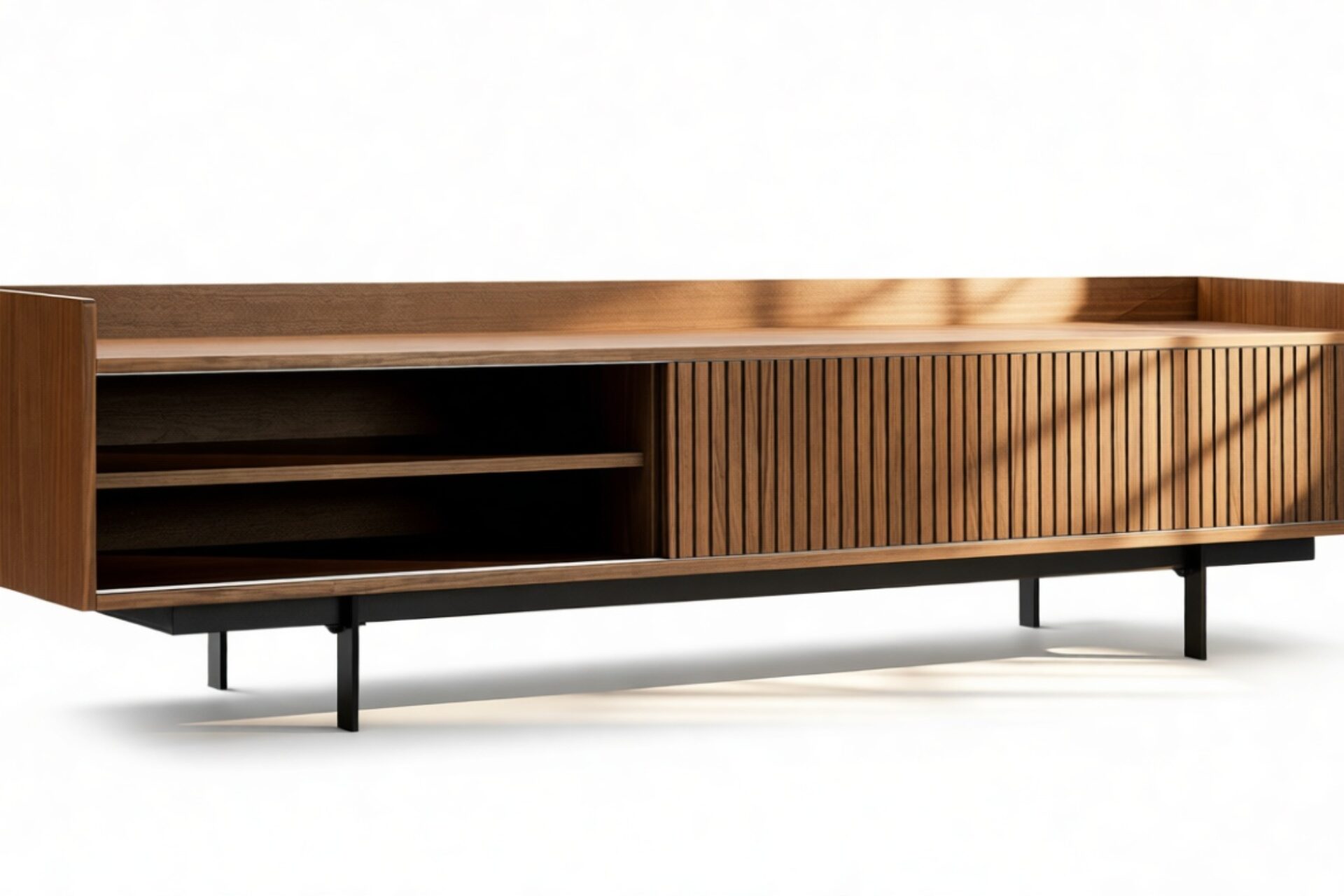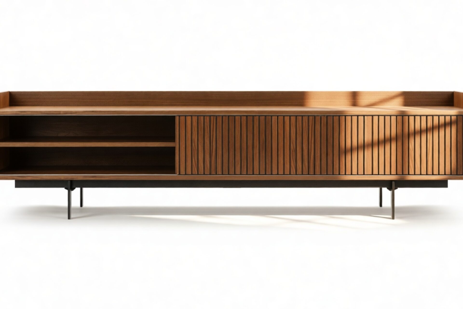 Discover the timeless appeal of the Angelus Console, showcasing a sophisticated design featuring a broad walnut frame detailed with vertical slats on the unit's doors. Effortlessly slide the doors along the track to reveal the spacious interior, while also presenting unique styling possibilities. Elevated by sleek, slender legs, this console exudes a sense of airiness.