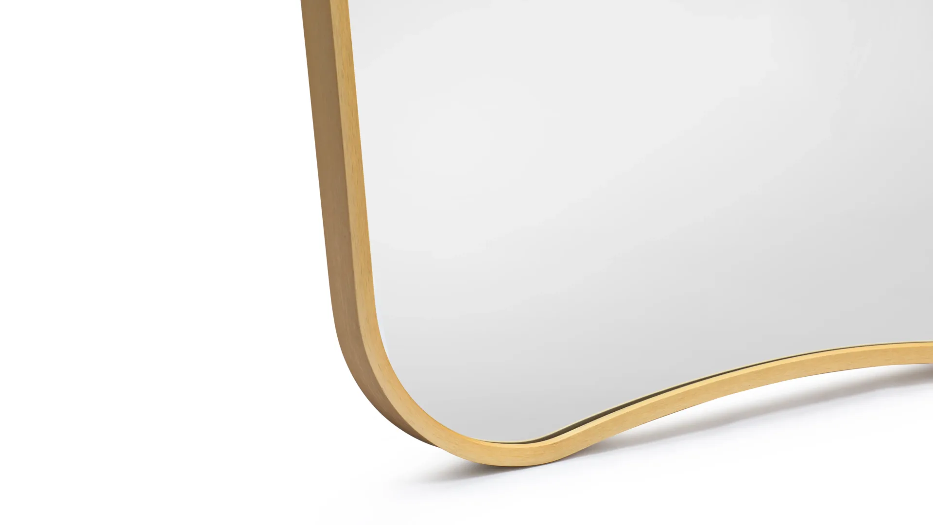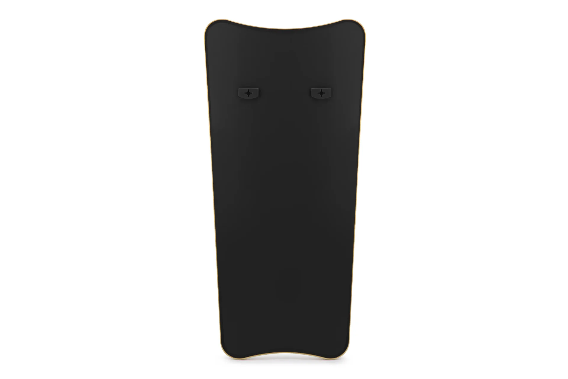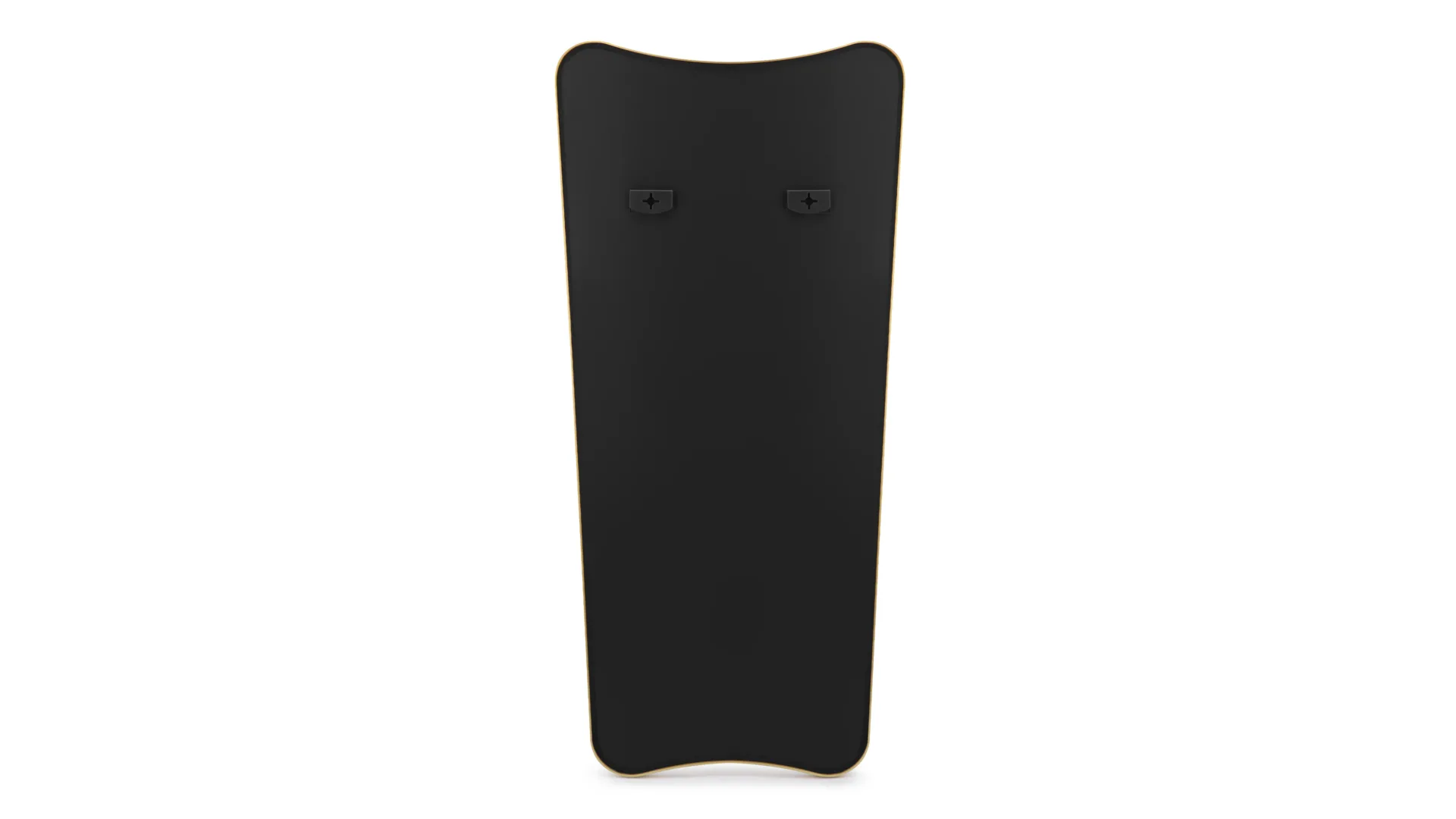 Its elongated, curved form is framed in a slim metal border—available in brass or matte black—for a clean, sculptural presence. The design’s softened edges and linear simplicity lend it a quiet versatility, well-suited to both minimalist and more eclectic interiors.