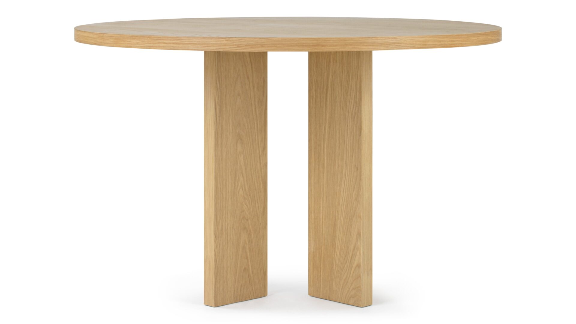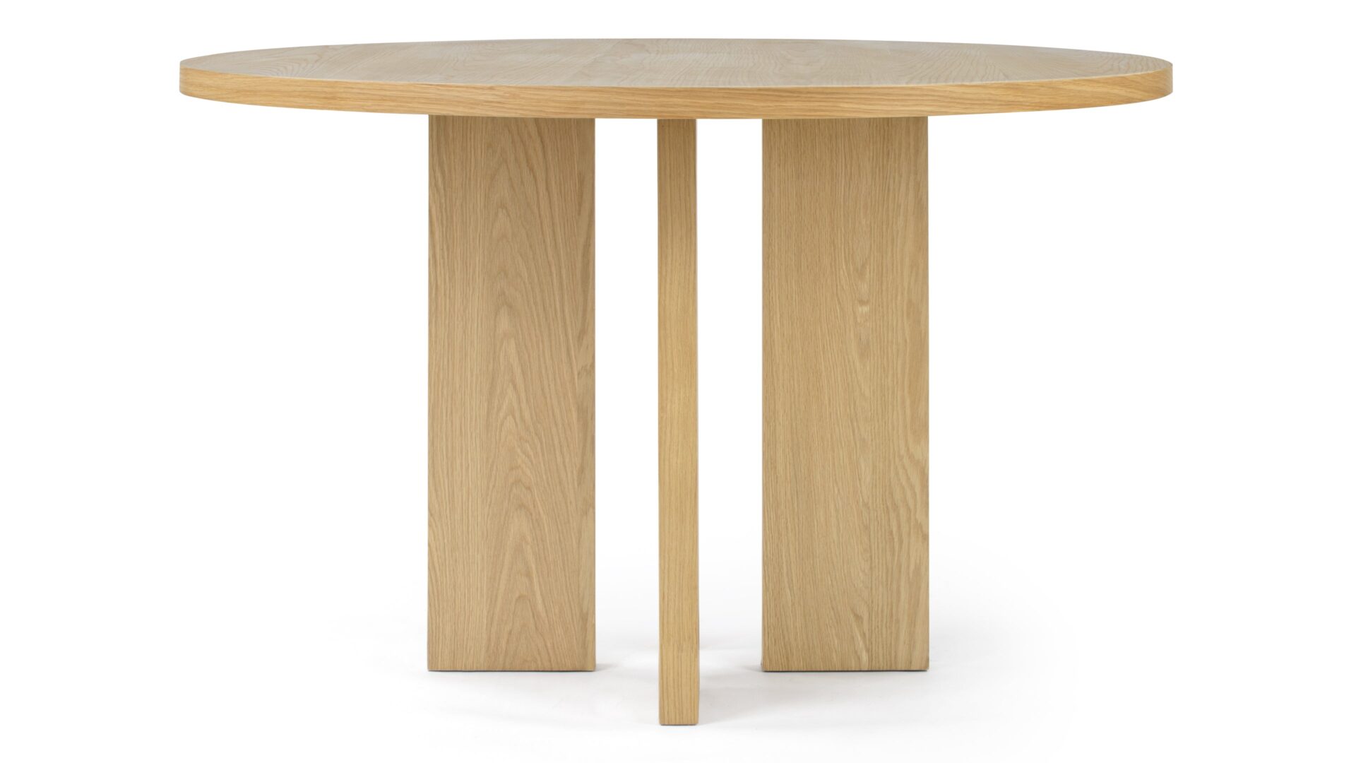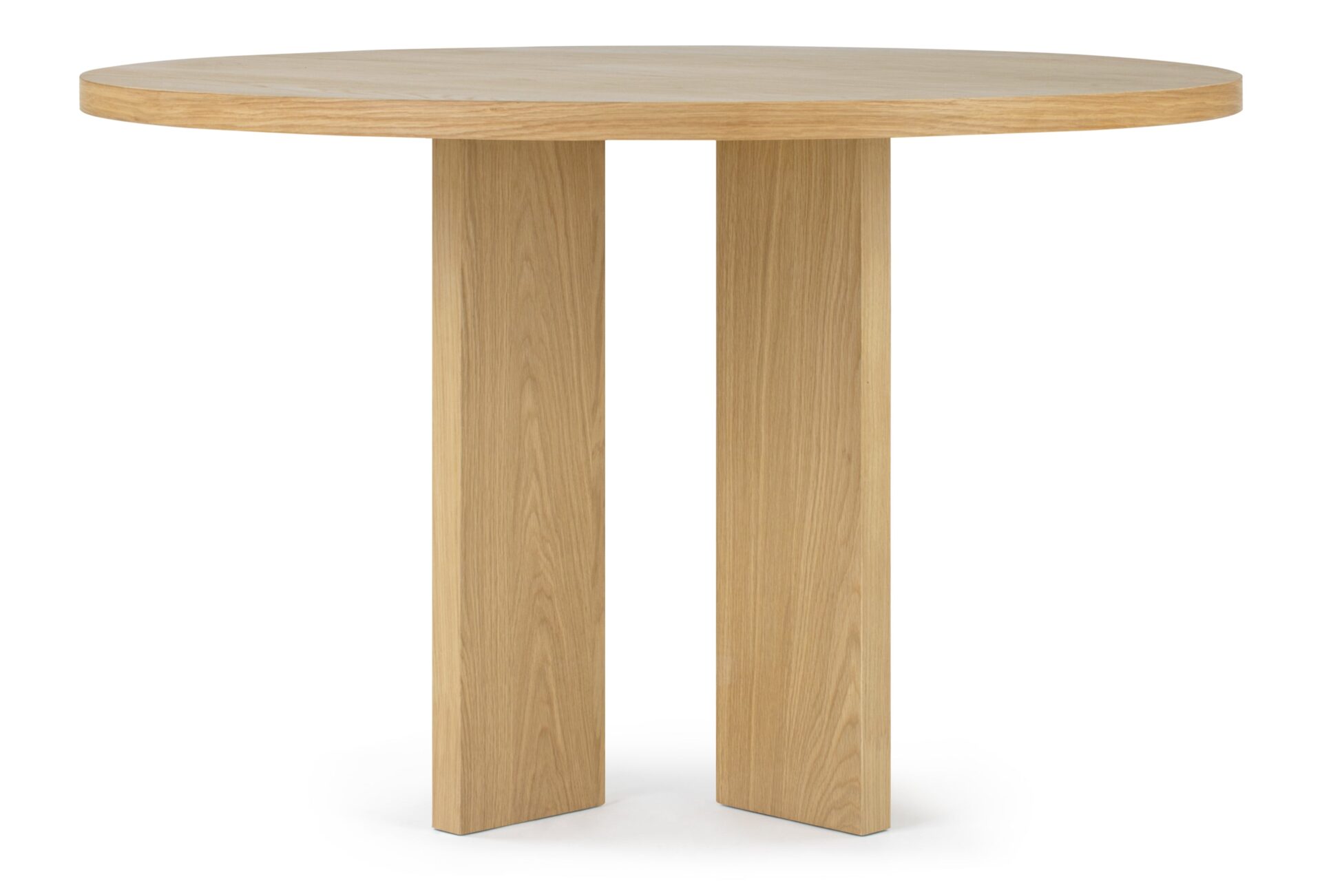 Discover the captivating Arlon Dining Table, meticulously crafted to marry contemporary design with practicality. Its distinctive plank-style legs add a touch of character to this round centerpiece, made from robust solid oak legs and an oak veneer tabletop. The light finish accentuates the appealing grain patterns, infusing a cozy feel into any dining area. Embracing a blend of modernity and natural beauty, the Arlon Dining Table appeals to those with a refined taste. Its light color scheme not only enhances its visual charm but also allows it to effortlessly mesh with diverse interior themes. Seating up to six, this table promises to be the focal point of your dining room.