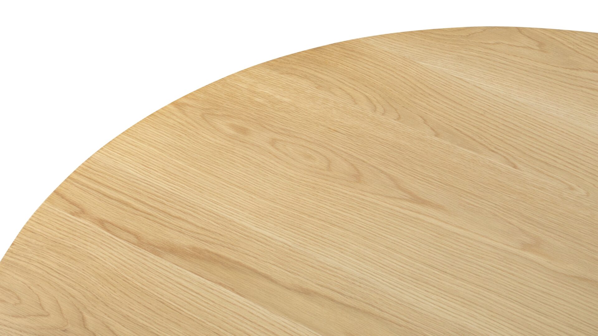 Introducing the Arlon Dining Table, showcasing a modern design characterized by its distinctive round shape and plank-style legs. Its warm, light-colored tone accentuates the striking grain pattern, adding a touch of natural sophistication to any room.