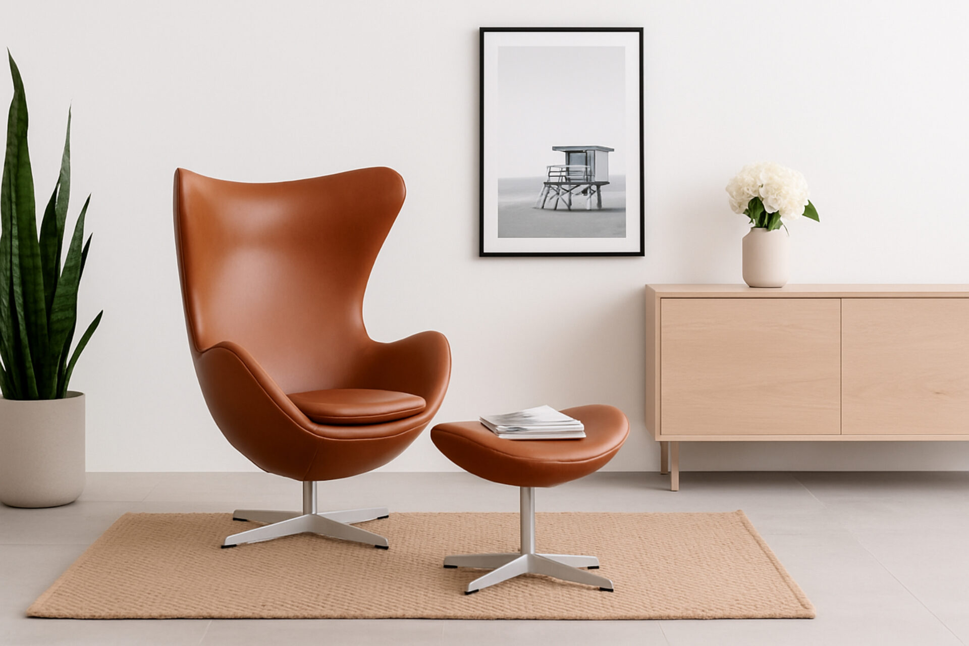 Experience the timeless elegance of the Egg chair and matching stool, evoking the iconic design of the 1950s. Crafted for ultimate comfort and sophistication, the stool complements the chair's sleek contours and premium upholstery. Elevate your space with a harmonious set that captures the essence of 1950s design. Customize with Tan Premium Leather for a luxurious touch.