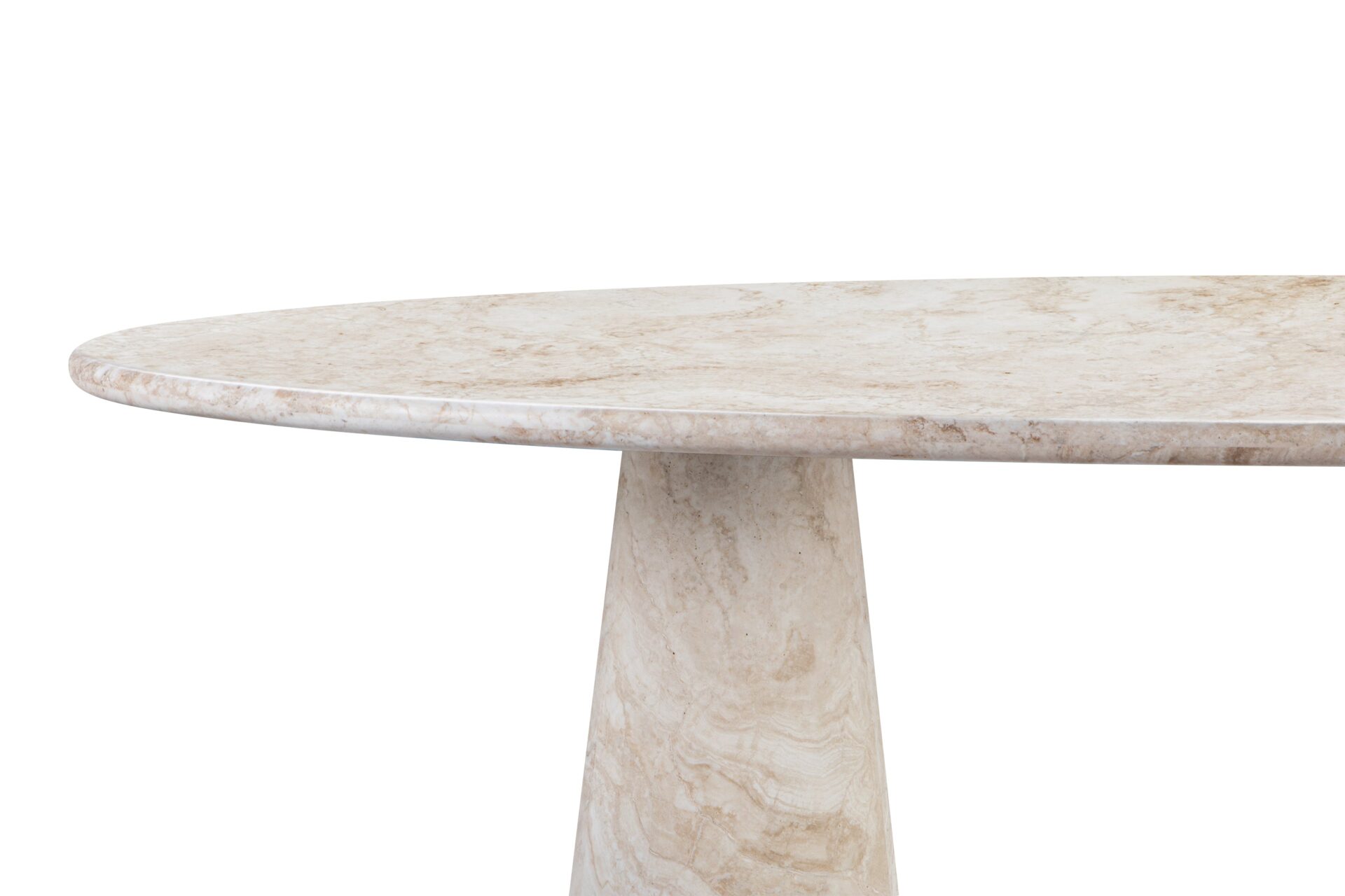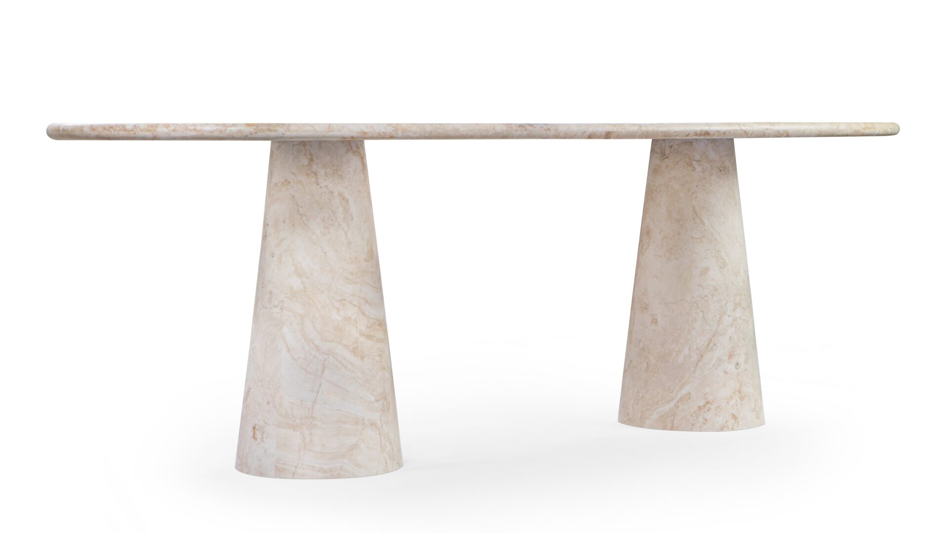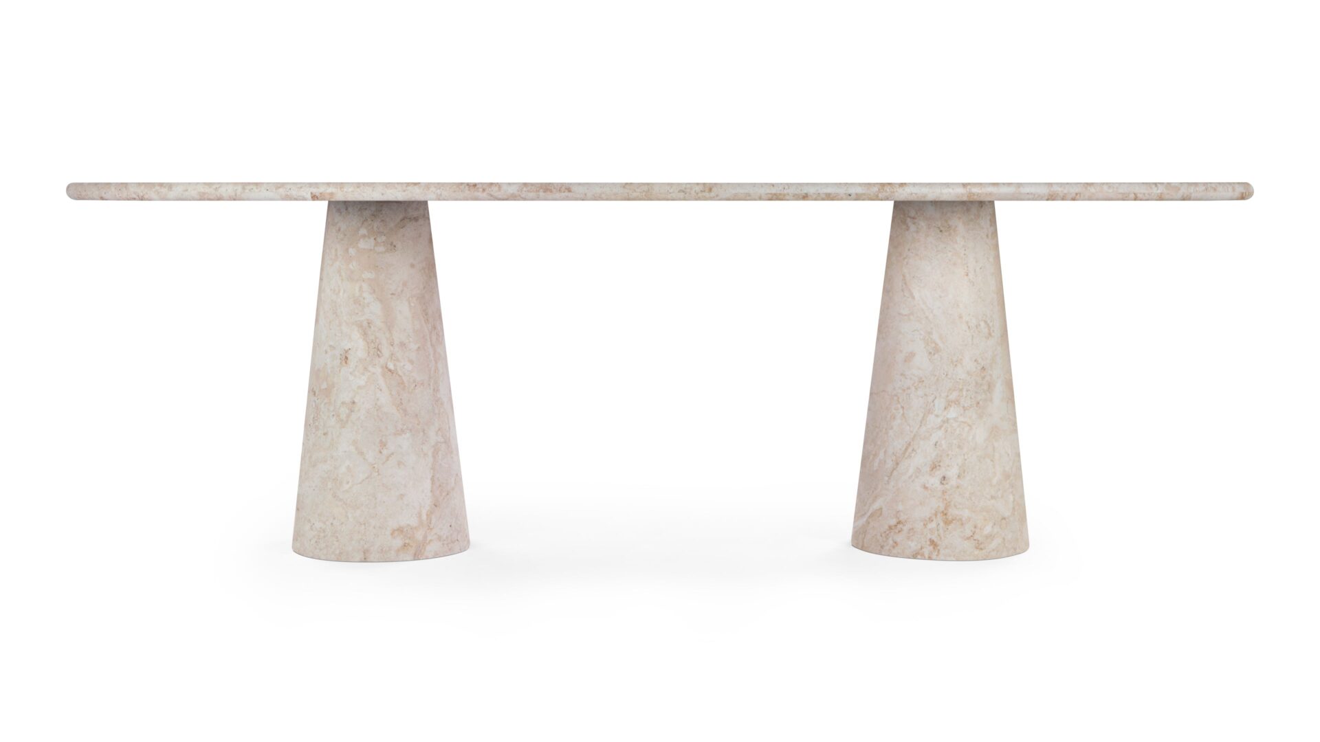 The tapered pedestals of the product enhance the table's visual harmony, introducing a fluid and sculptural elegance that complements its overall aesthetic. Every detail of the product contributes to an atmosphere that transcends ordinary dining experiences, celebrating the fine craftsmanship and attention to detail.