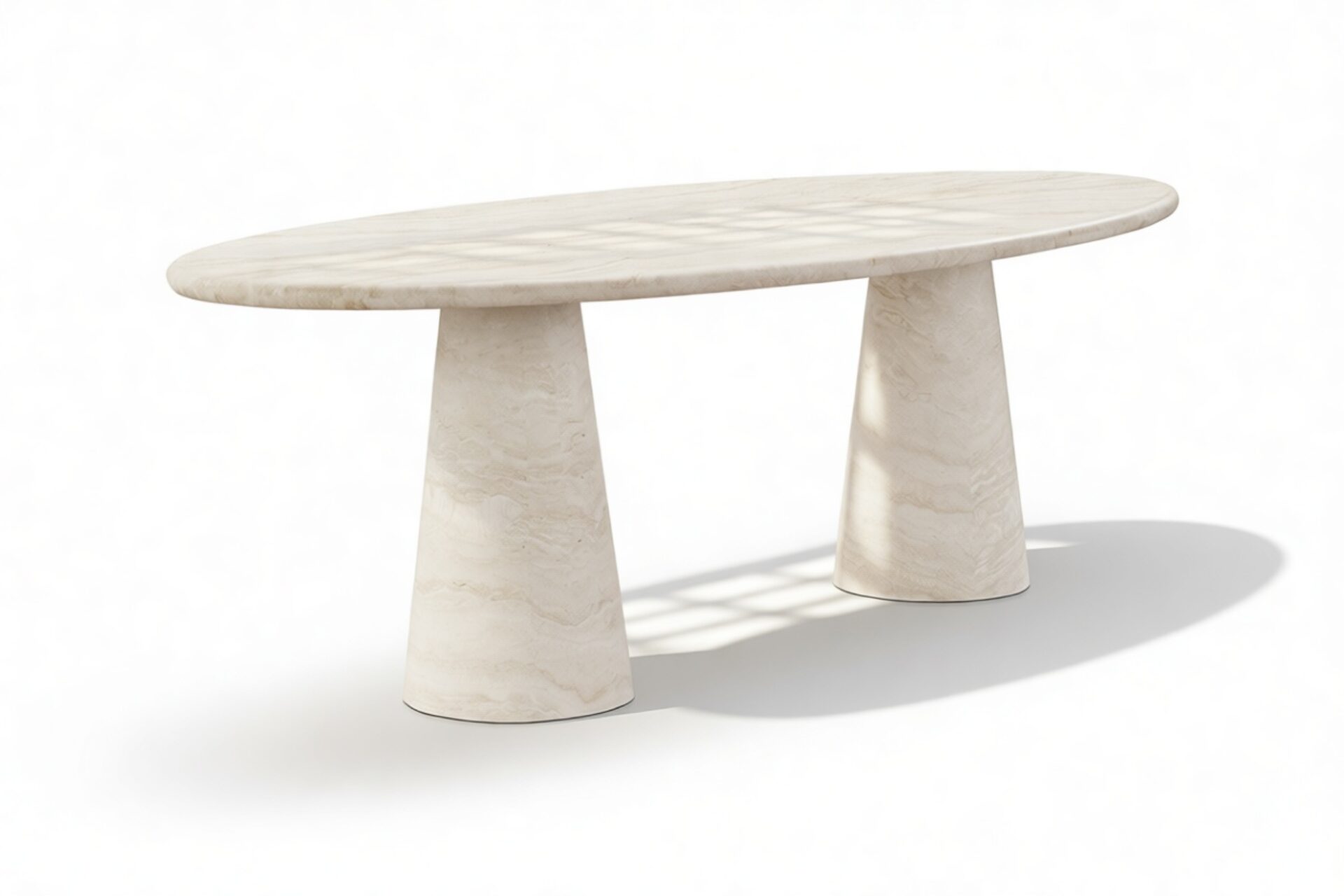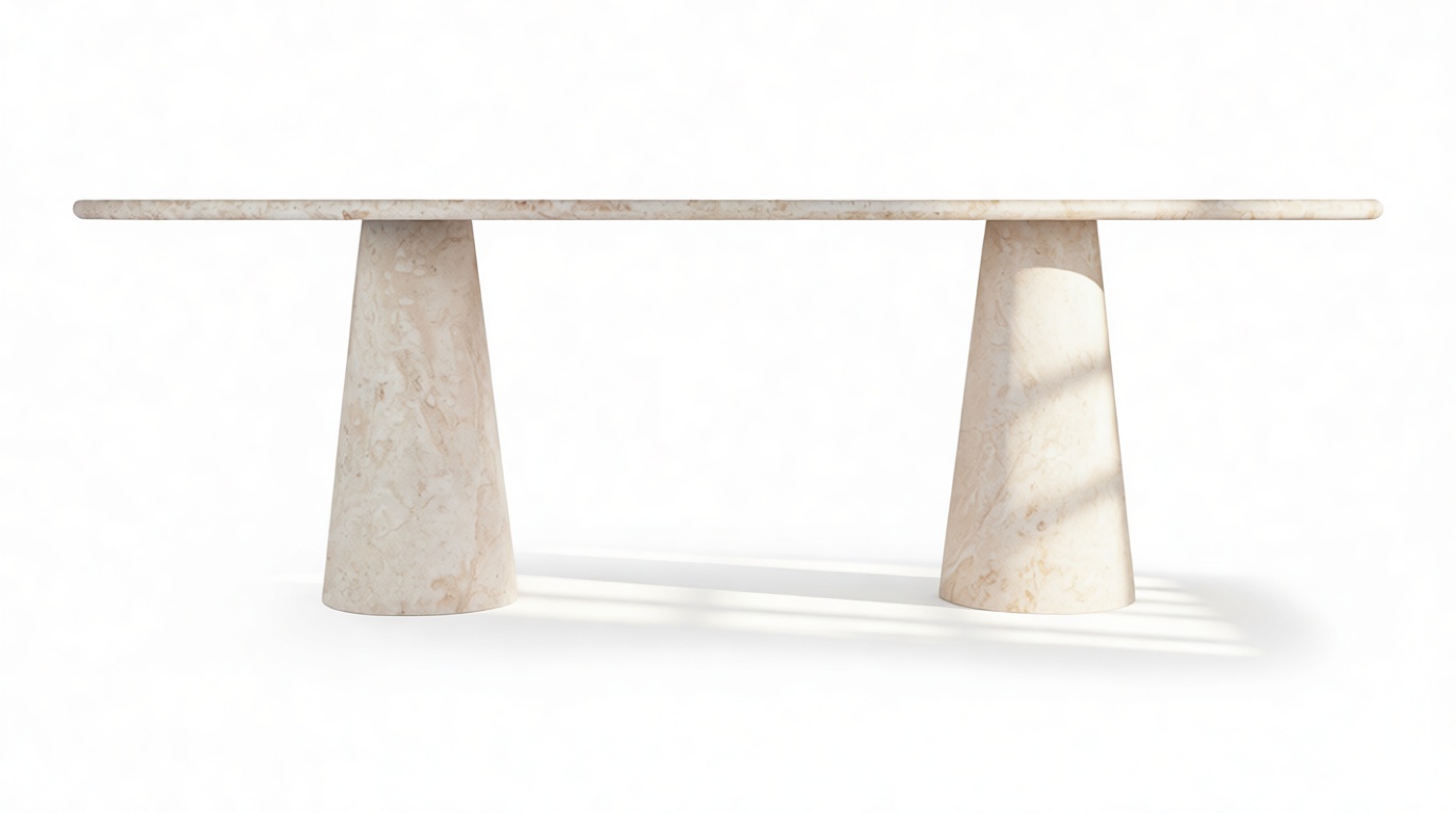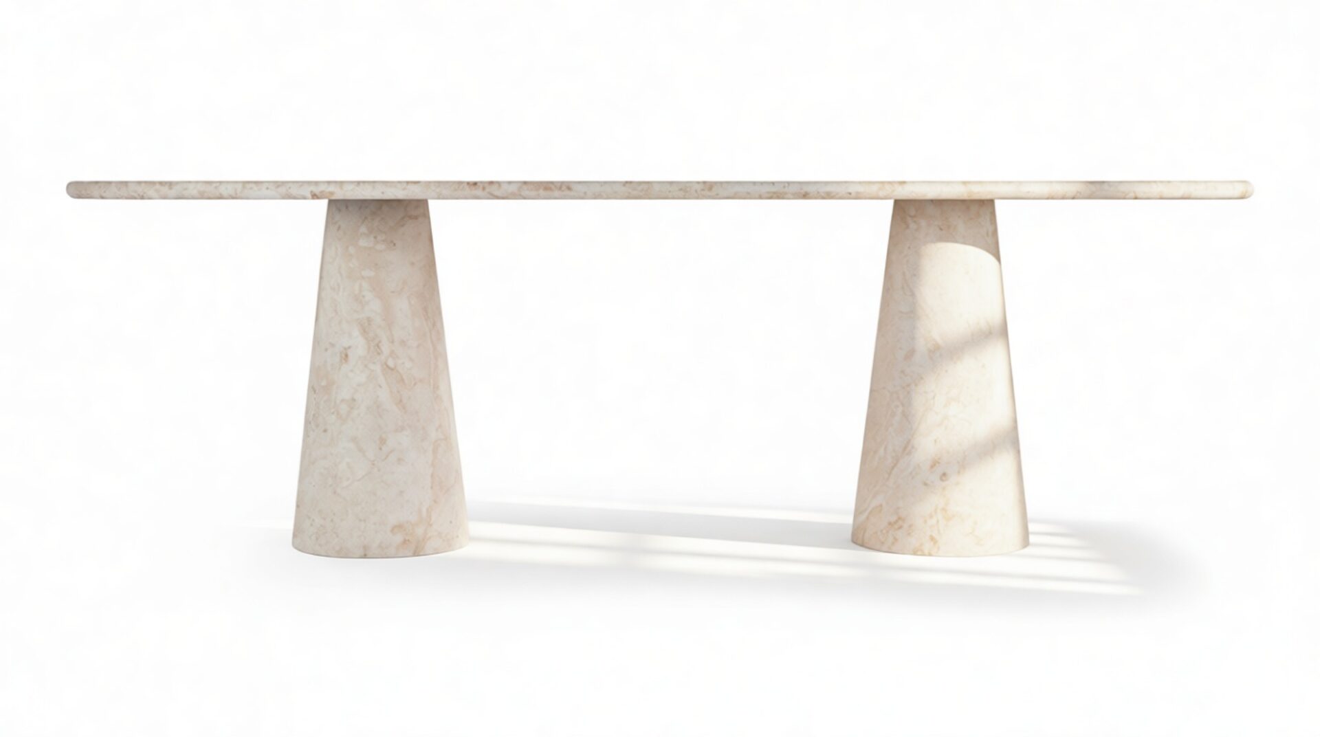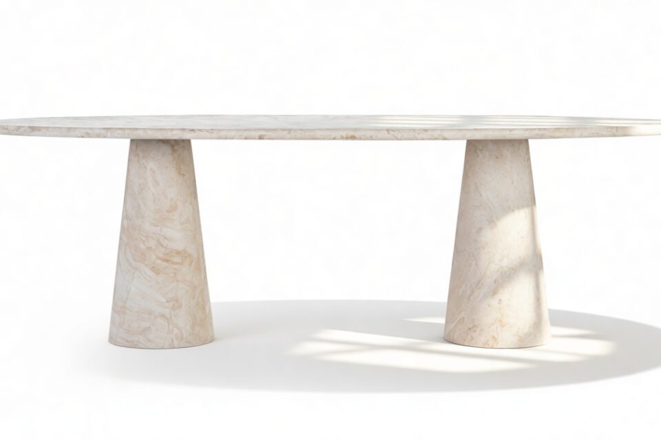 The tapered pedestals of the product enhance the table's visual harmony, introducing a fluid and sculptural elegance that complements its overall aesthetic. Every detail of the product contributes to an atmosphere that transcends ordinary dining experiences, celebrating the fine craftsmanship and attention to detail.