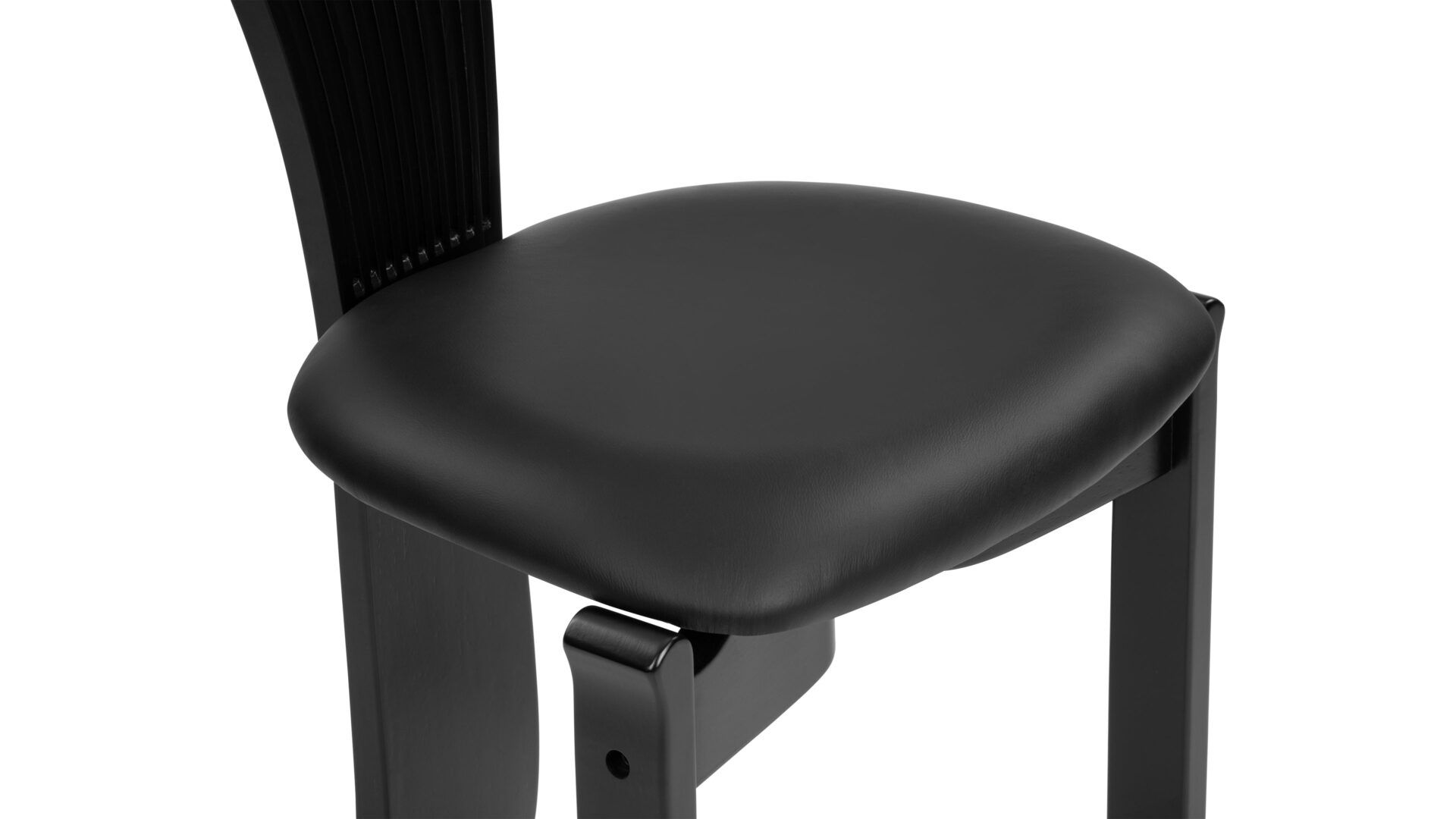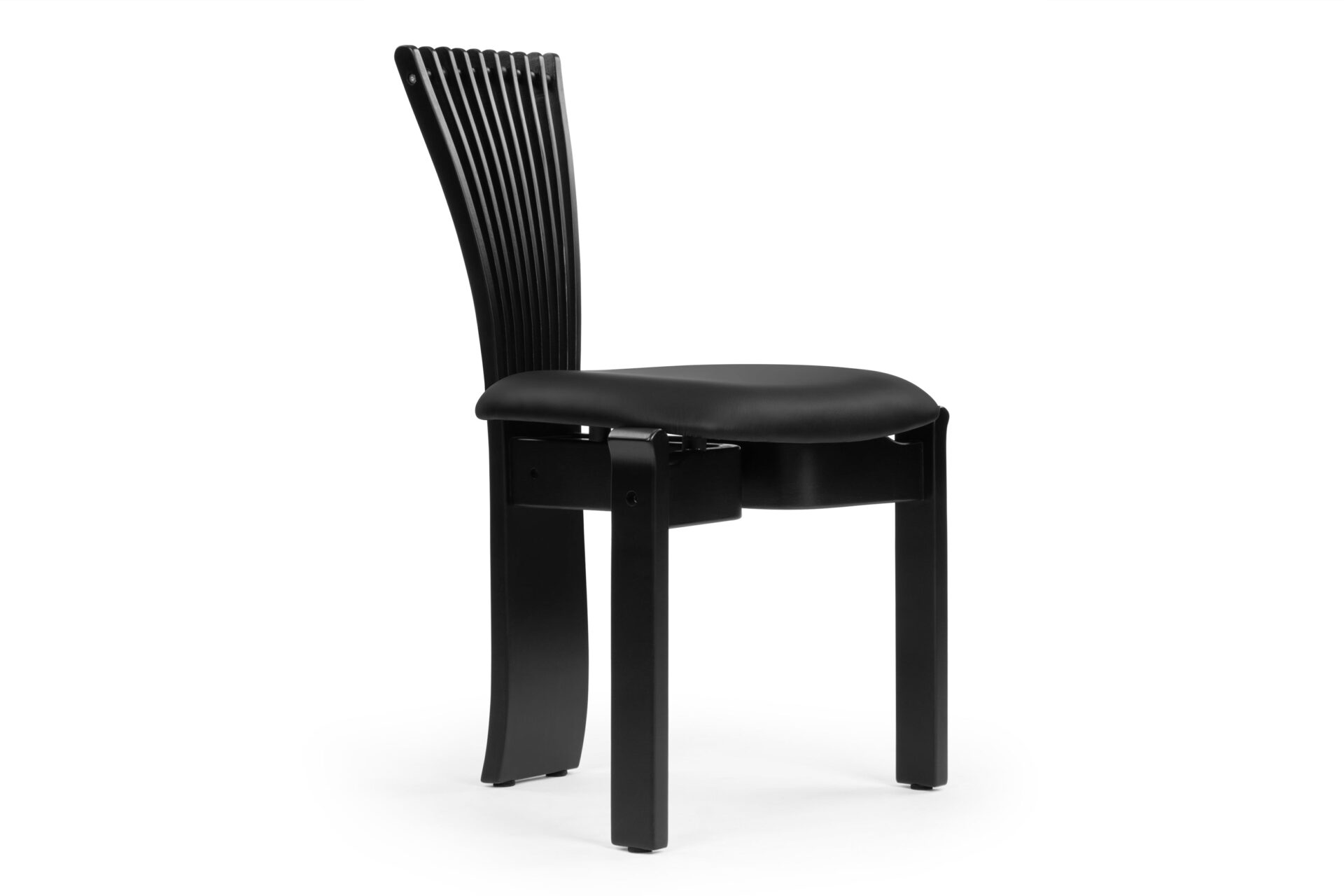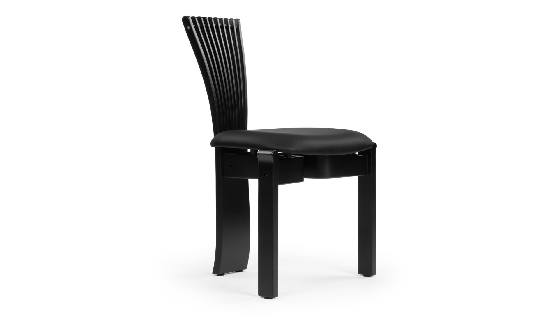 Discover the elegant Asuka Side Chair, a sophisticated creation meticulously fashioned with a beech wood frame and a vegan leather seat. This piece exudes a contemporary allure with its matte black wood finish and a cushioned seat for enhanced comfort. The standout feature of this chair is its distinct backrest comprising gracefully curved wooden elements that elegantly fan out at the top. Enhanced with ball detailing interspersed between each bar, this design seamlessly blends style with relaxation.