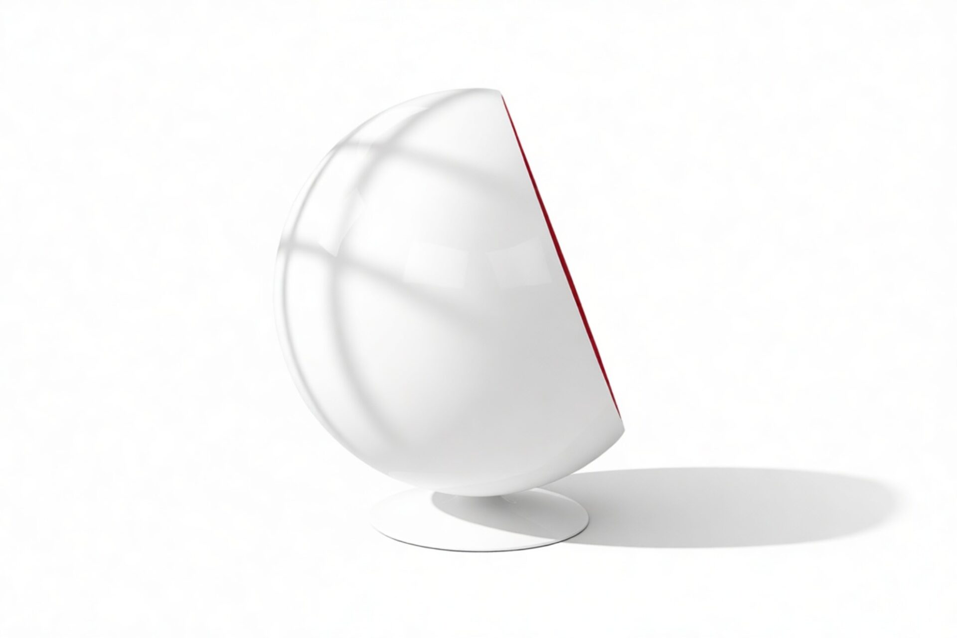 Experience a captivating burst of color with the vibrant upholstery inside the white half-sphere of this unique chair.