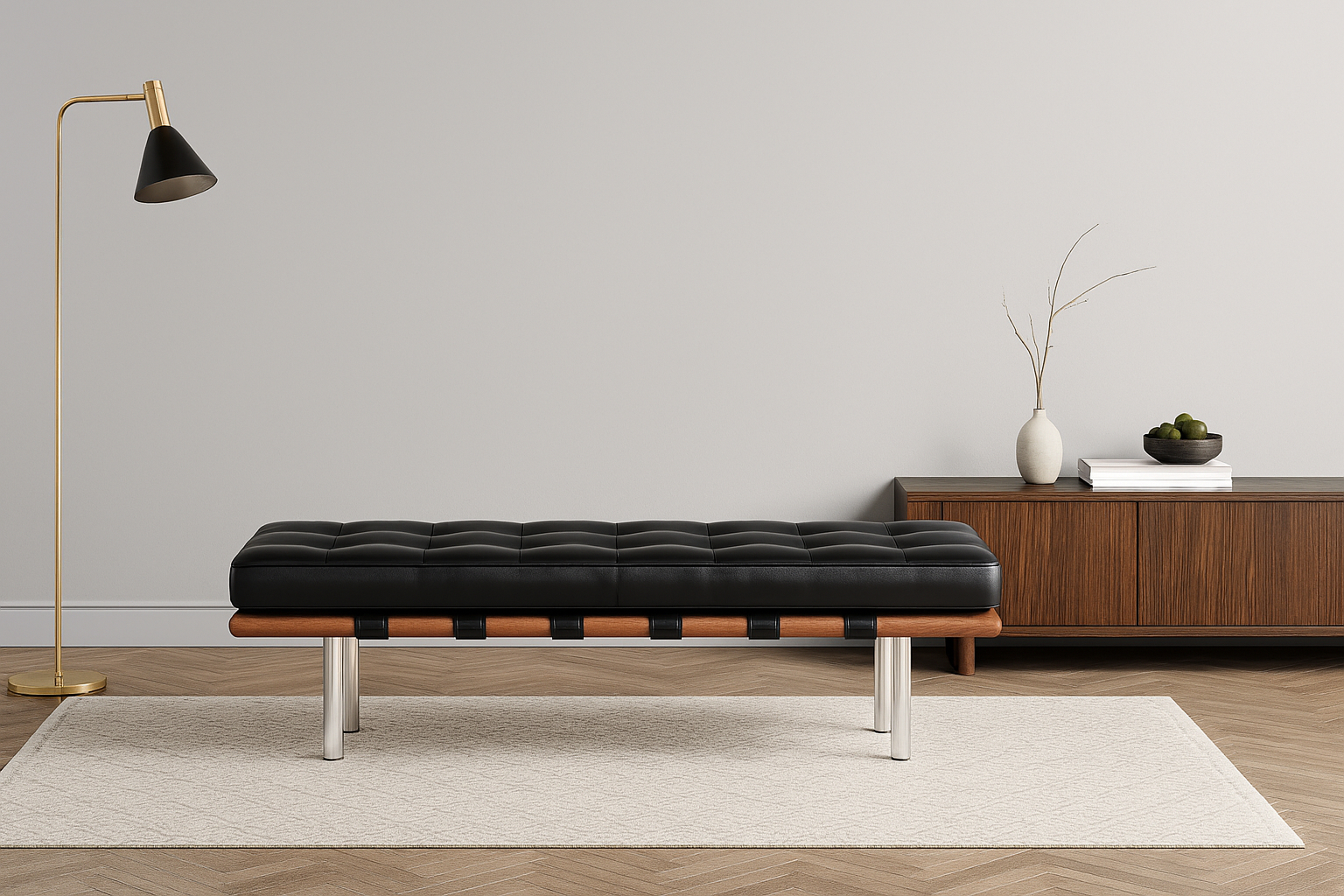 Discover a timeless icon that has evolved into a contemporary essential – the Barcelona Bench. This extraordinary piece of modern furniture design perfectly embodies a minimalist approach. With its sleek lines, unembellished rectangular shape, and focus on functional beauty rather than excessive decoration, the bench is both elegant and practical. Its understated charm makes it a stylish choice for any home.