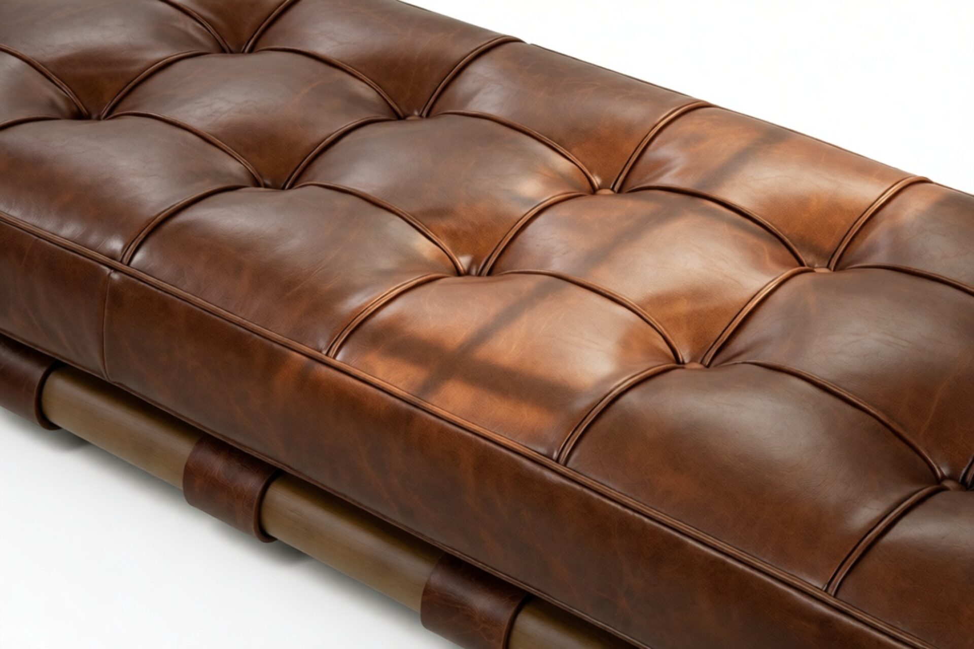 Crafted with top-tier Italian aniline leather and luxurious walnut, the luxurious bench seamlessly combines high-quality materials with a contemporary design aesthetic, ensuring a timeless furniture piece.