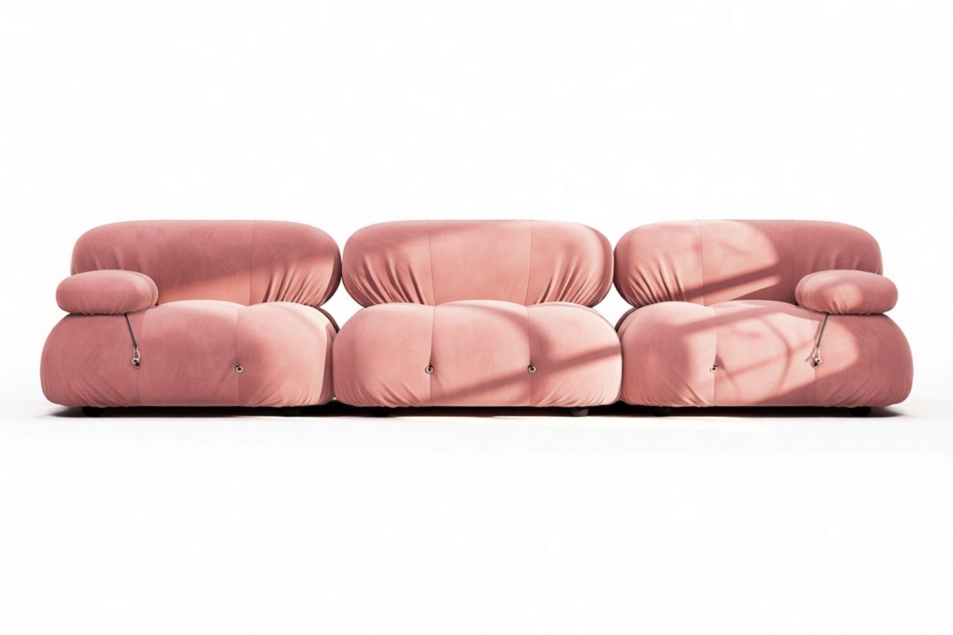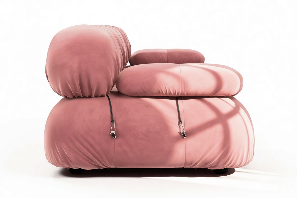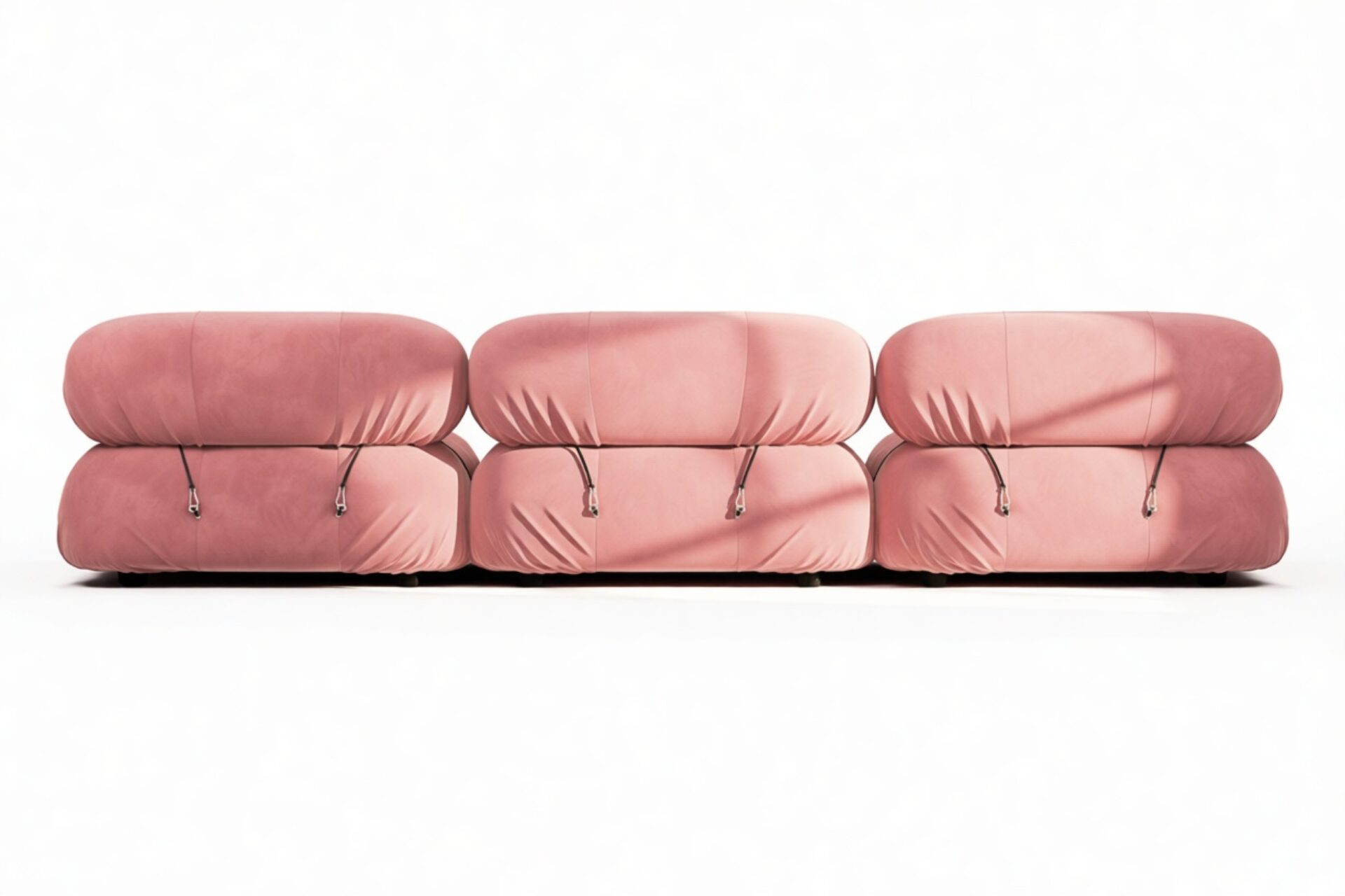 - Modular Instructions: Each section of the Mario Bellini Sofa is modular and is attached with string ties and carabiners. To assemble or rearrange your sofa, simply unclip the carabiners from one ring and attach to a corresponding ring on the module you wish to connect to.
