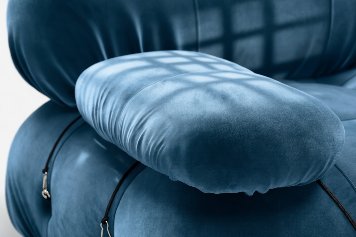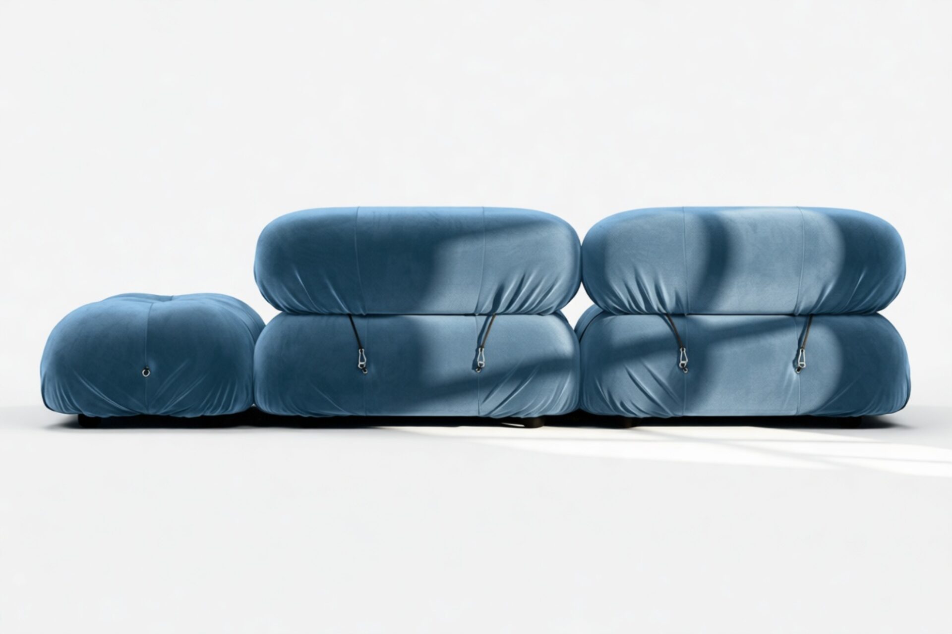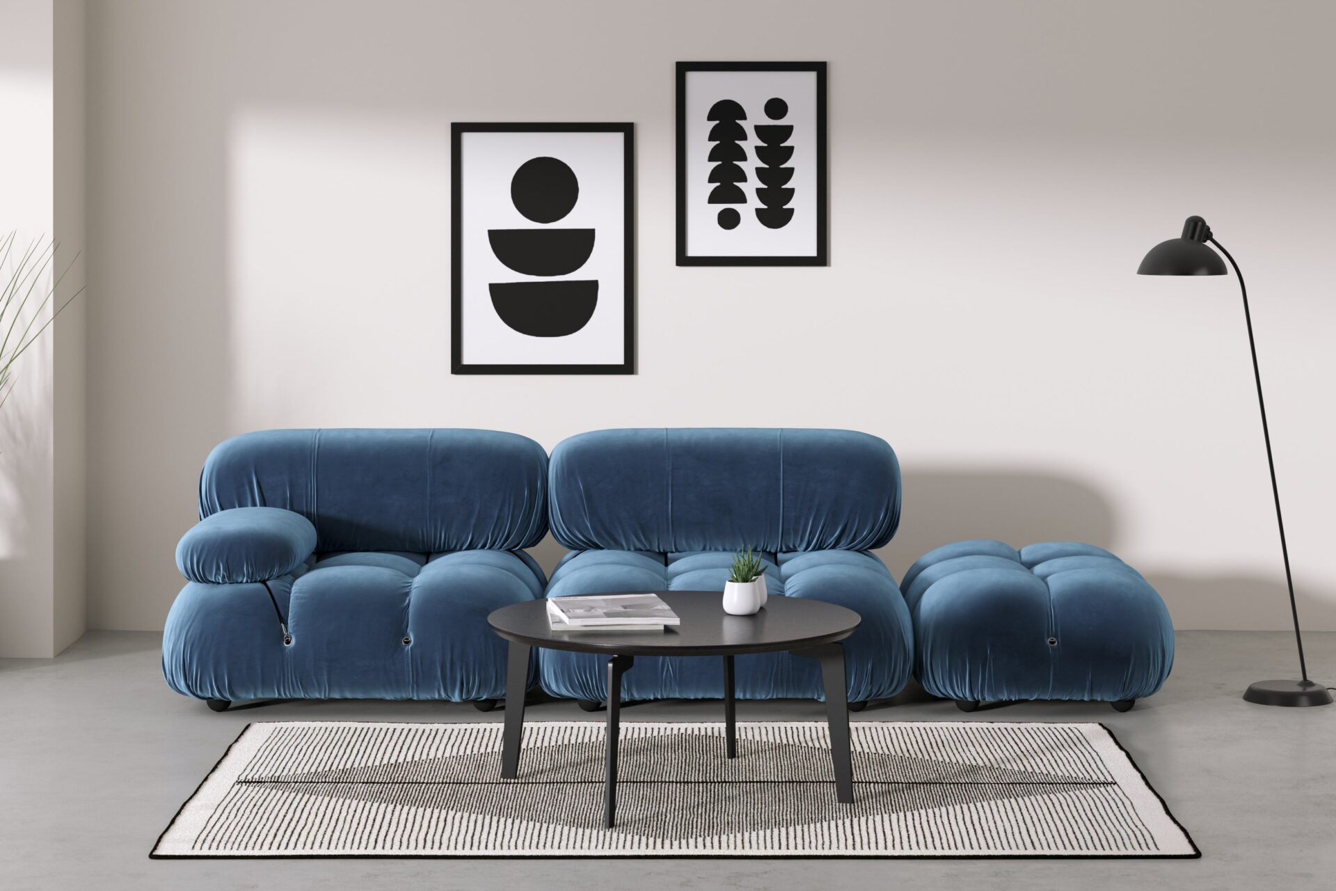 Embrace the retro charm of the 1970s with the Bellini sectional sofa in Aegean Blue Velvet, a tribute to a groovy era of carefree living. Its modular design brings a sense of liberation to your space, allowing for easy customization to match your style and mood. Crafted with a sturdy frame and plush foam, the Bellini exudes relaxed luxury while providing a cozy seating experience.
