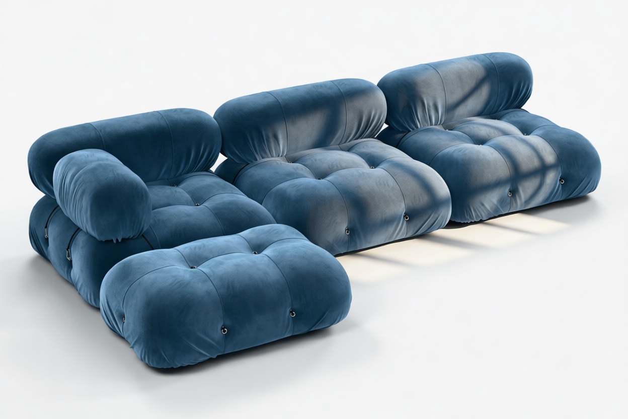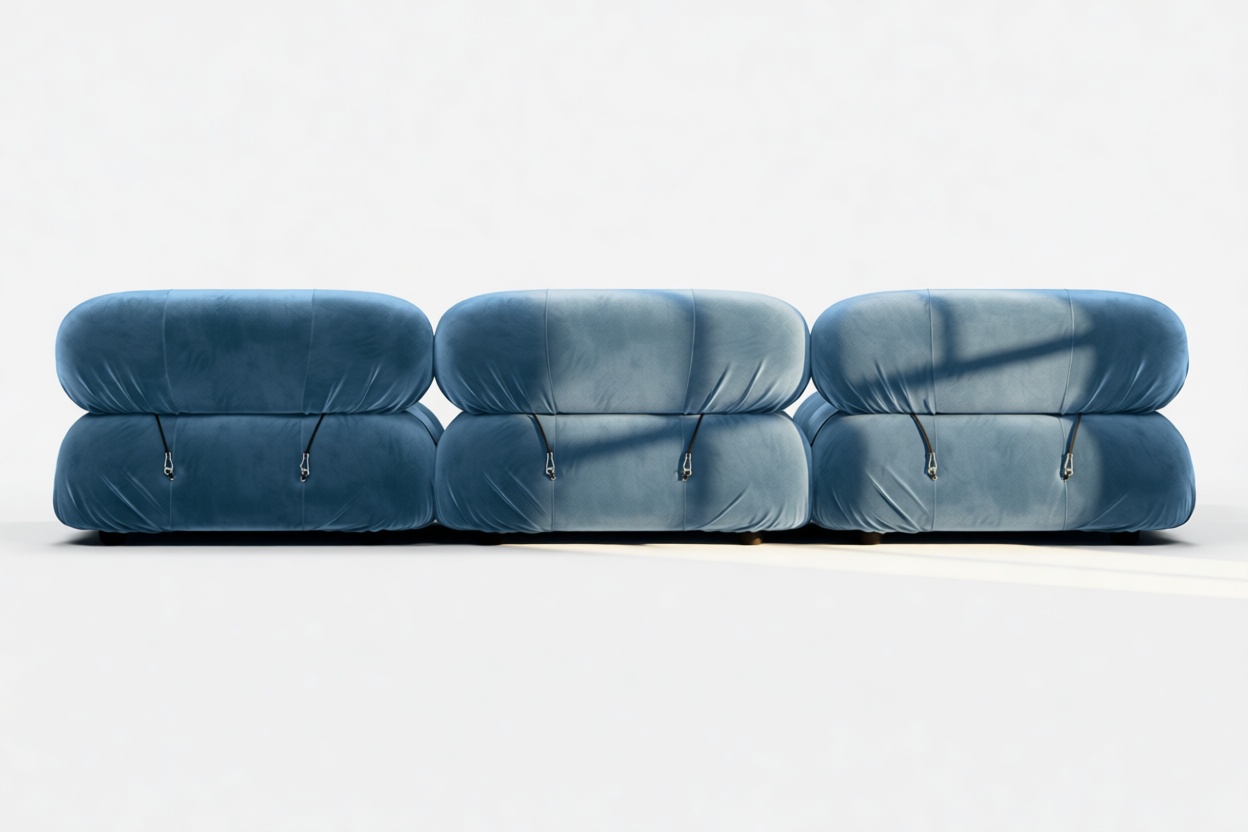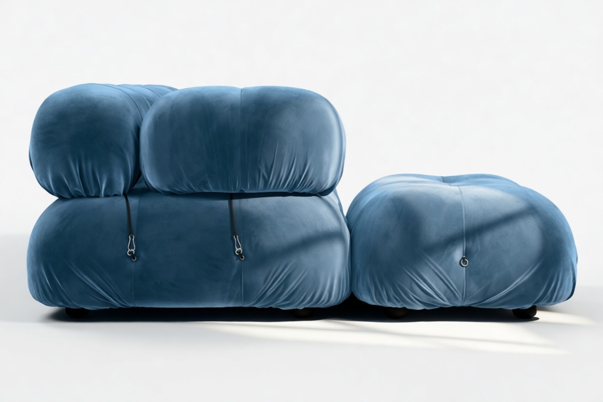 - Modular Instructions: Each section of the Mario Bellini Sofa is modular and is attached with string ties and carabiners. To assemble or rearrange your sofa, simply unclip the carabiners from one ring and attach to a corresponding ring on the module you wish to connect to.