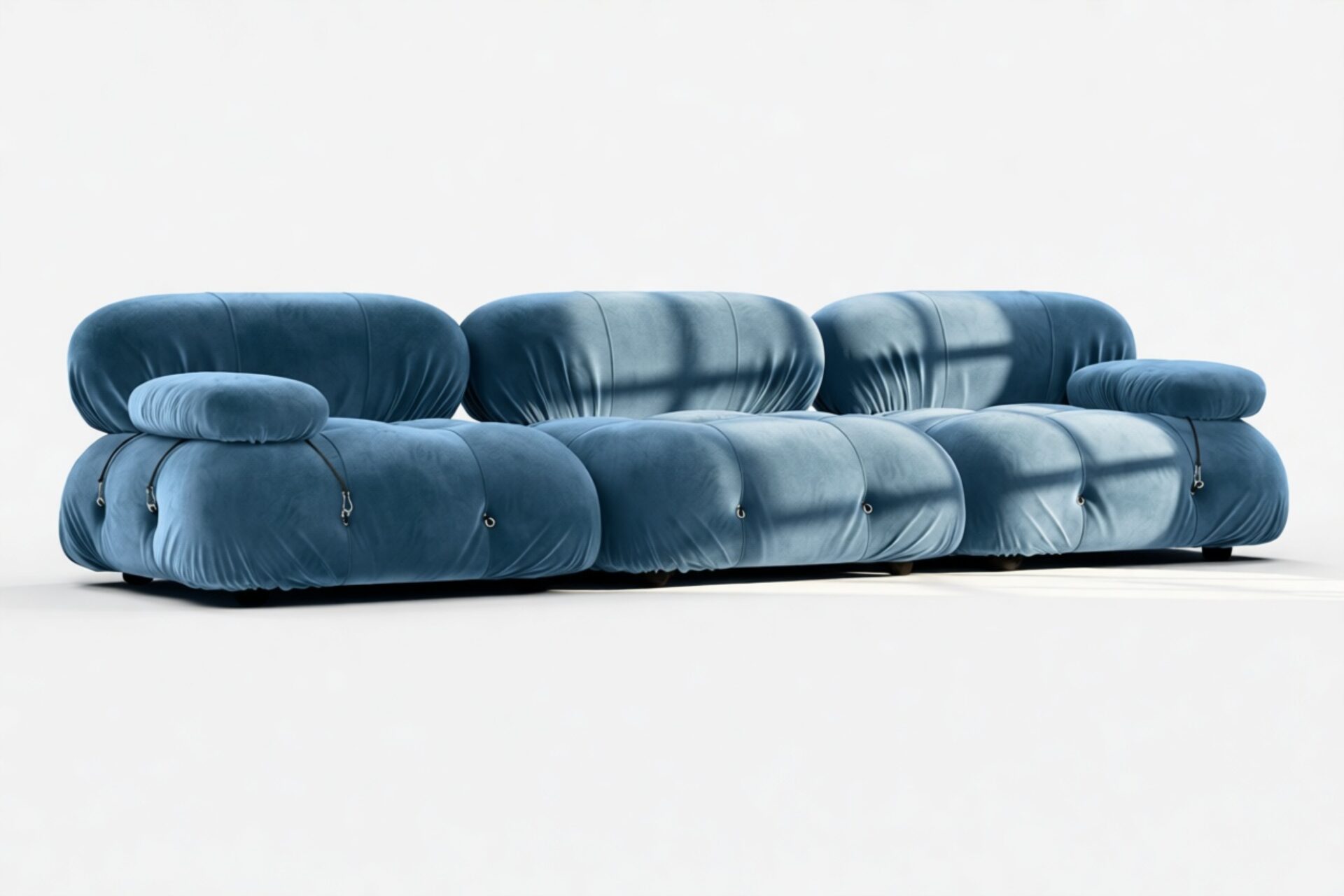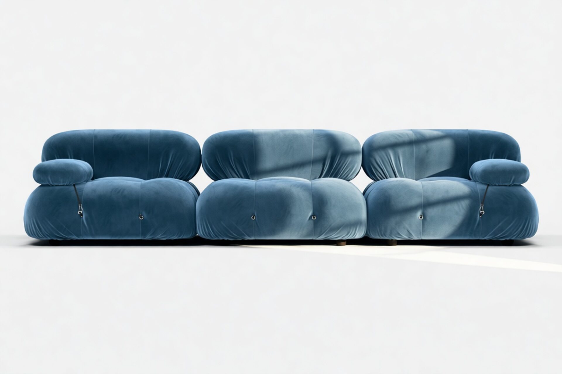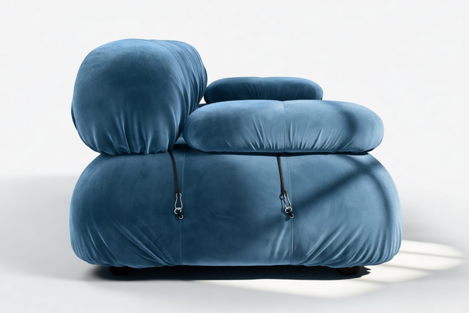 - Modular Instructions: Each section of the Mario Bellini Sofa is modular and is attached with string ties and carabiners. To assemble or rearrange your sofa, simply unclip the carabiners from one ring and attach to a corresponding ring on the module you wish to connect to.