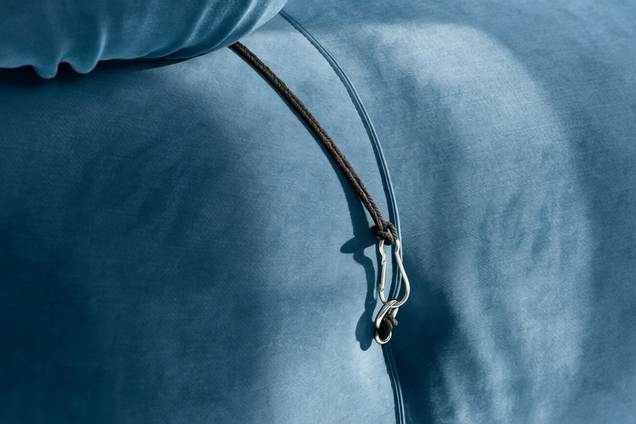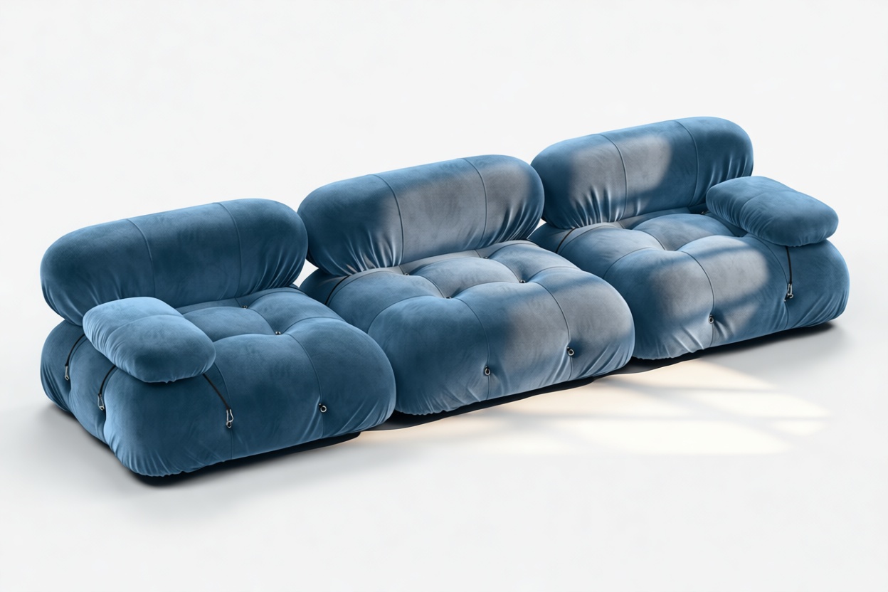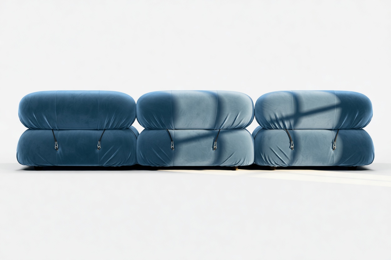 - Modular Instructions: Each section of the Mario Bellini Sofa is modular and is attached with string ties and carabiners. To assemble or rearrange your sofa, simply unclip the carabiners from one ring and attach to a corresponding ring on the module you wish to connect to.