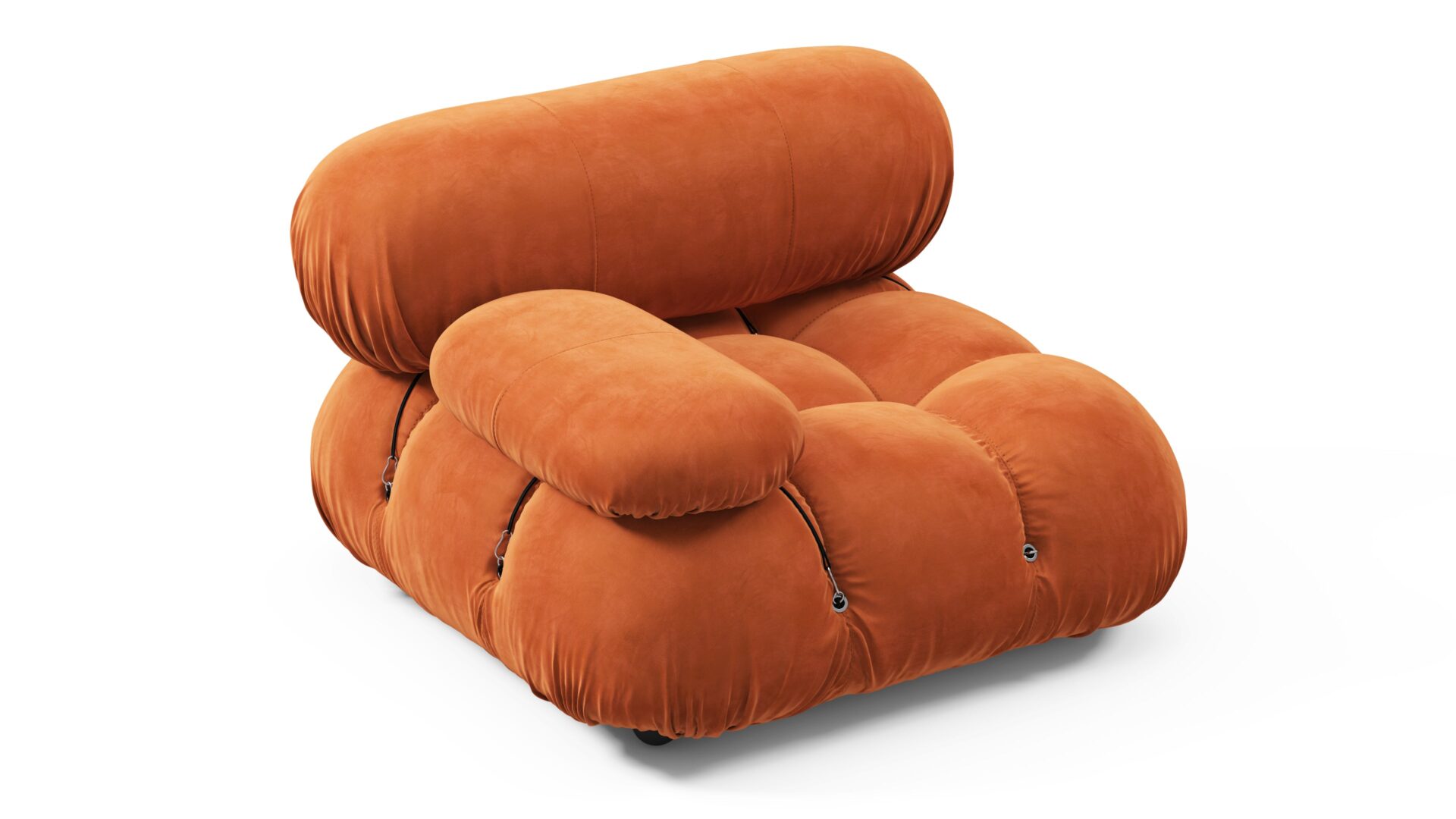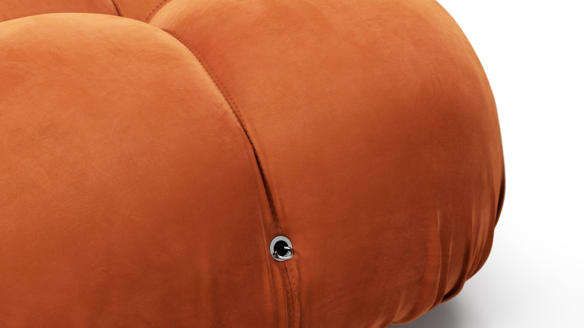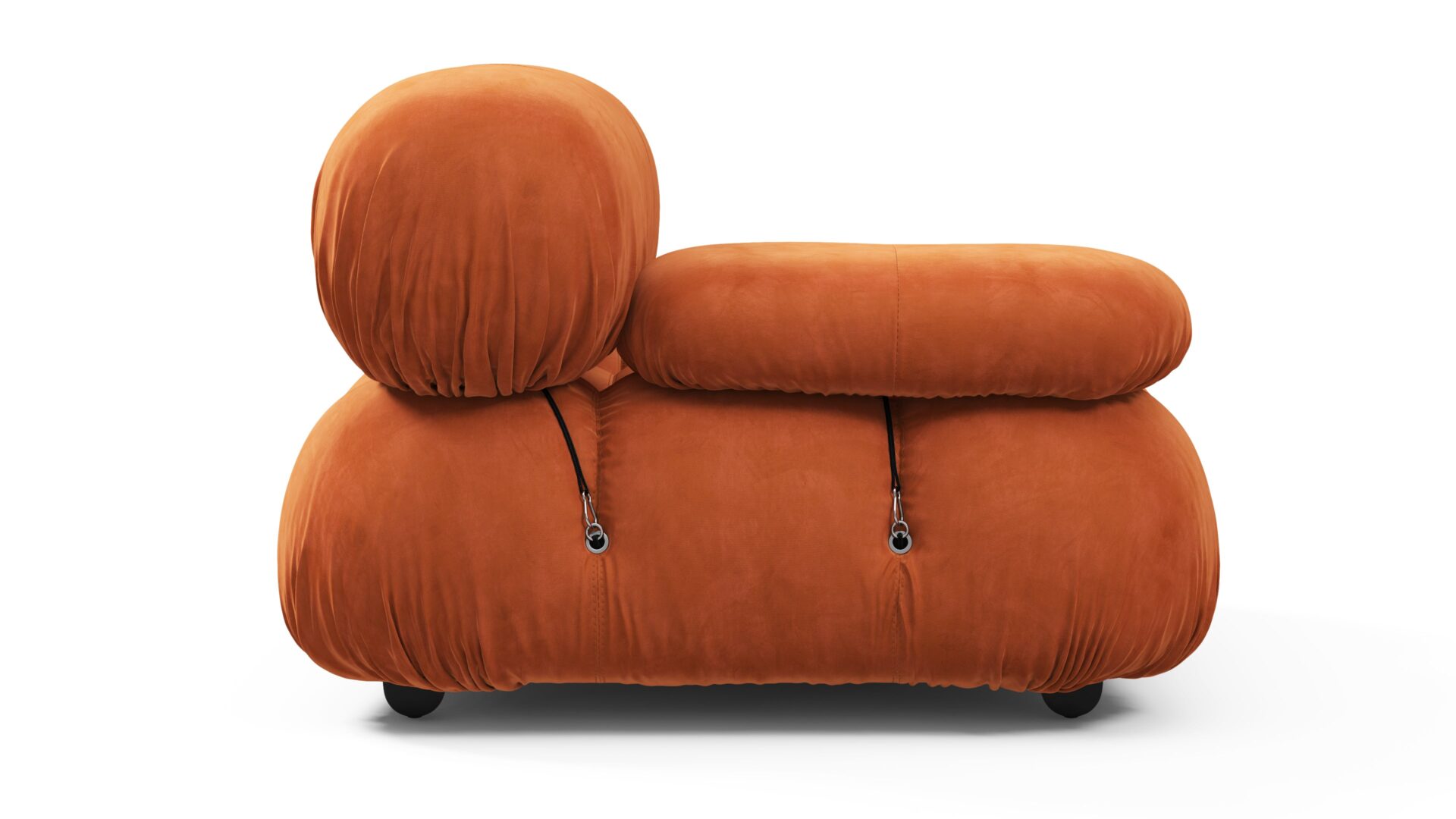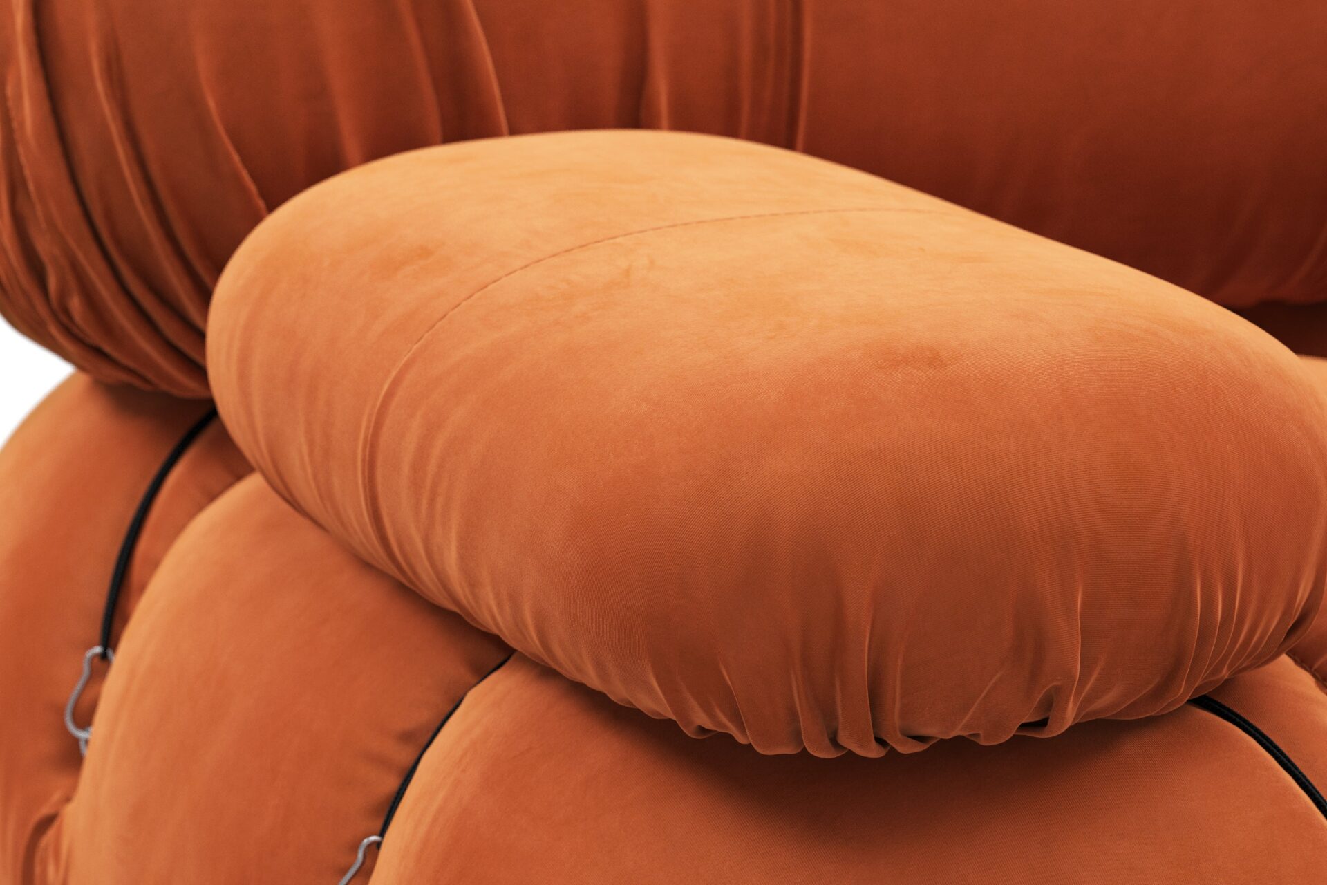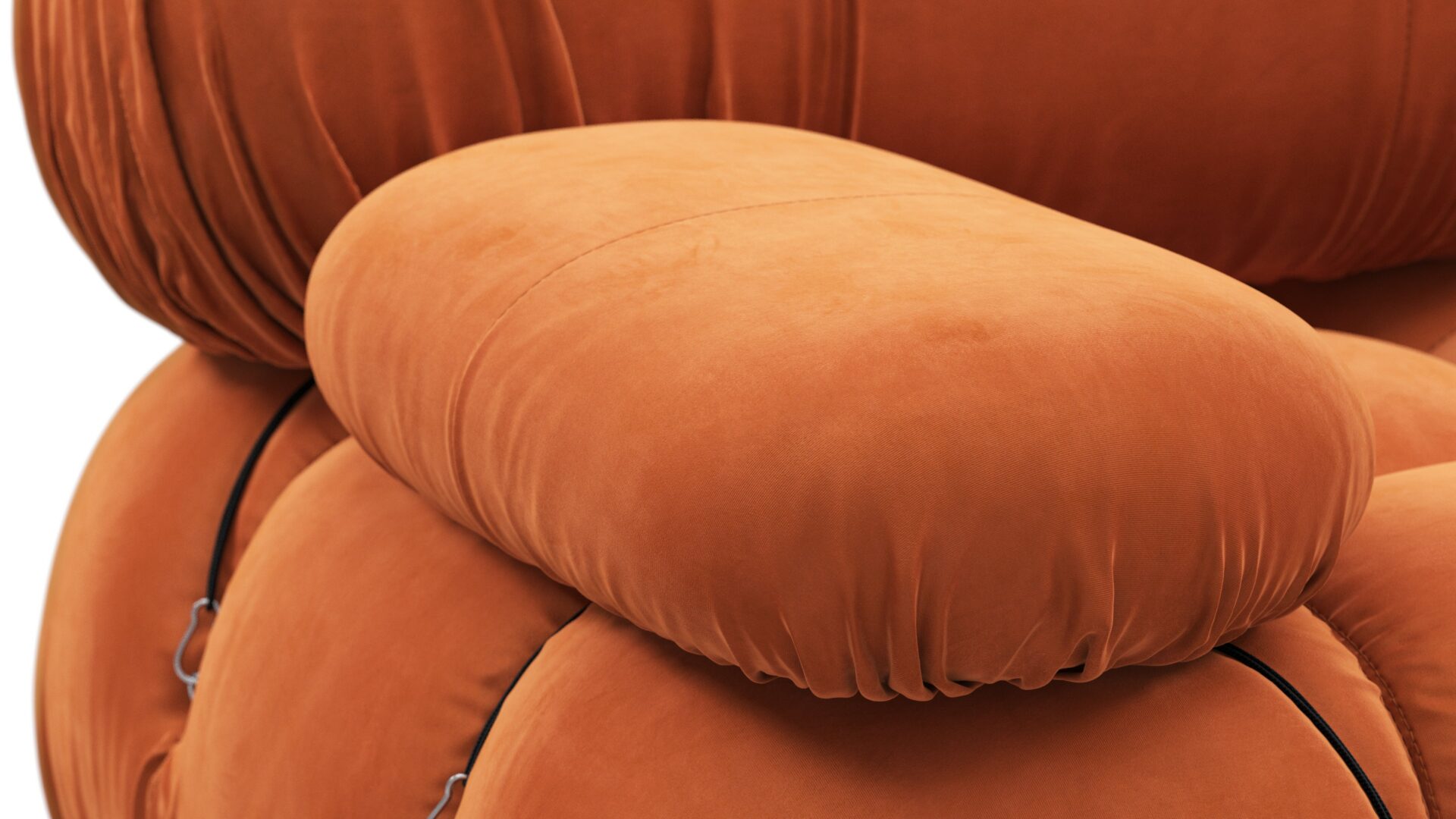 Step into retro vibes with the Bellini sectional sofa, a nod to 1970s style with a modern twist. This modular design, upholstered in luxurious apricot velvet, brings a sense of liberation to your space. With tie rods and rings for easy rearrangement, each inviting cushion, crafted with plush cold-pressed foam, invites you to relax in style.