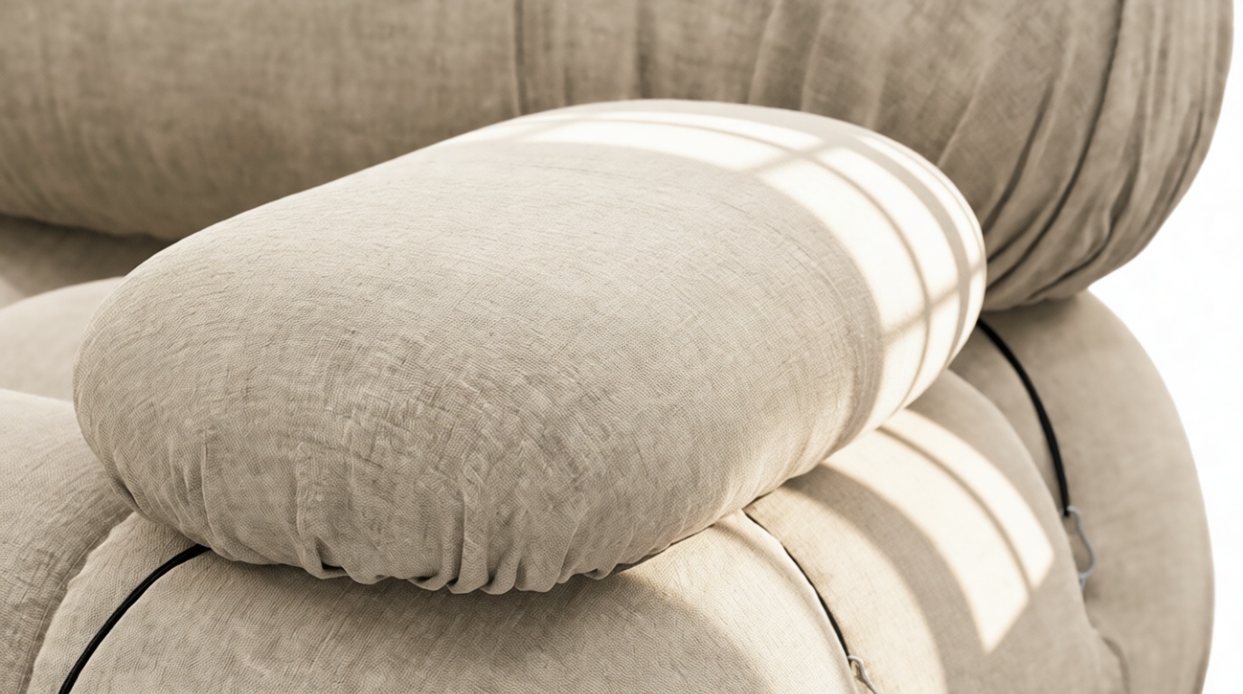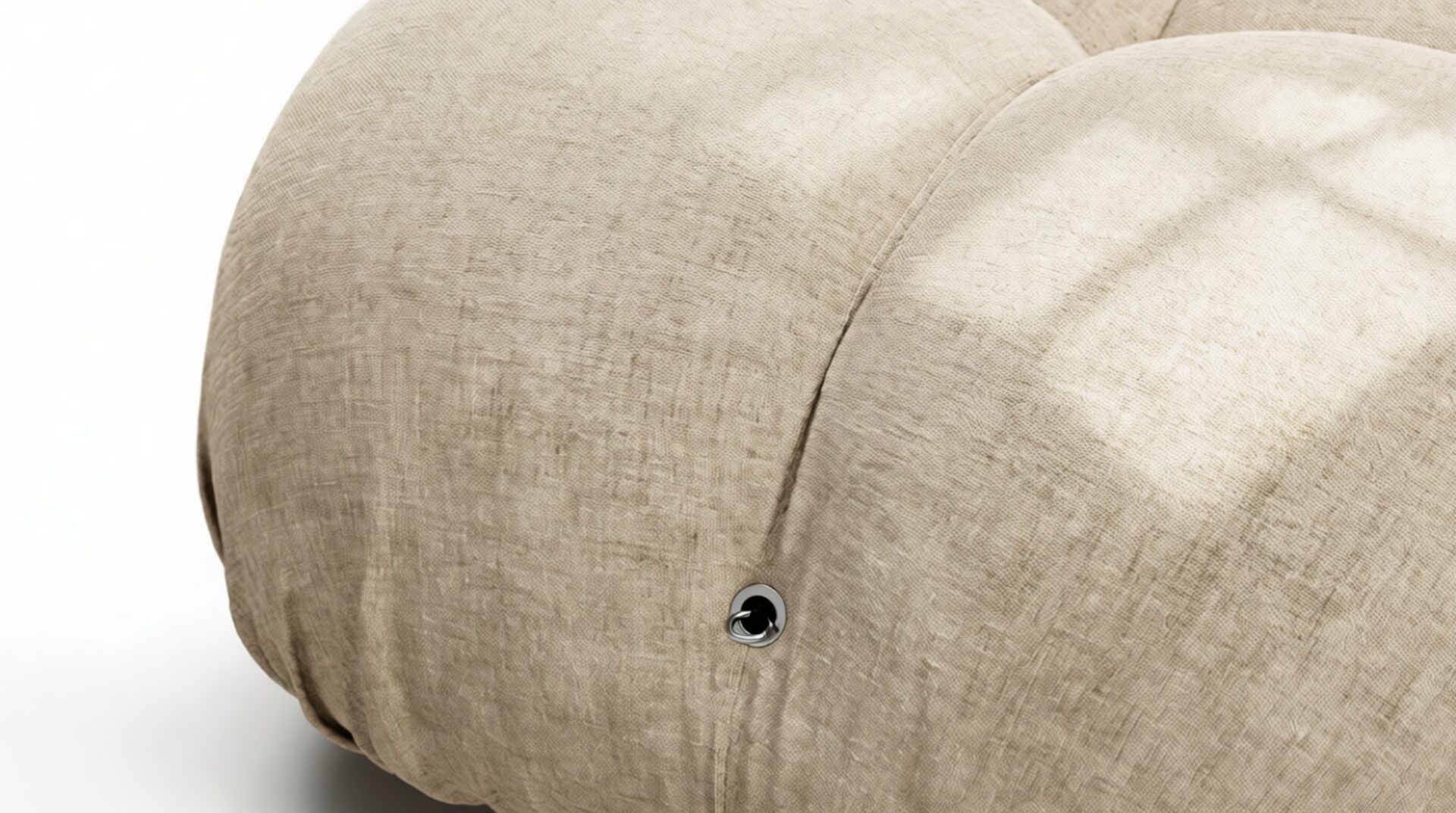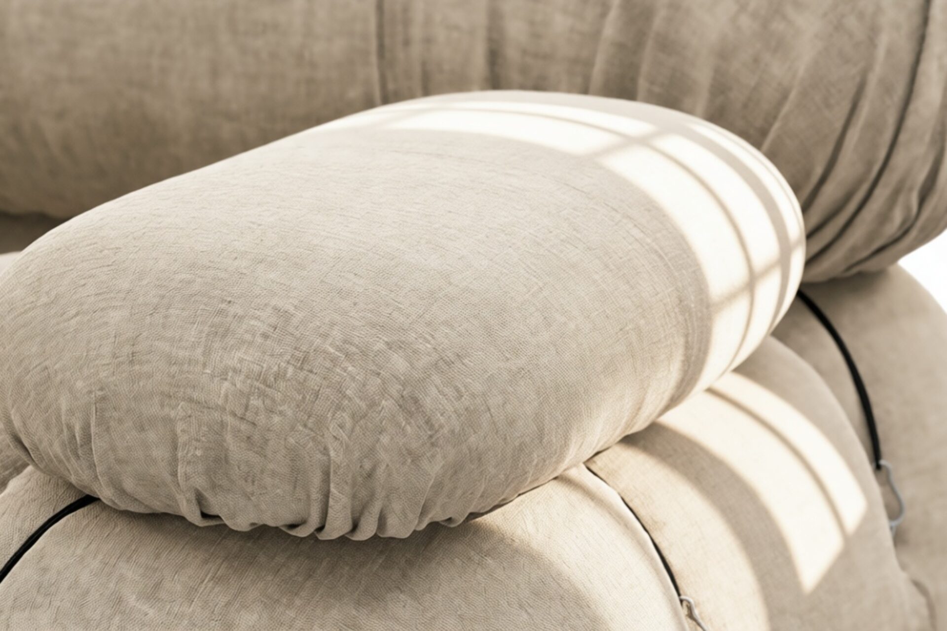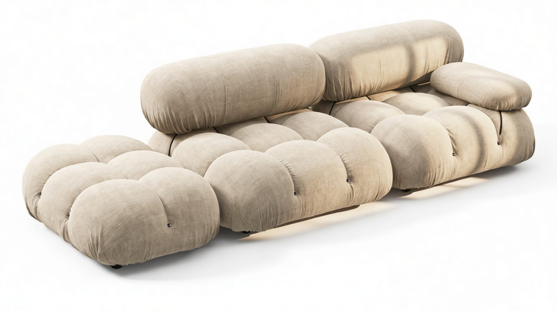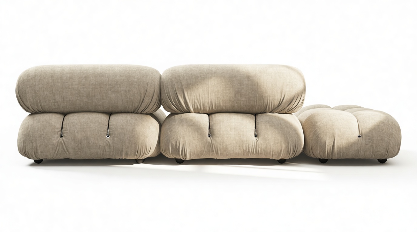 - Modular Instructions: Each section of the Mario Bellini Sofa is modular and is attached with string ties and carabiners. To assemble or rearrange your sofa, simply unclip the carabiners from one ring and attach to a corresponding ring on the module you wish to connect to.