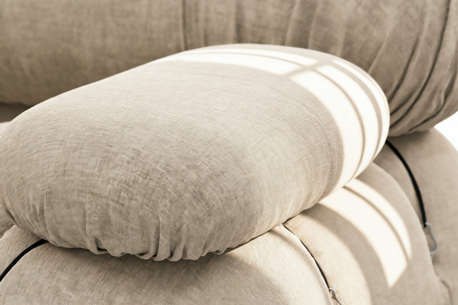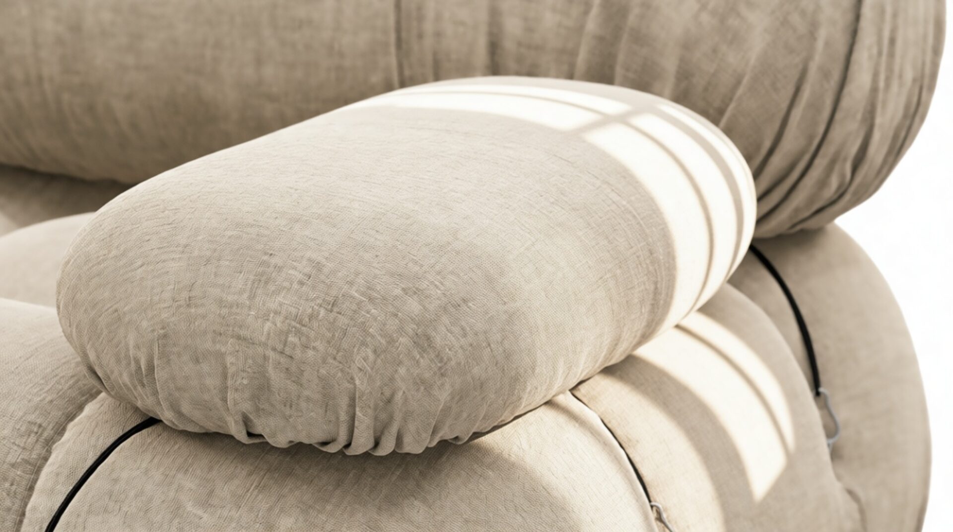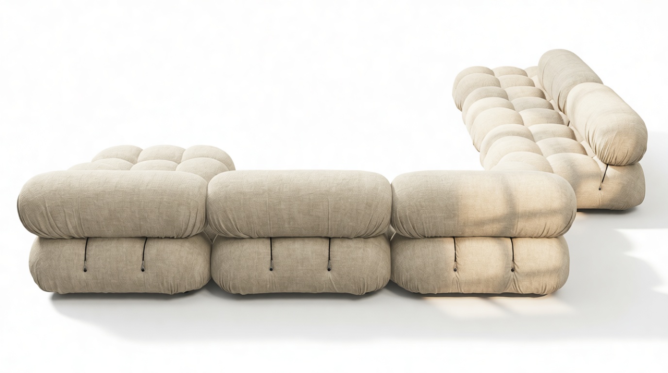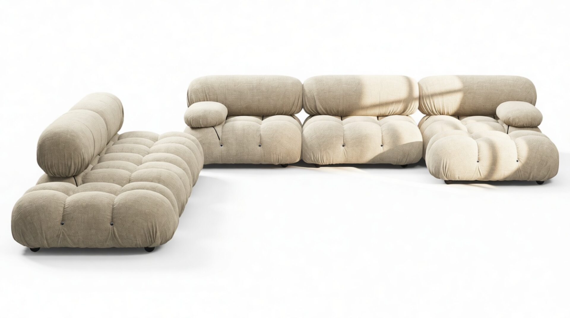 - Modular Instructions: Each section of the Mario Bellini Sofa is modular and is attached with string ties and carabiners. To assemble or rearrange your sofa, simply unclip the carabiners from one ring and attach to a corresponding ring on the module you wish to connect to.