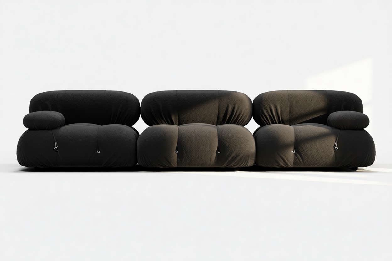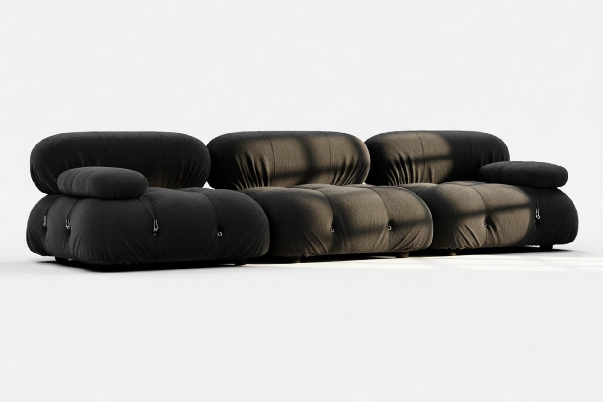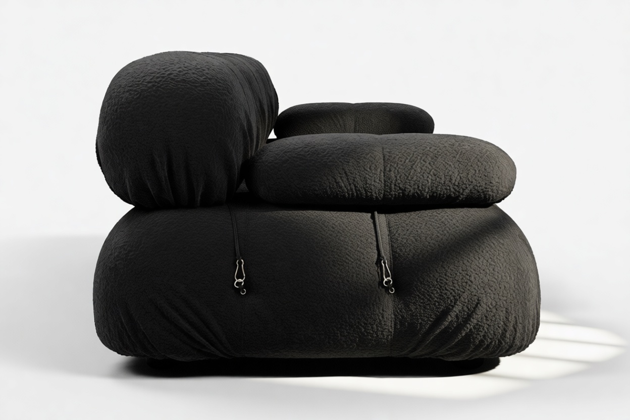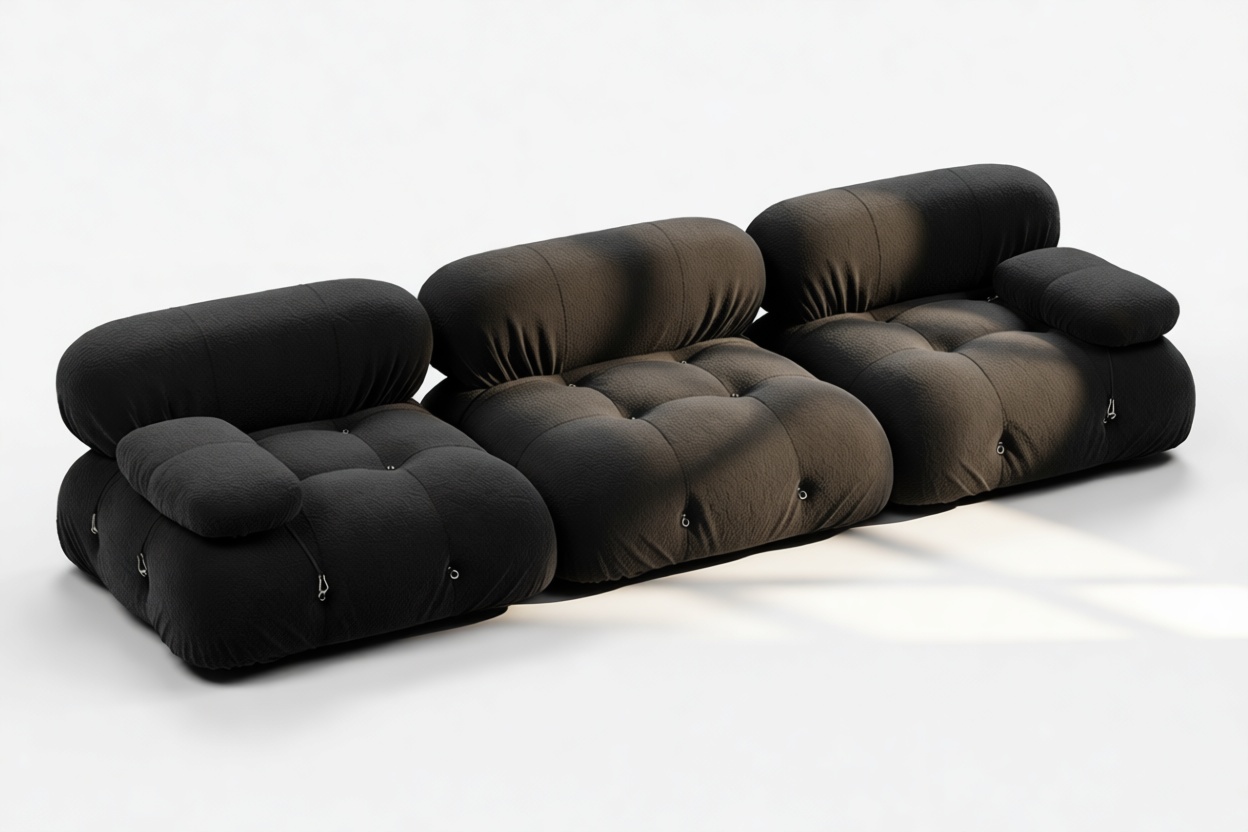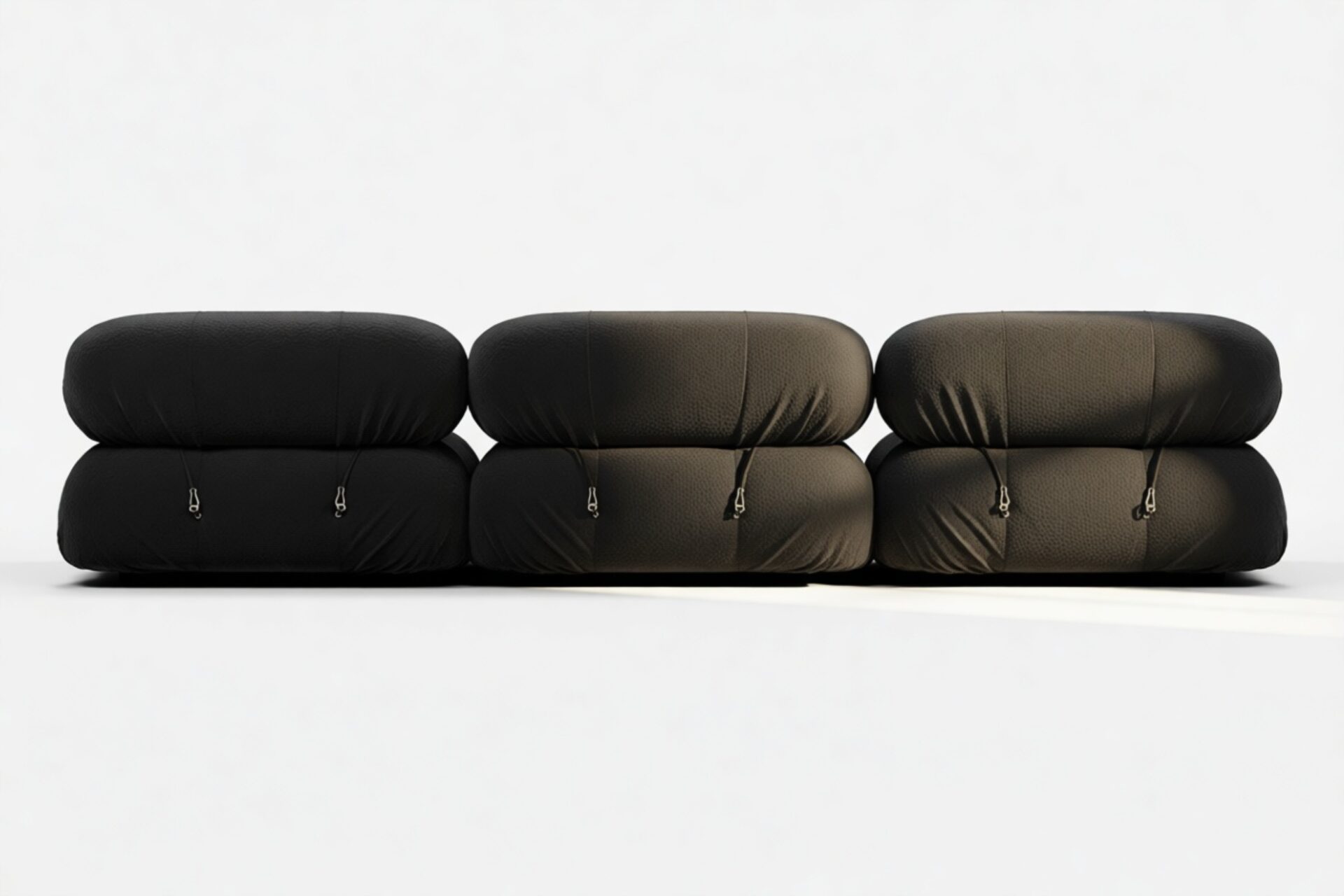 - Modular Instructions: Each section of the Mario Bellini Sofa is modular and is attached with string ties and carabiners. To assemble or rearrange your sofa, simply unclip the carabiners from one ring and attach to a corresponding ring on the module you wish to connect to.