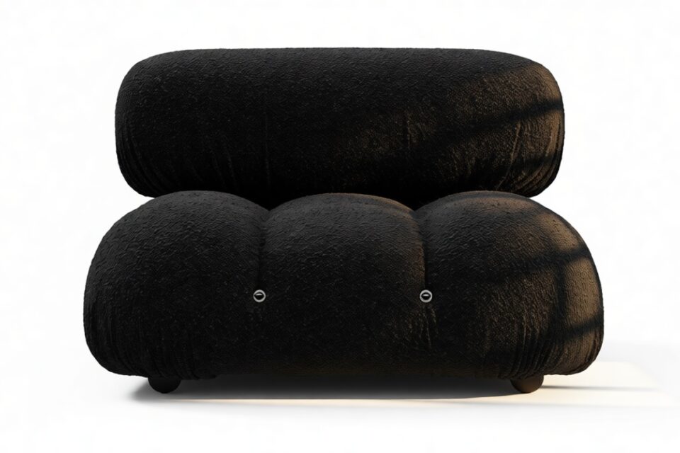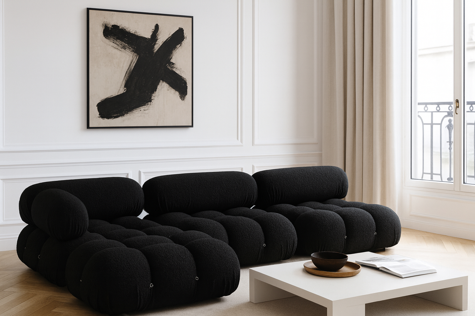 Step into the stylish nostalgia of the 1970s with the Bellini sectional sofa in Black Boucle. A tribute to carefree living, its modular design allows effortless customization for any room layout and mood. Crafted with a sturdy wooden frame and plush cold-pressed foam, the low-profile silhouette exudes relaxed luxury, inviting you to unwind in style.