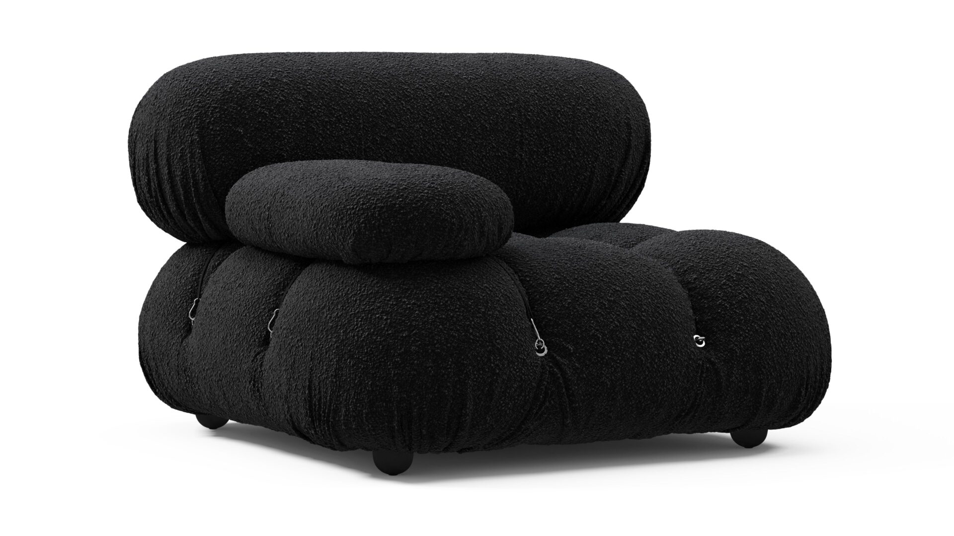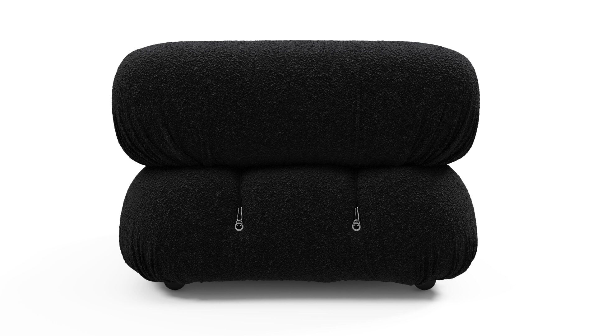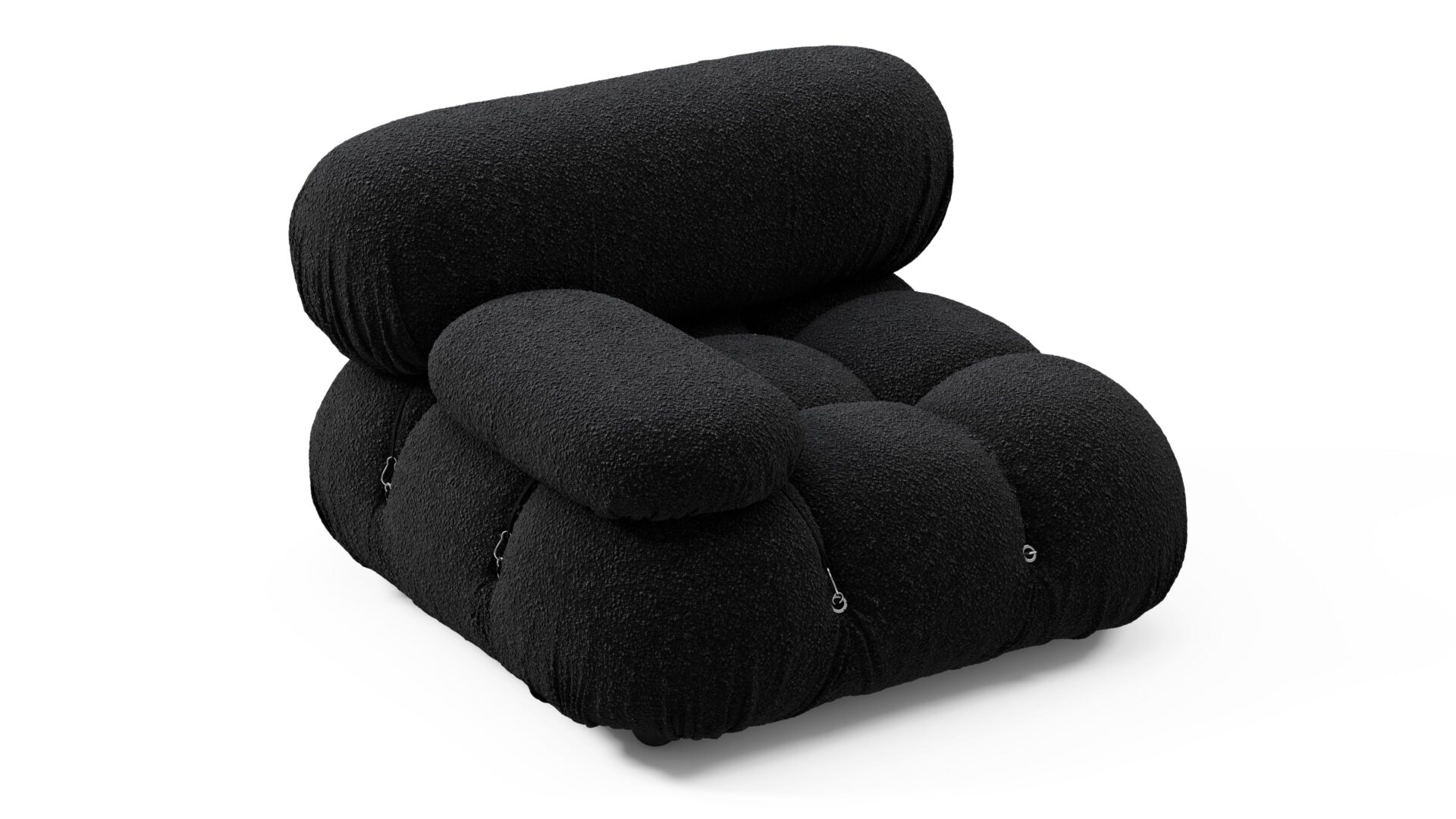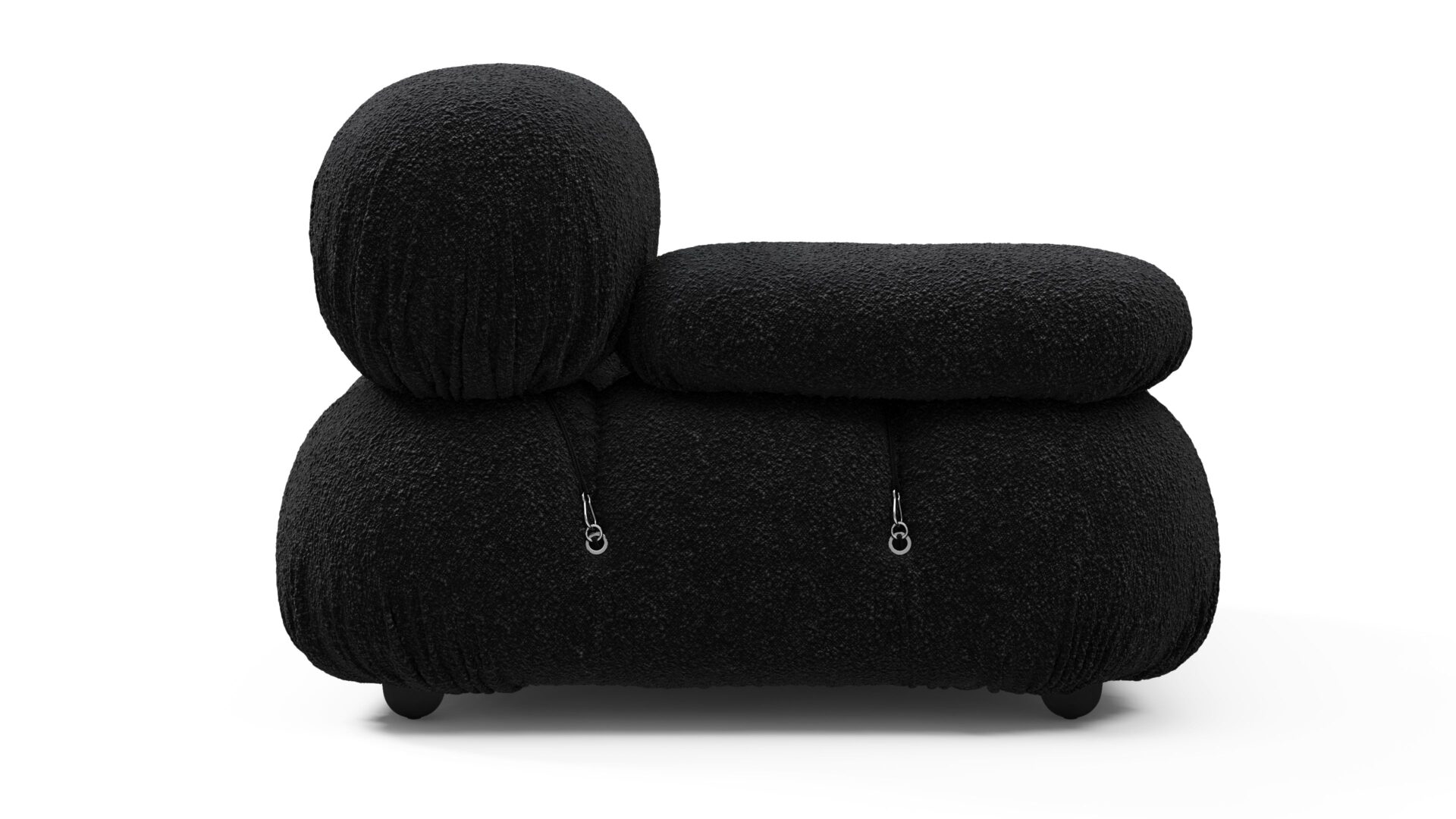 Introduce a touch of 1970s nostalgia with the Bellini sectional sofa, a modern interpretation of retro-cool vibes and freewheeling spirit. Breaking away from traditional bulkiness, the Bellini brings a sense of liberation to your space. Its modular construction allows effortless customization to suit your room layout, style, and mood without the hassle of a complete overhaul. Embraced by a new wave of furniture aficionados, the Bellini stands out for its freeing essence and versatility. With tie rods and rings, this sectional can be easily separated and reconfigured, empowering you to tailor your sofa to match your evolving tastes. Crafted with a sturdy wooden frame and plush cold-pressed foam wrapped in soft Black Boucle fabric, the Bellini's sleek profile embodies casual opulence, with each welcoming cushion tempting you to unwind in style. Lavish in comfort and style with the Bellini's sectional design, allowing you to create a bespoke sofa that perfectly complements your living space. The elegant contours of each meticulously crafted cushion offer sumptuous and snug seating, delivering unmatched style and comfort. Experience the inviting curves and ample proportions of the Bellini, enticing you to recline and relax. Its modular arrangement offers limitless configurations, enabling you to experiment with various setups. Blending relaxation and socializing, the Bellini seamlessly integrates into any environment, adapting to diverse needs. Cherished for its adaptability, the Bellini is a timeless favorite customizable to suit any setting and style, effortlessly transitioning from spacious and airy to cozy and intimate.
