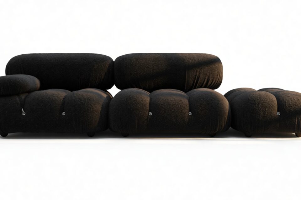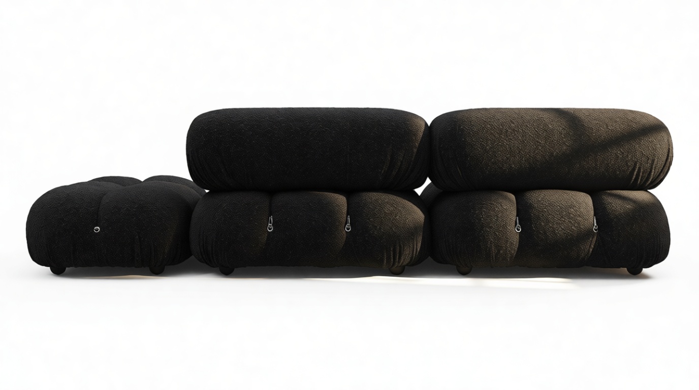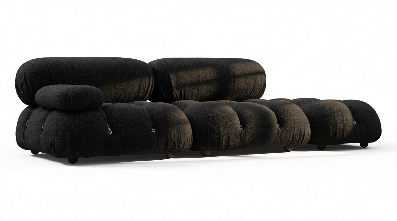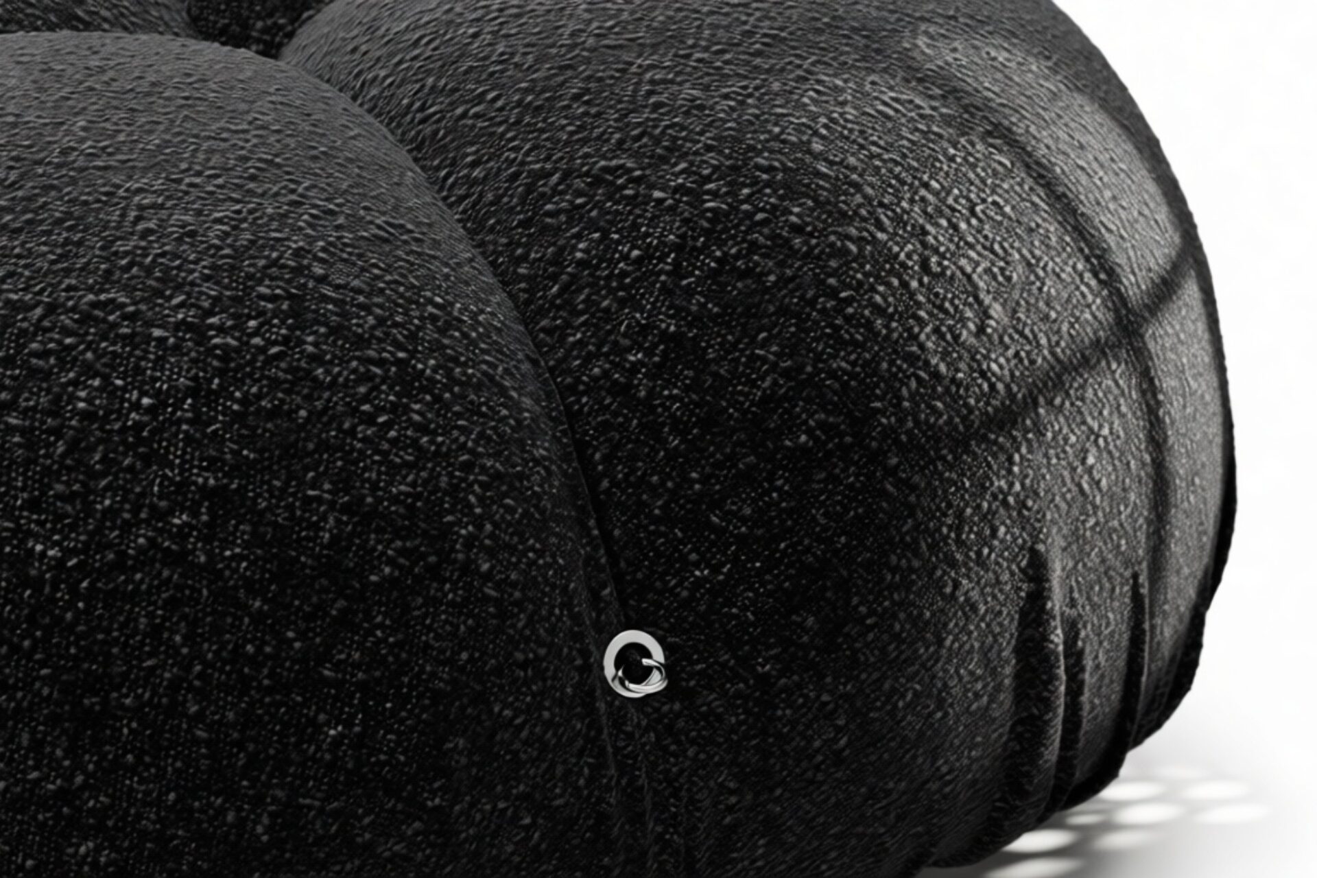 Step back in time to the groovy 1970s with the Bellini sectional sofa, celebrating an era of freedom and vibrant vibes. Defying traditional bulkiness, the Bellini offers a liberating touch to your living space with its modular design, allowing effortless customization to suit your room layout, style, and mood without a full revamp. Embraced by a new wave of furniture enthusiasts, the Bellini is adored for its liberating essence and versatility. With its tie rods and rings, this adaptable sectional can be effortlessly separated and rearranged to match your evolving tastes. Constructed with a sturdy wooden frame and luxurious cold-pressed foam wrapped in soft Black Boucle fabric, the Bellini's low-profile silhouette exudes a blend of comfort and luxury. Each inviting cushion beckons you to relax in style, promising a cozy seating experience. Experience the endless configurations offered by the Bellini's sectional layout, inviting you to unwind and enjoy its generous proportions. This versatile piece effortlessly fits into any setting, embodying a perfect blend of relaxation and socializing. Cherished for its adaptability, the Bellini remains a timeless favorite that seamlessly integrates into various spaces, from expansive and airy to cozy and snug, offering endless possibilities for customization.