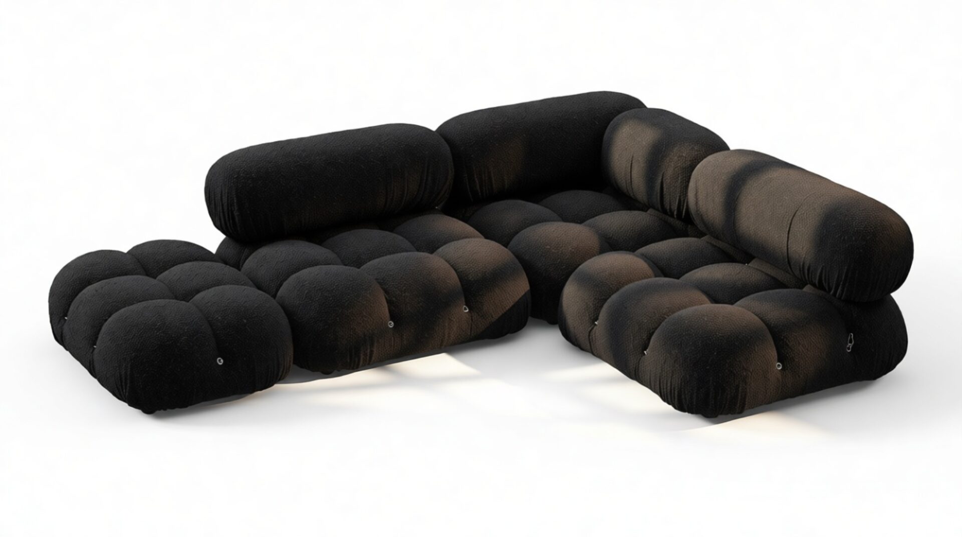 - Modular Instructions: Each section of the Mario Bellini Sofa is modular and is attached with string ties and carabiners. To assemble or rearrange your sofa, simply unclip the carabiners from one ring and attach to a corresponding ring on the module you wish to connect to.