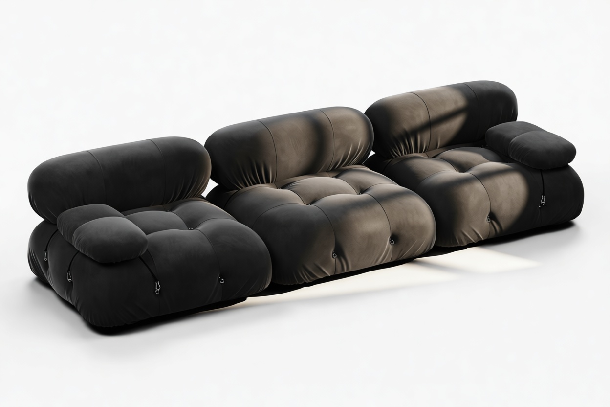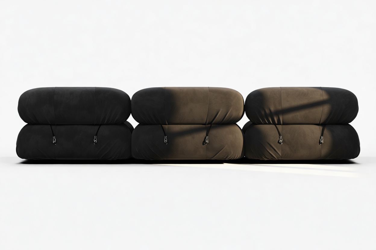 - Modular Instructions: Each section of the Mario Bellini Sofa is modular and is attached with string ties and carabiners. To assemble or rearrange your sofa, simply unclip the carabiners from one ring and attach to a corresponding ring on the module you wish to connect to.