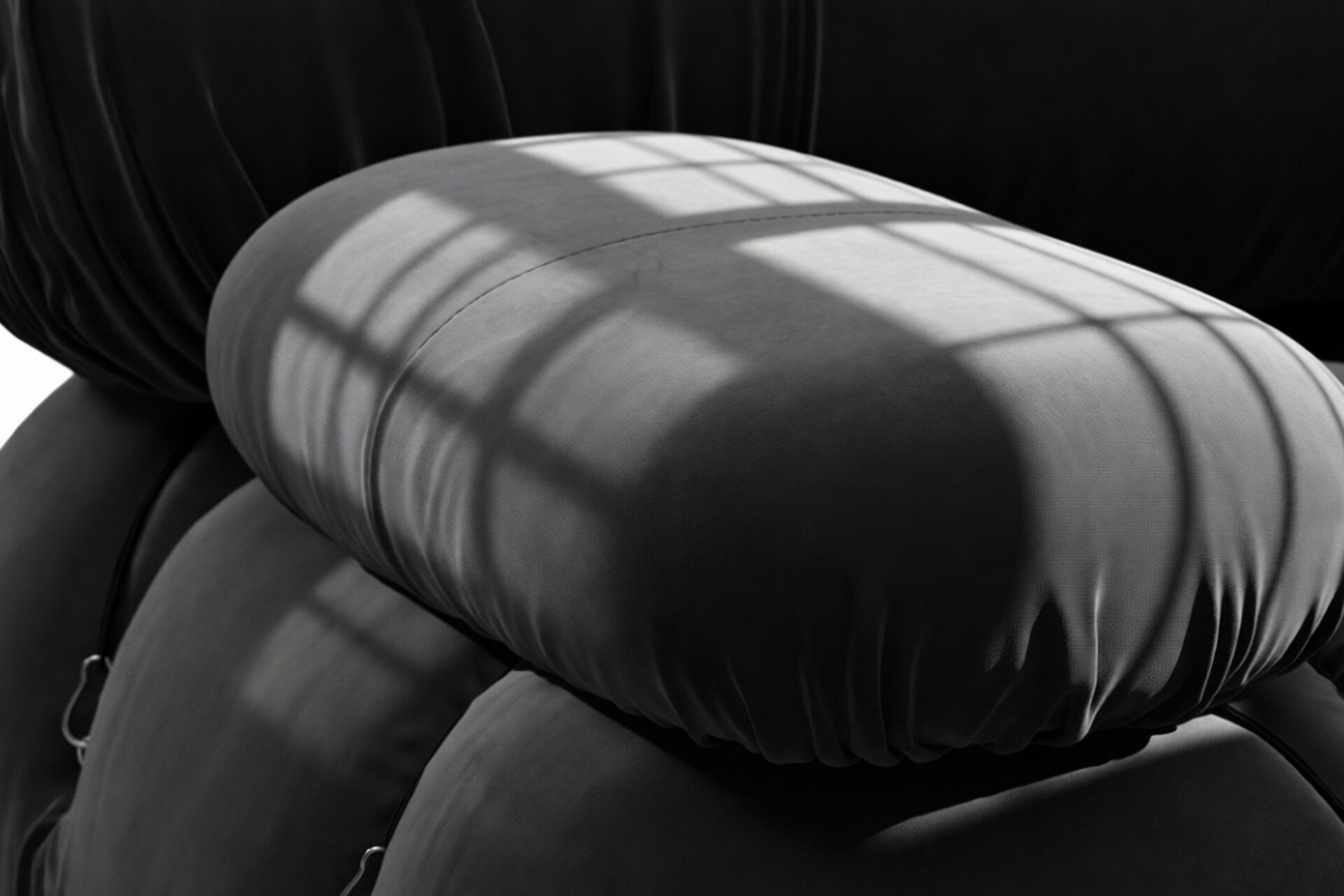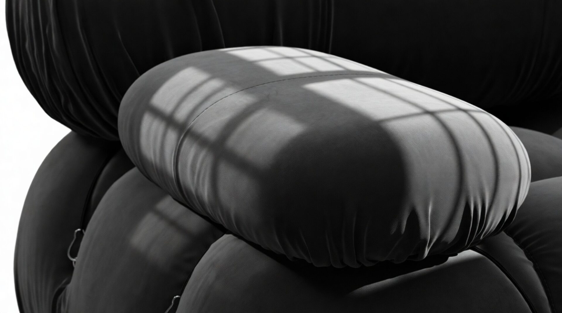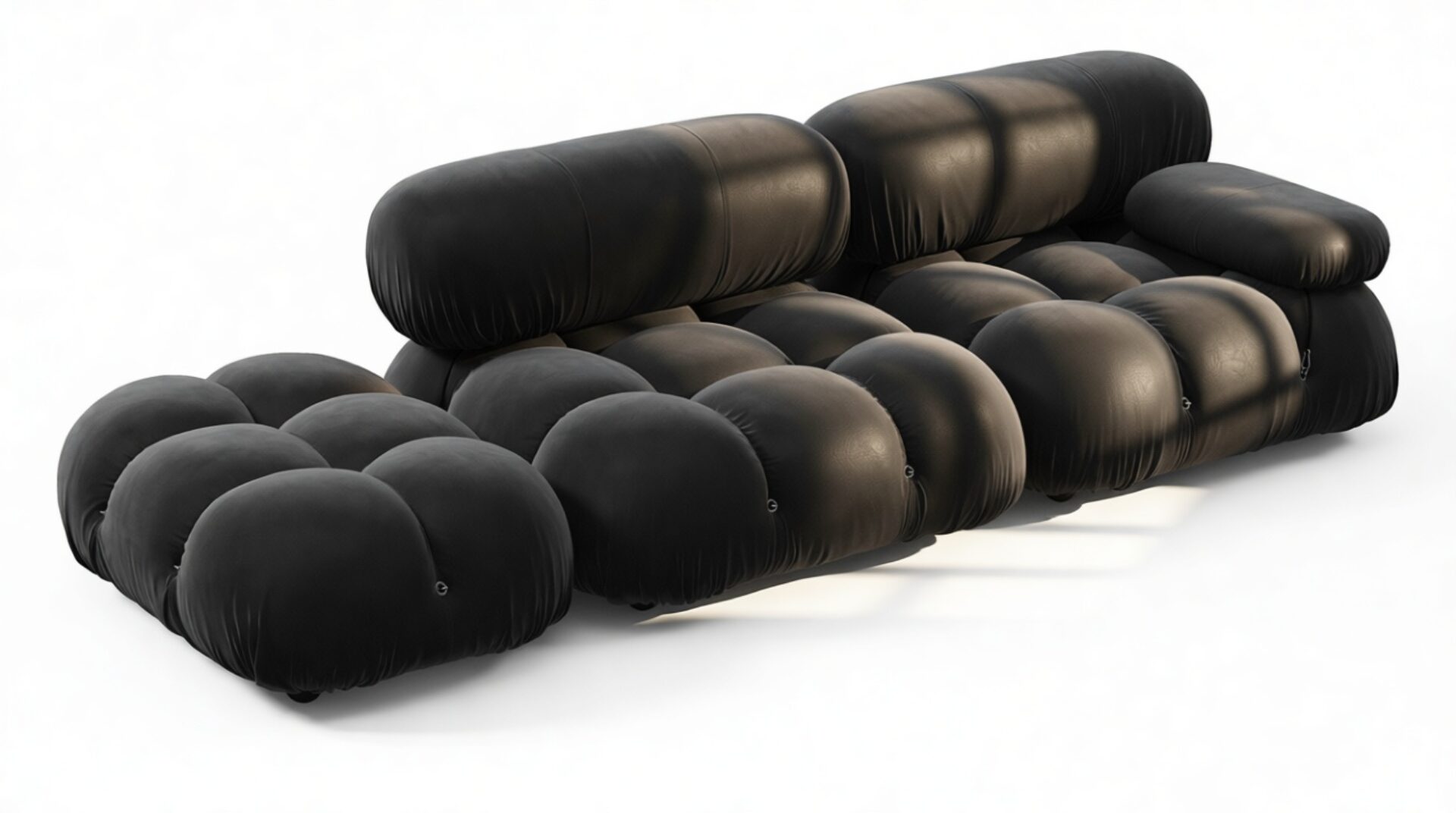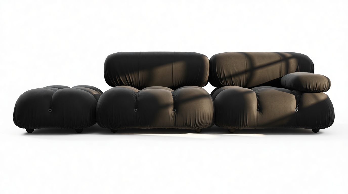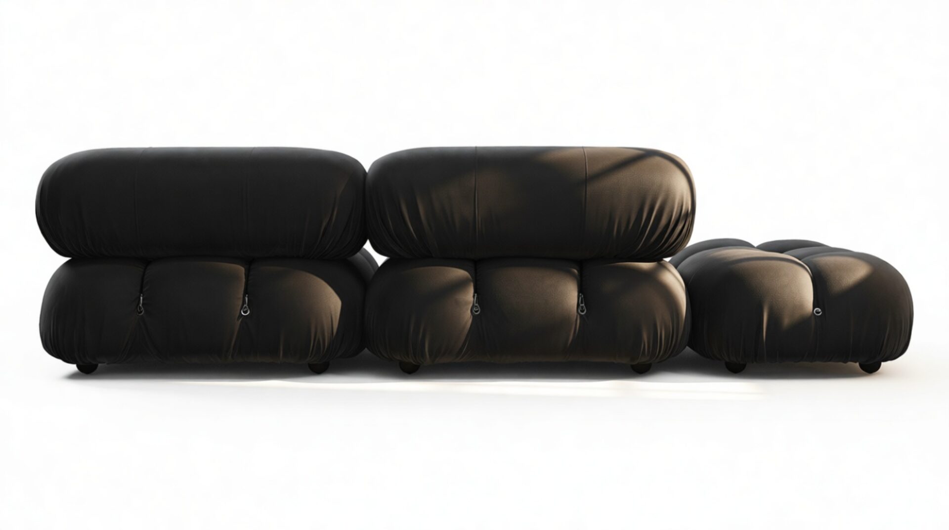 - Modular Instructions: Each section of the Mario Bellini Sofa is modular and is attached with string ties and carabiners. To assemble or rearrange your sofa, simply unclip the carabiners from one ring and attach to a corresponding ring on the module you wish to connect to.